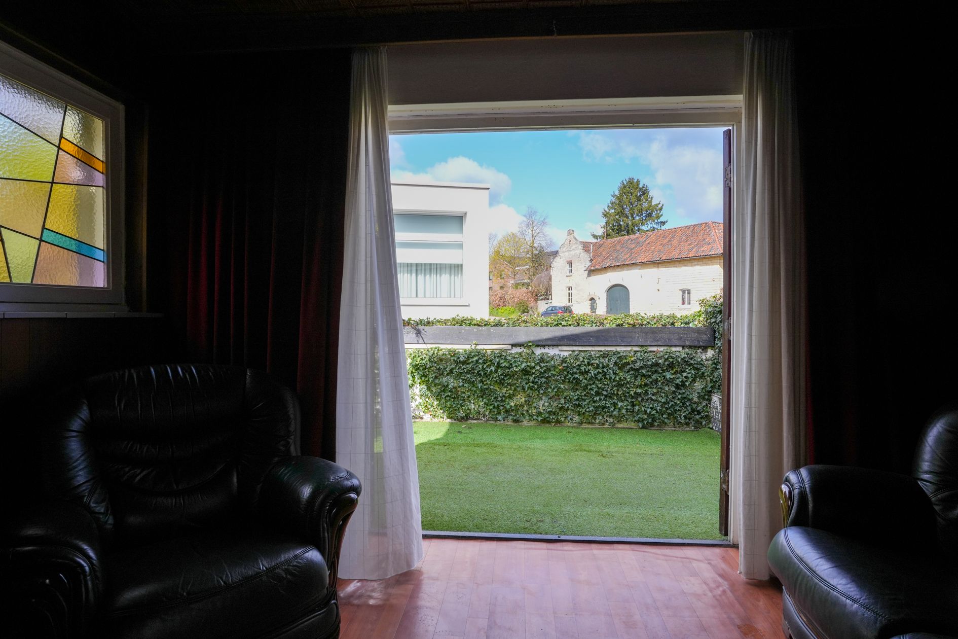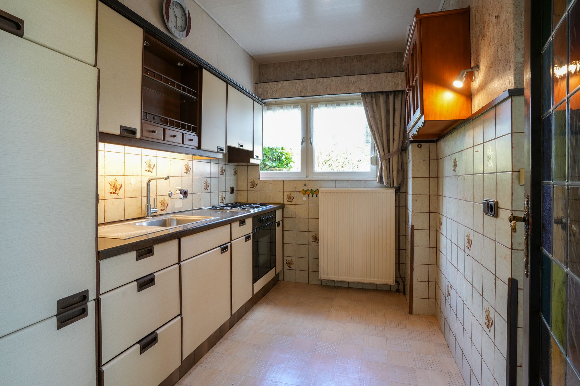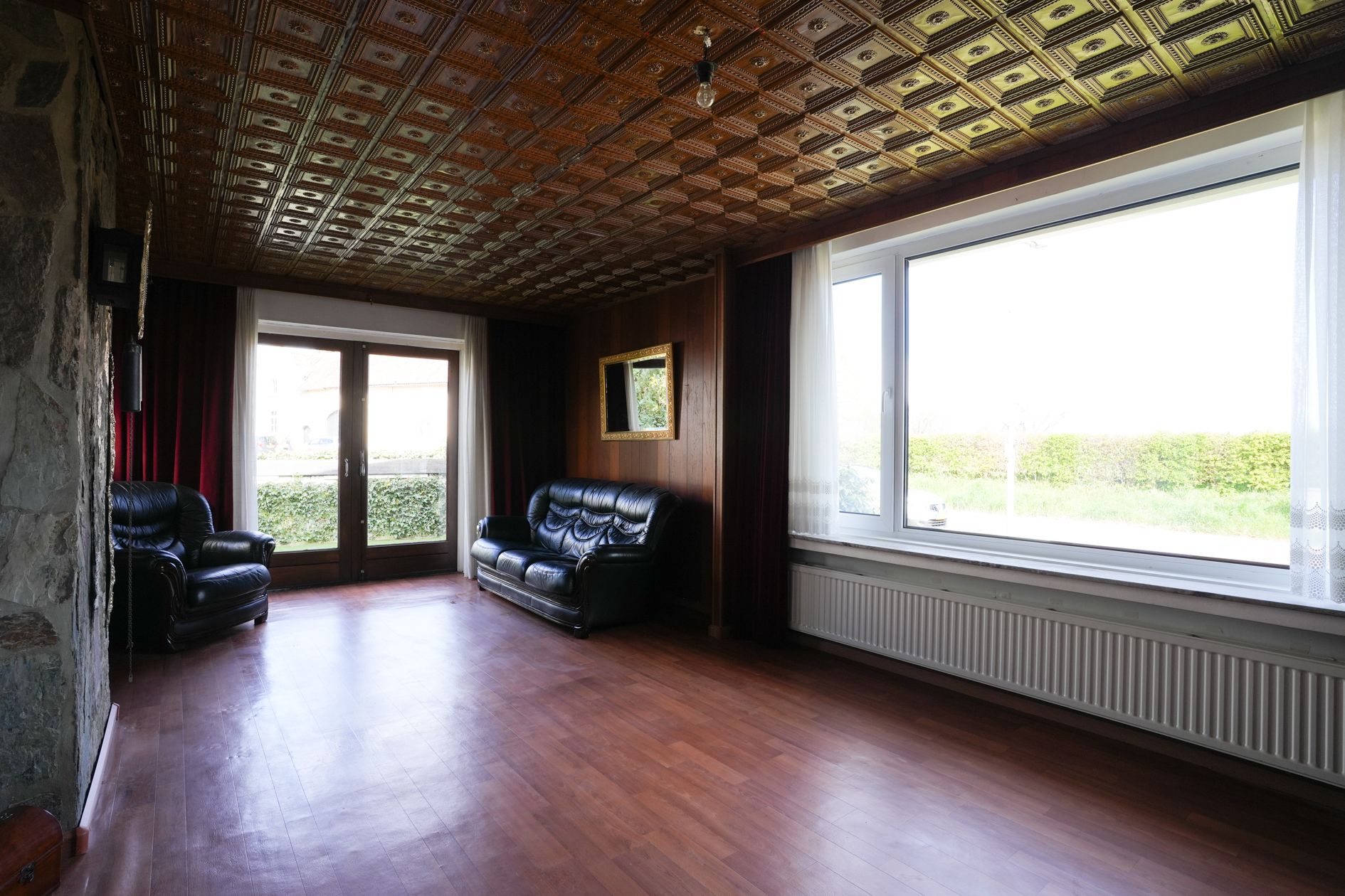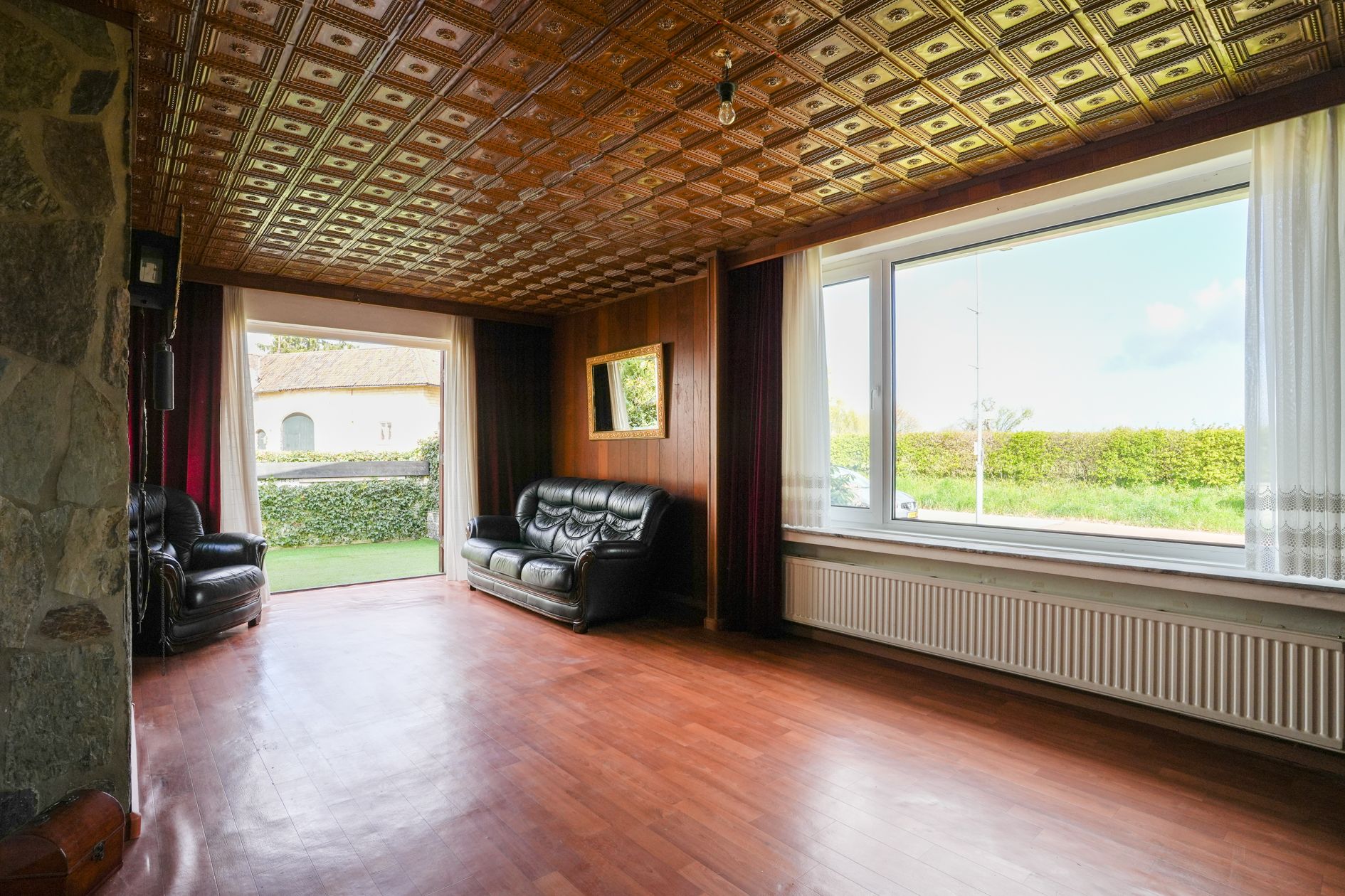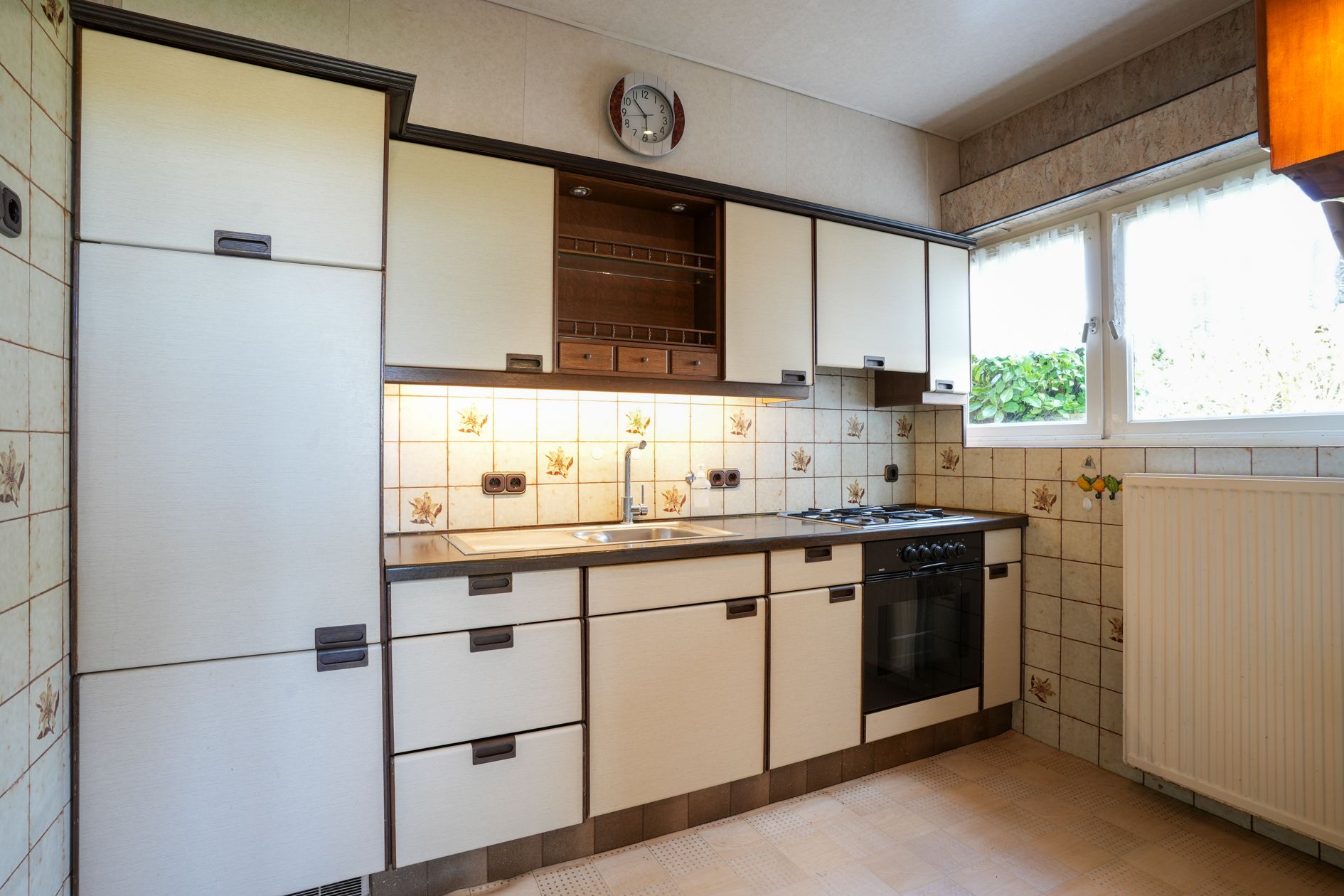 De gesloten keuken met inbouwapparatuur is eenvoudig uitgevoerd en grenst aan de woonkamer. De woonkamer is licht en ruim, mede dankzij het grote kozijn aan de voorgevel. Daarnaast zorgen de dubbele openslaande deuren in de rechter zijgevel voor extra daglicht en een directe toegang tot de tuin. Aan de rechterzijde van het perceel bevindt zich bovendien een handige poort voor een achterom.