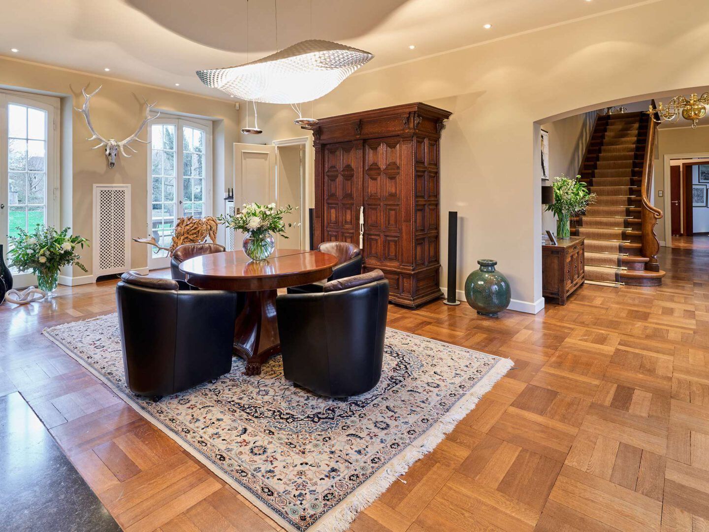 Binnen word je omarmd door een sfeer die zelden nog te vinden is. Hoge plafonds, royale vertrekken en zichtlijnen die telkens weer het omliggende landschap naar binnen halen. Het huis leeft met de seizoenen, van het zachte ochtendlicht dat door de ramen valt tot de lange avonden waarin het buiten langzaam tot rust komt.