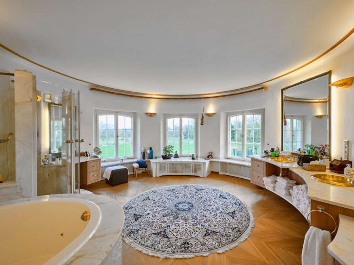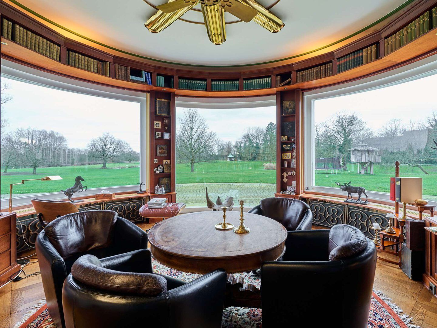 Rond vormgegeven bibliotheek met weids uitzicht over het landgoed