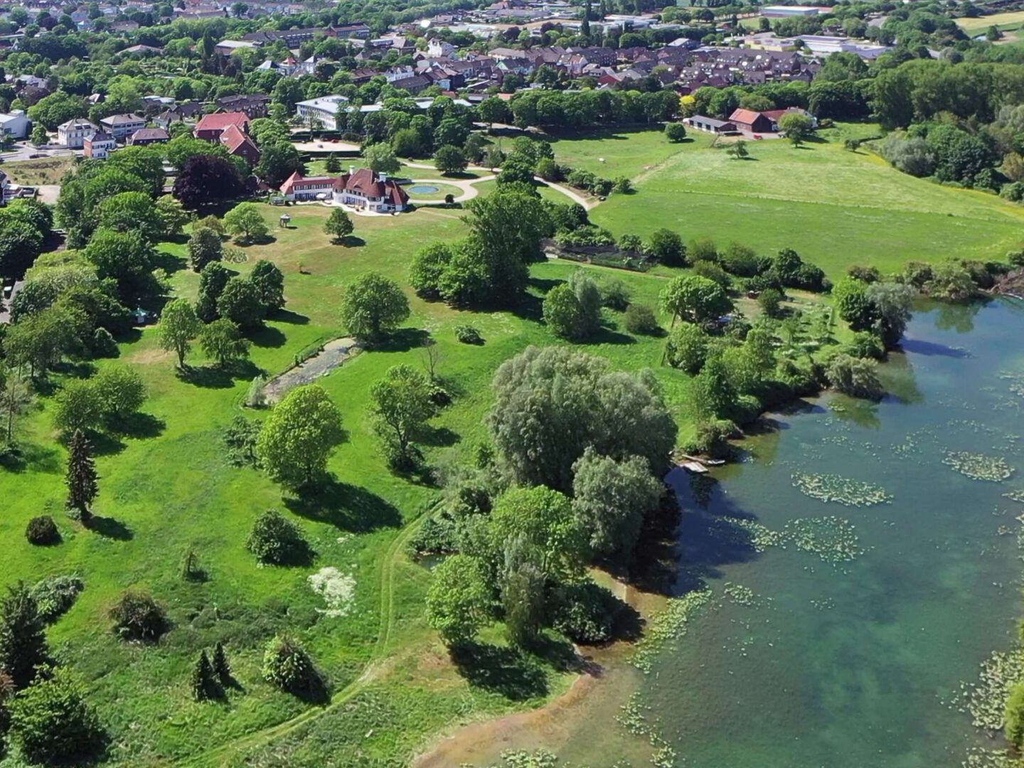 Sfeervolle waterpartijen en een grote natuurlijke zwemvijver, gevoed door een historische Rijnarm