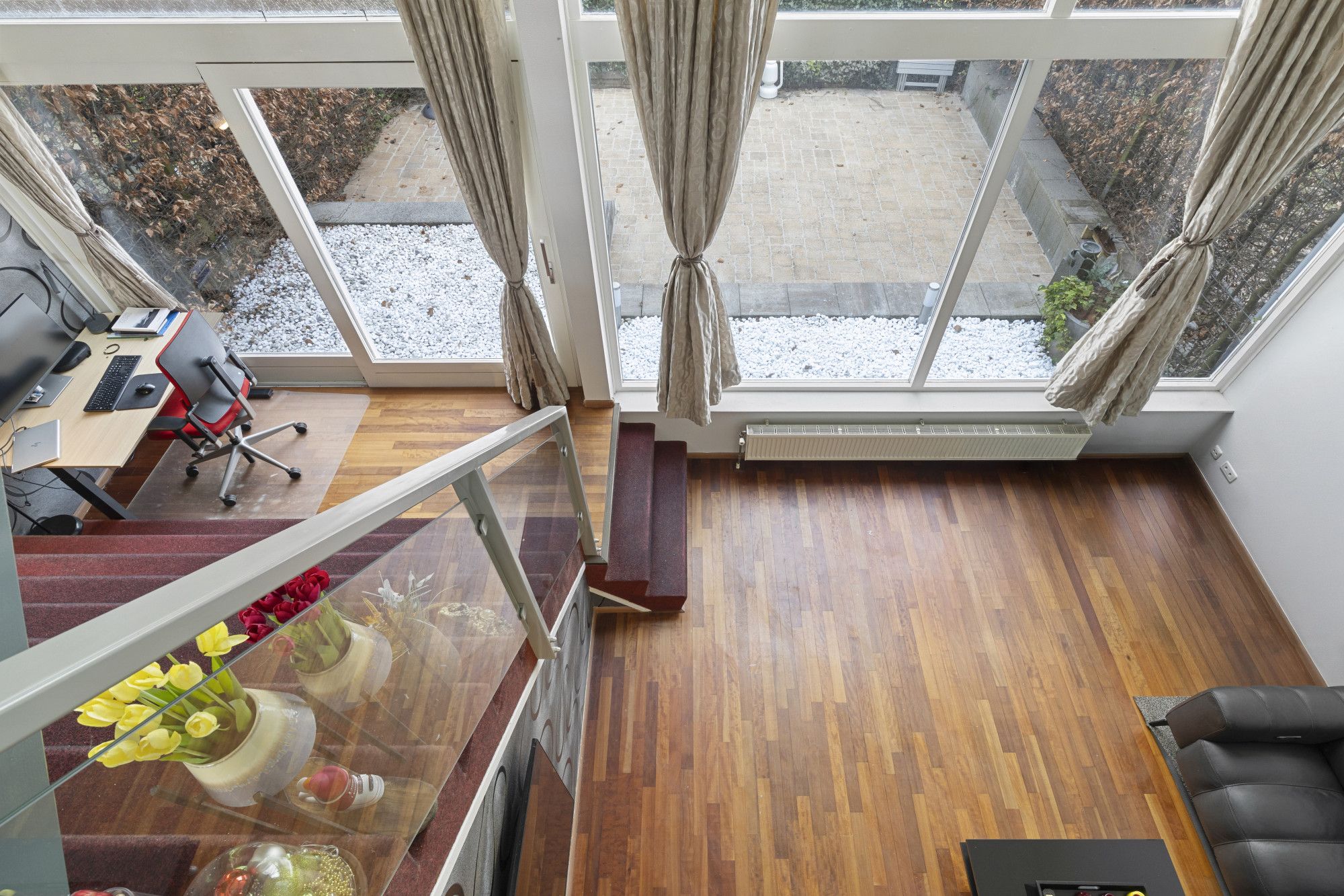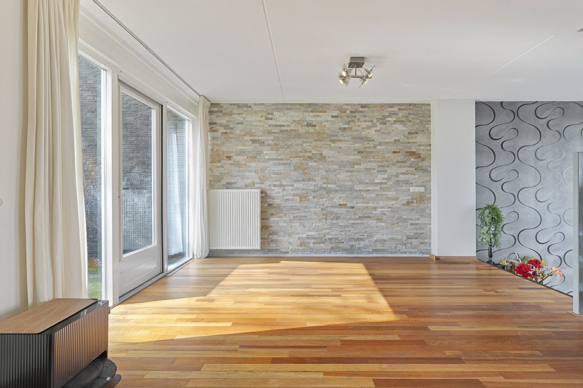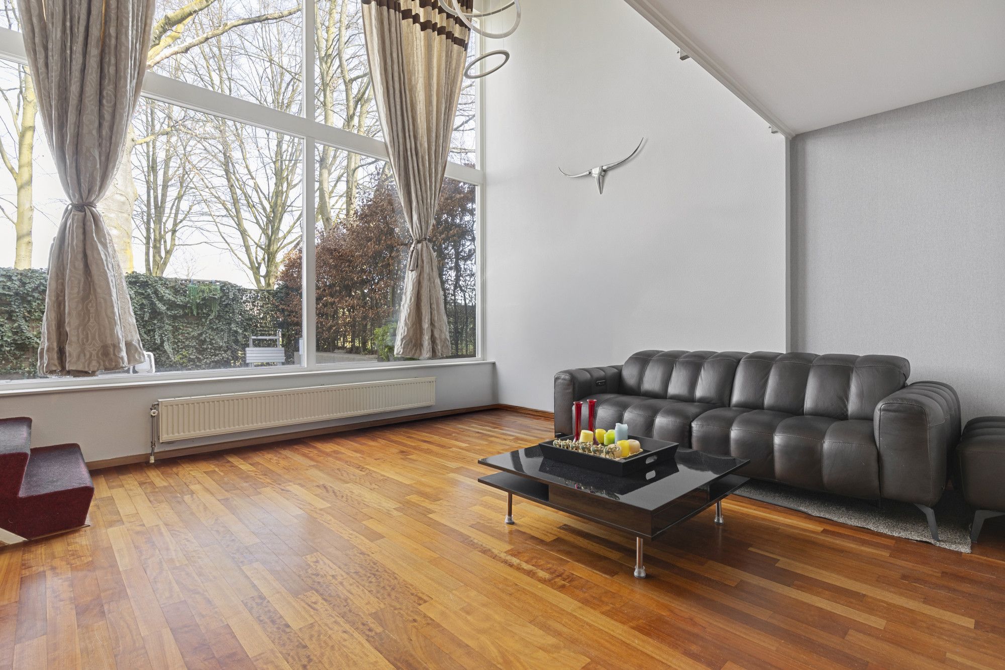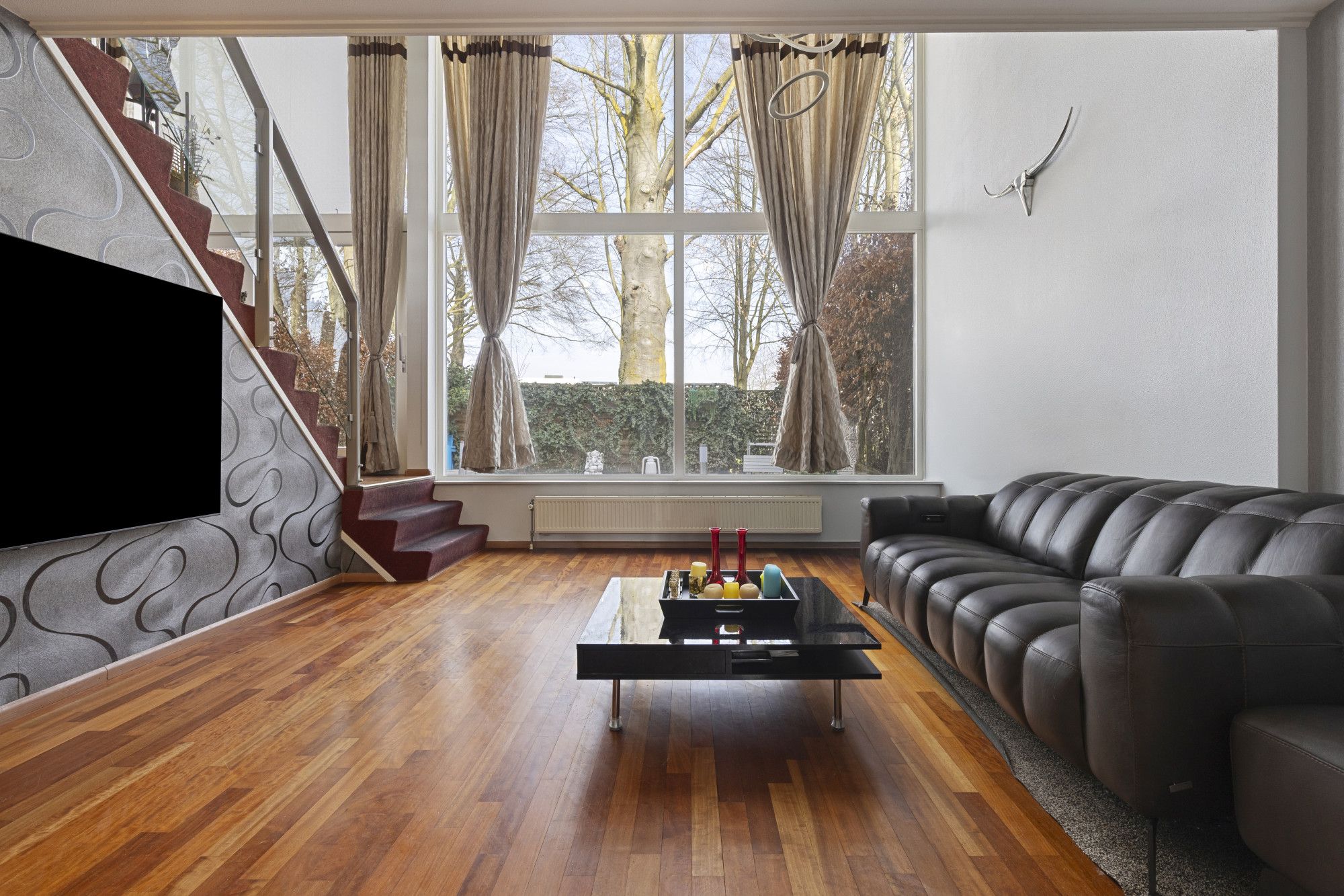 De lichte woonkamer met prachtige parketvloer is een heerlijke plek om te ontspannen. De kamerhoge glaswand met schuifpui zorgt voor een waanzinnig tuincontact en een zee aan licht.