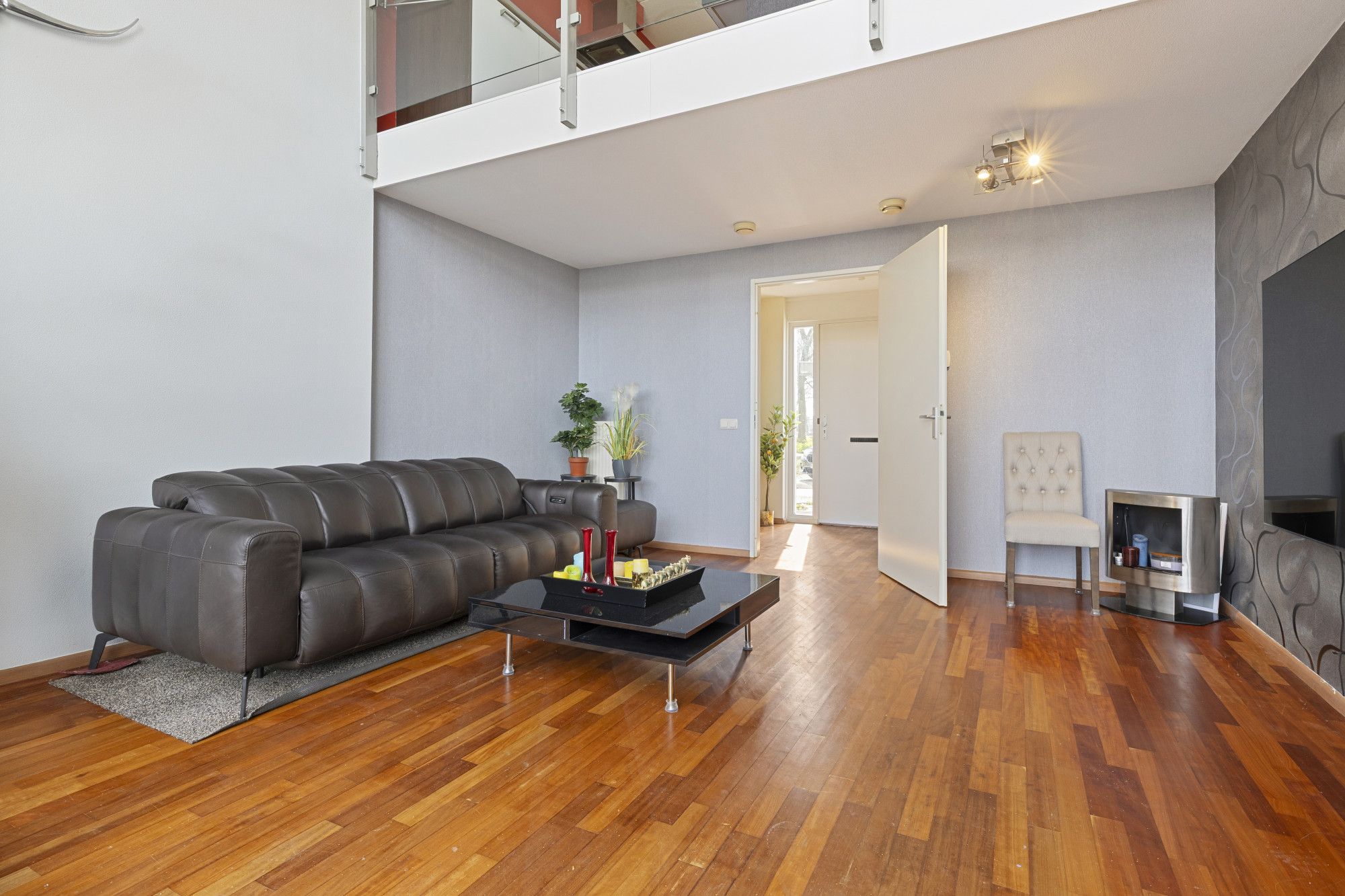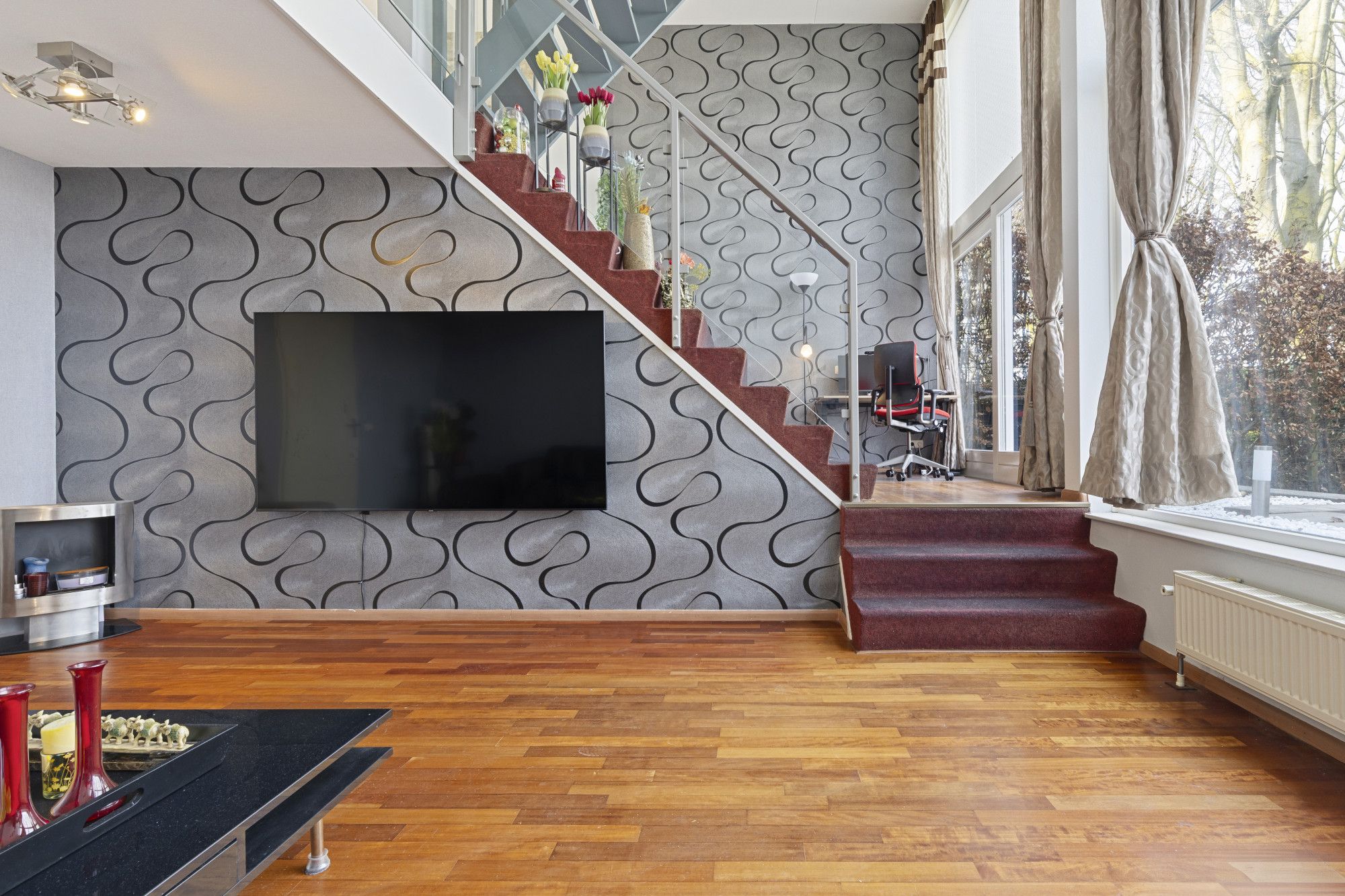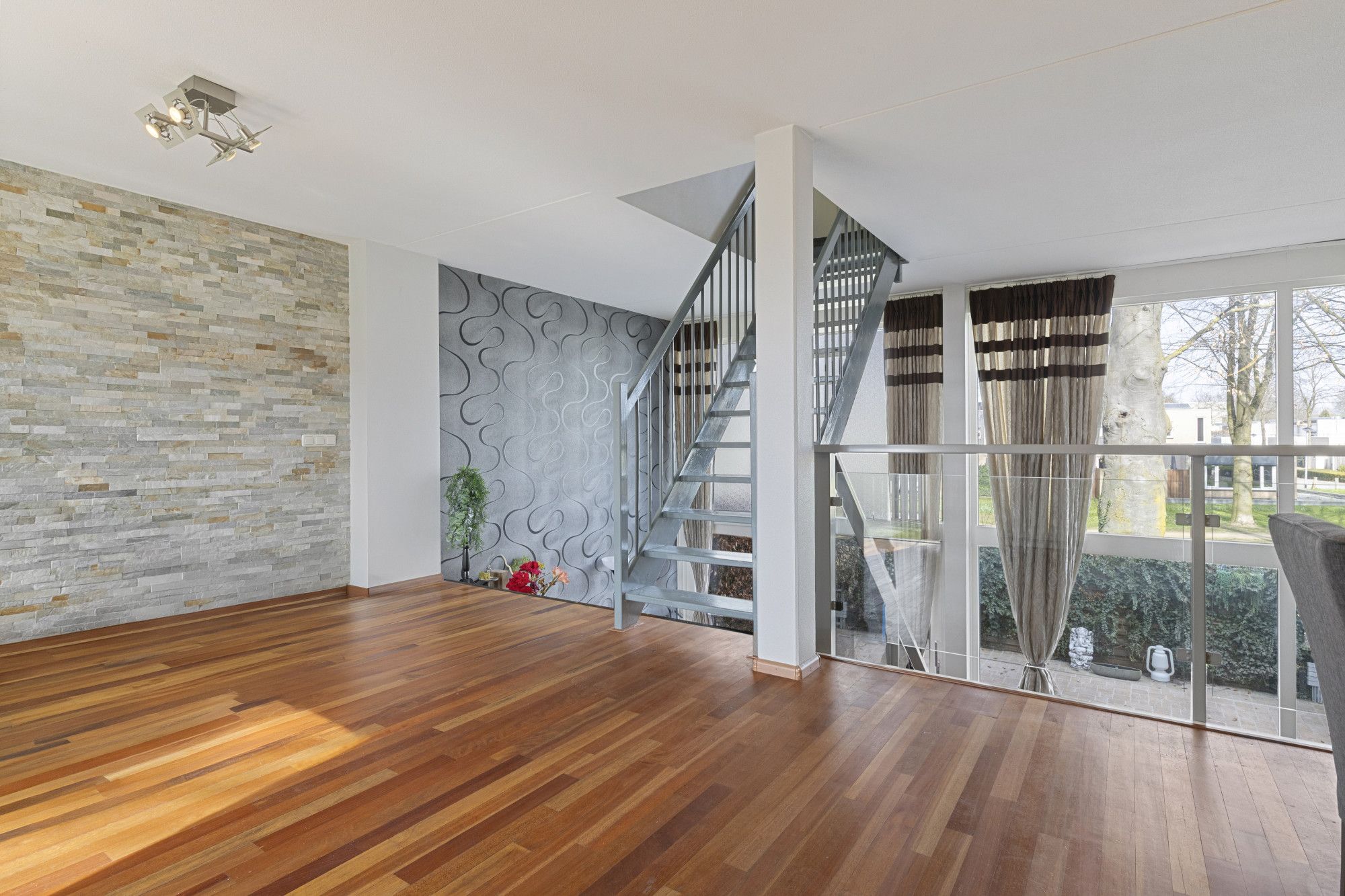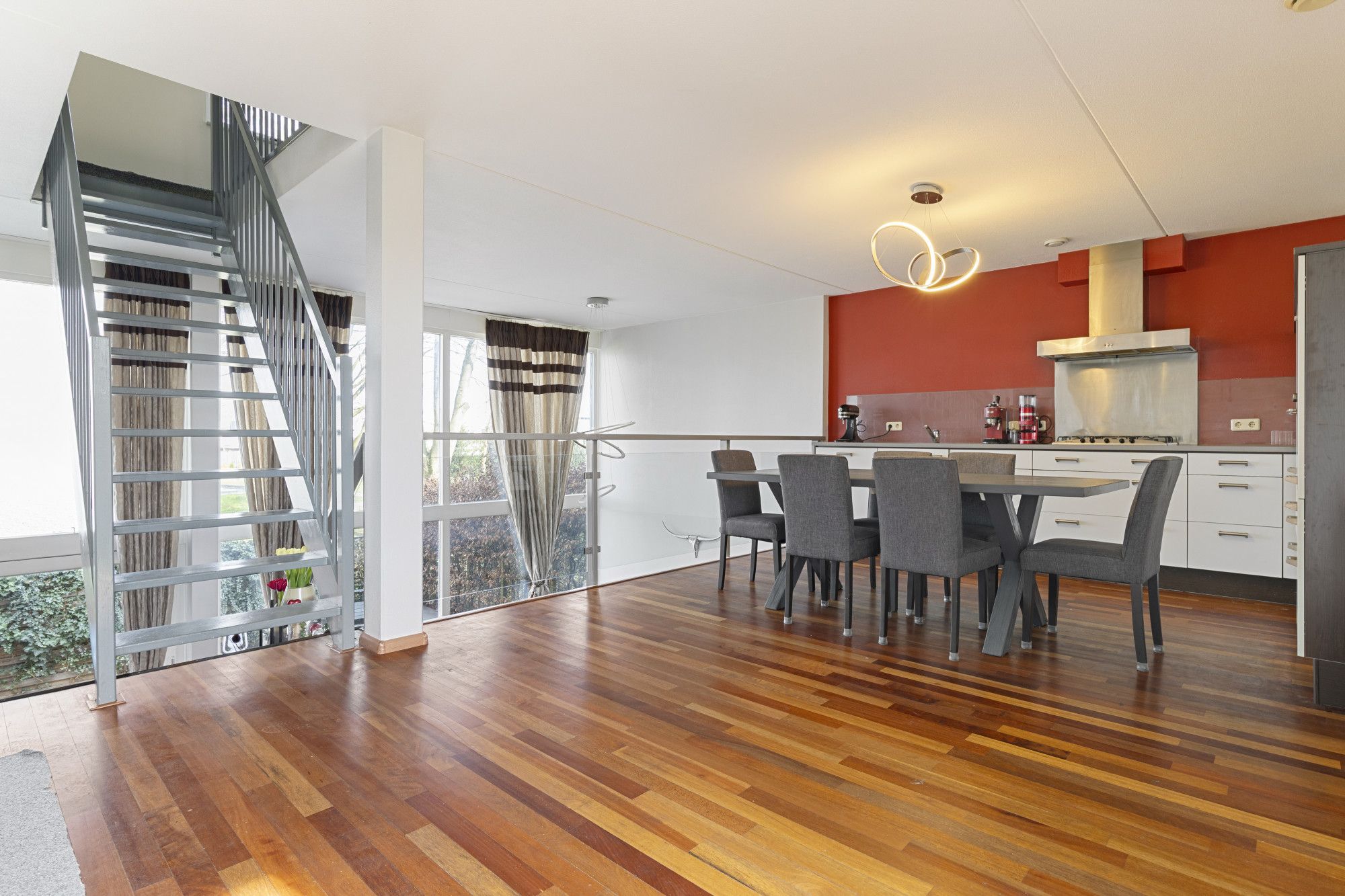 De lichte woonkamer met prachtige parketvloer is een heerlijke plek om te ontspannen. De kamerhoge glaswand met schuifpui zorgt voor een waanzinnig tuincontact en een zee aan licht.