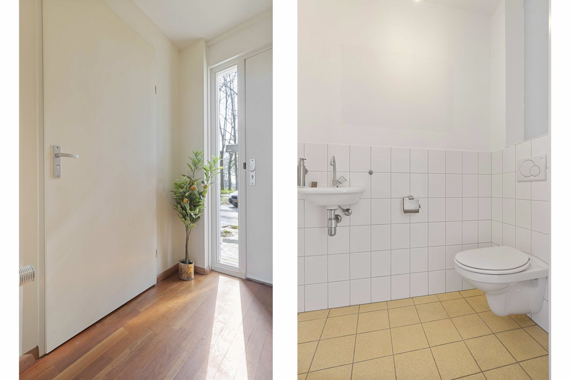 Vanuit hier is er toegang tot het halfhoog betegelde toilet met zwevend closet en fonteintje, evenals tot de inpandige garage.