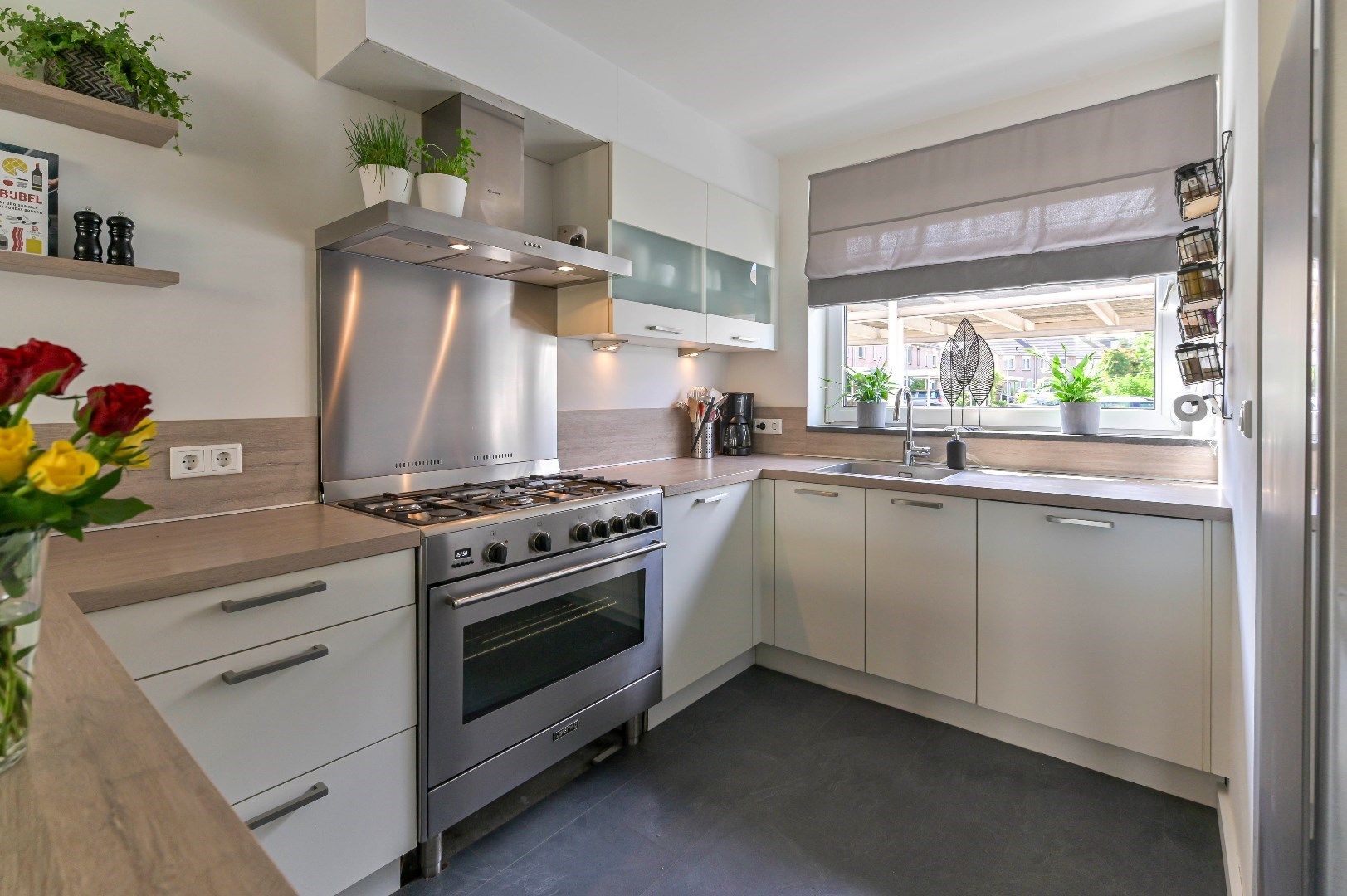 Indeling: Hal met laminaatvloer, garderobe, meterkast en toegangsluik naar de kruipruimte. Zwevend toilet met fonteintje (2013). Woonkamer met laminaatvloer, trapkast, stukwerk wandafwerking, schuifpui welke toegang biedt tot de serre. Open keuken (U-opstelling uit 2015) met Amerikaanse koelkast met ijsmachine, 5 pits gasfornuis met oven, afzuigkap, en nieuwe vaatwasser (2024). Aluminium serre met tegelvloer en schuifpui welke toegang biedt tot de tuin met berging en vrije achterom.