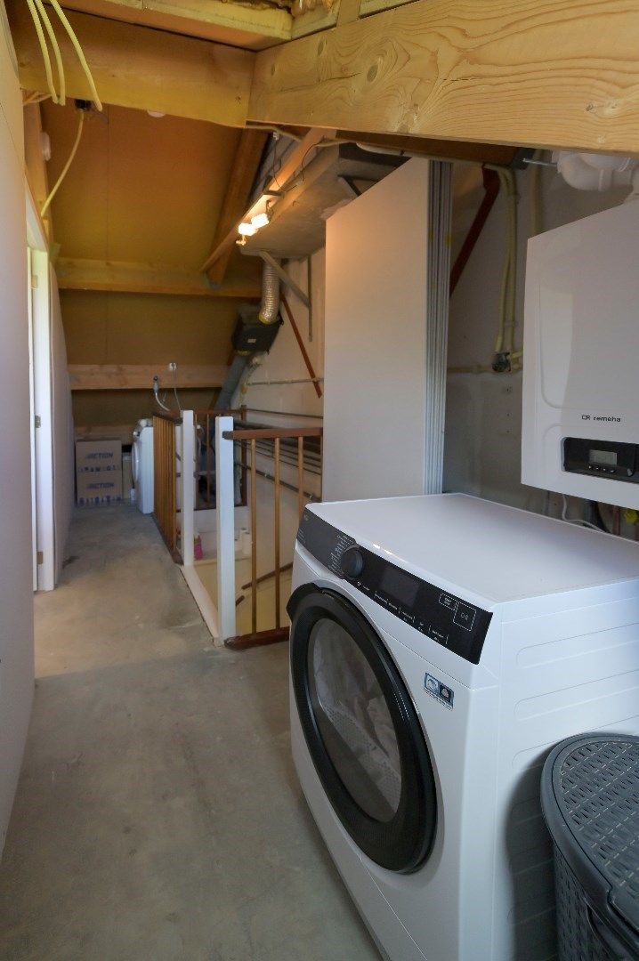 Overloop met CV-opstelling (nieuwe Remeha Hr-ketel 2025) en witgoedopstelling. 4de ruime slaapkamer met dakkapel en laminaatvloer. Zowel de overloop als de 4de slaapkamer dienen nog afgewerkt te worden.