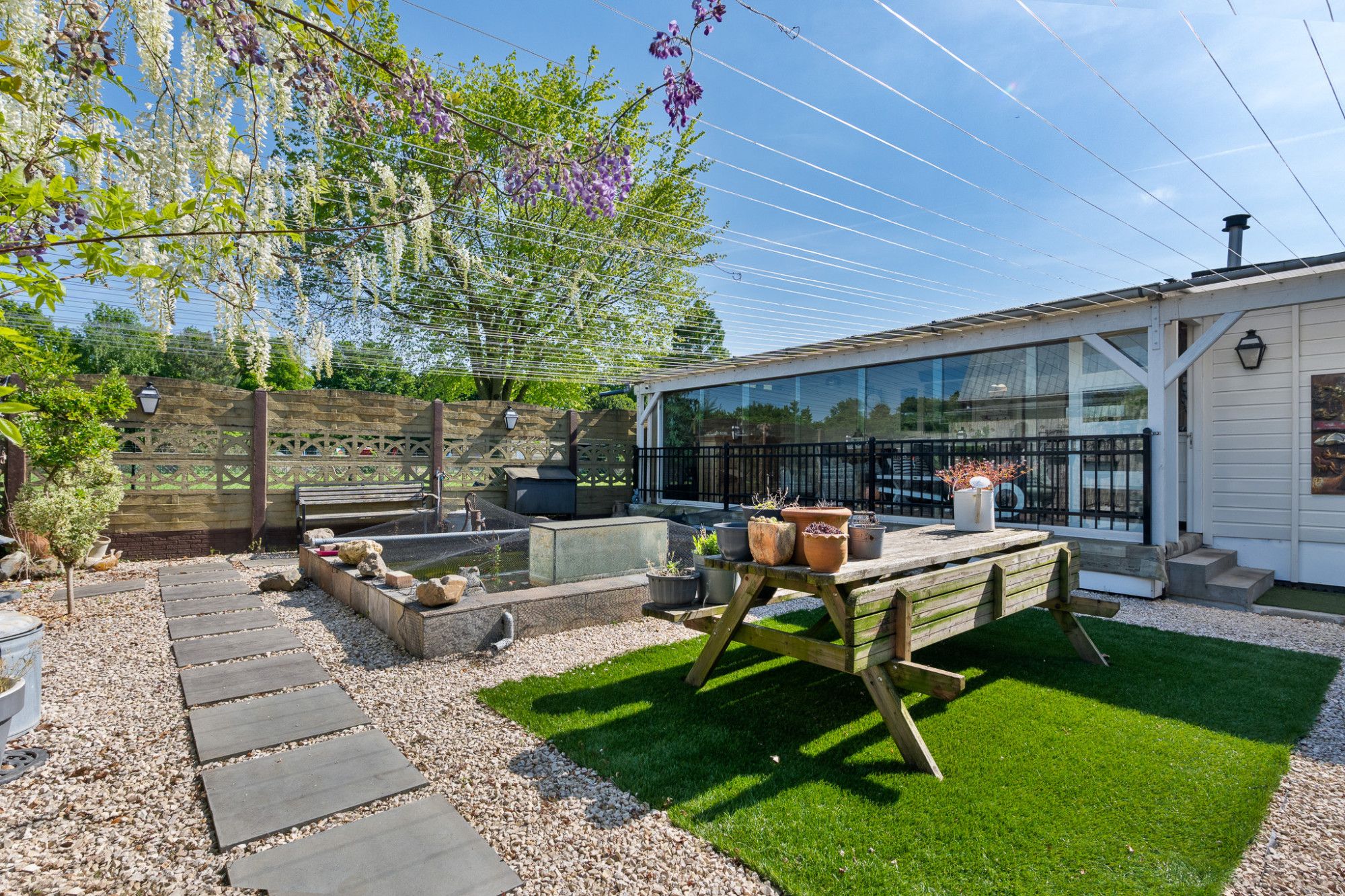 Deze volledig omheinde en onderhoudsvriendelijke tuin biedt vele zitplaatsen en opbergruimte: