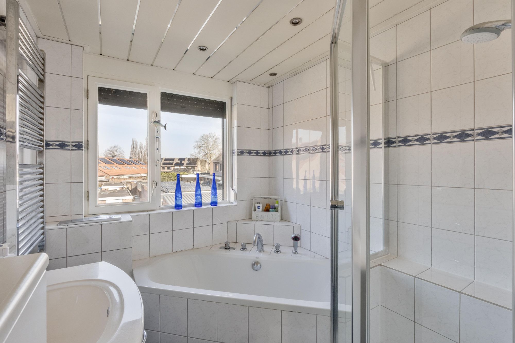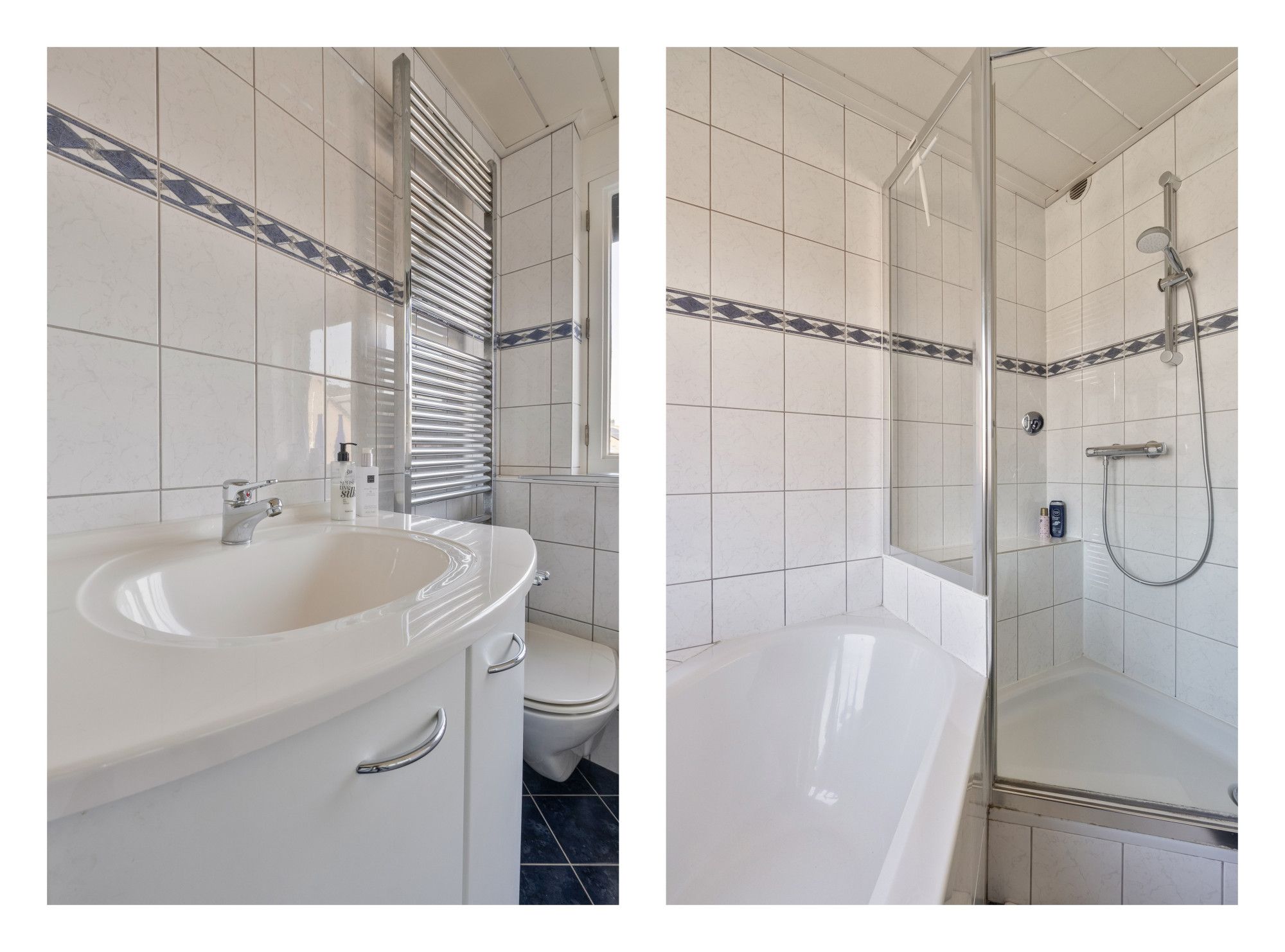 -De badkamer (ca. 5m2) is compleet uitgevoerd met een hoekbad, douchecabine, hangend closet, wastafel met meubel en een designradiator.