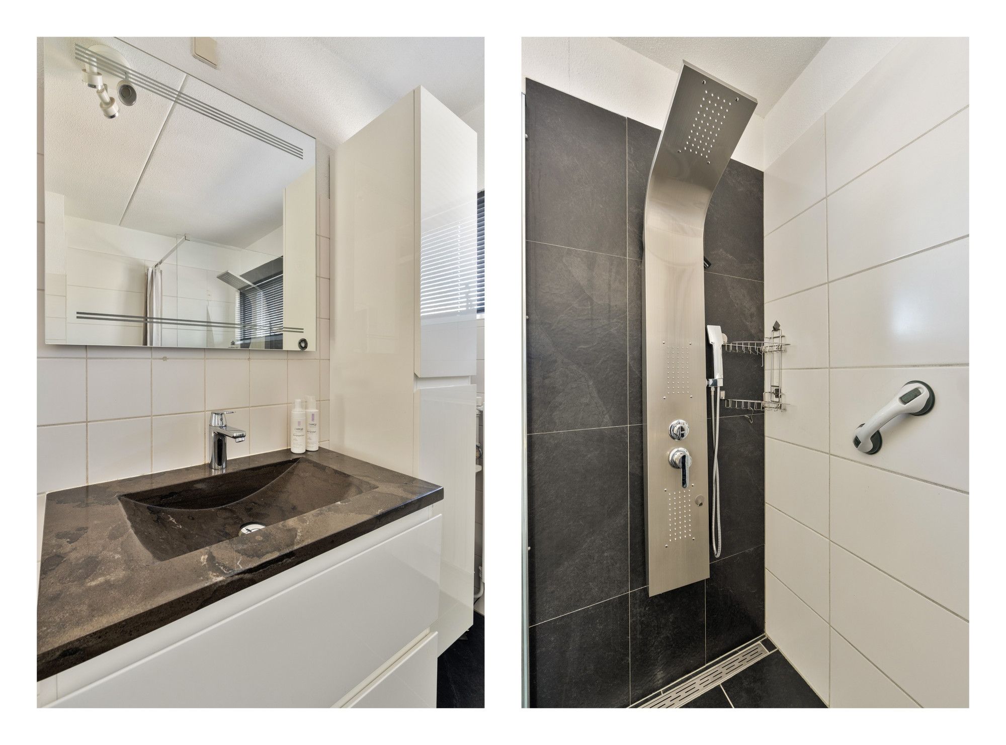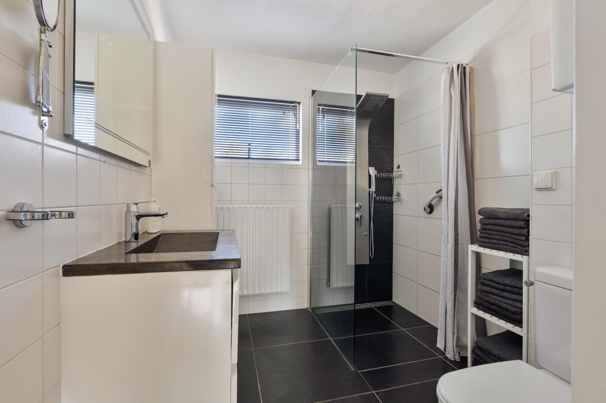 De badkamer is modern betegeld en voorzien van een inloopdouche met luxe regendouche, een wastafelmeubel en toilet.