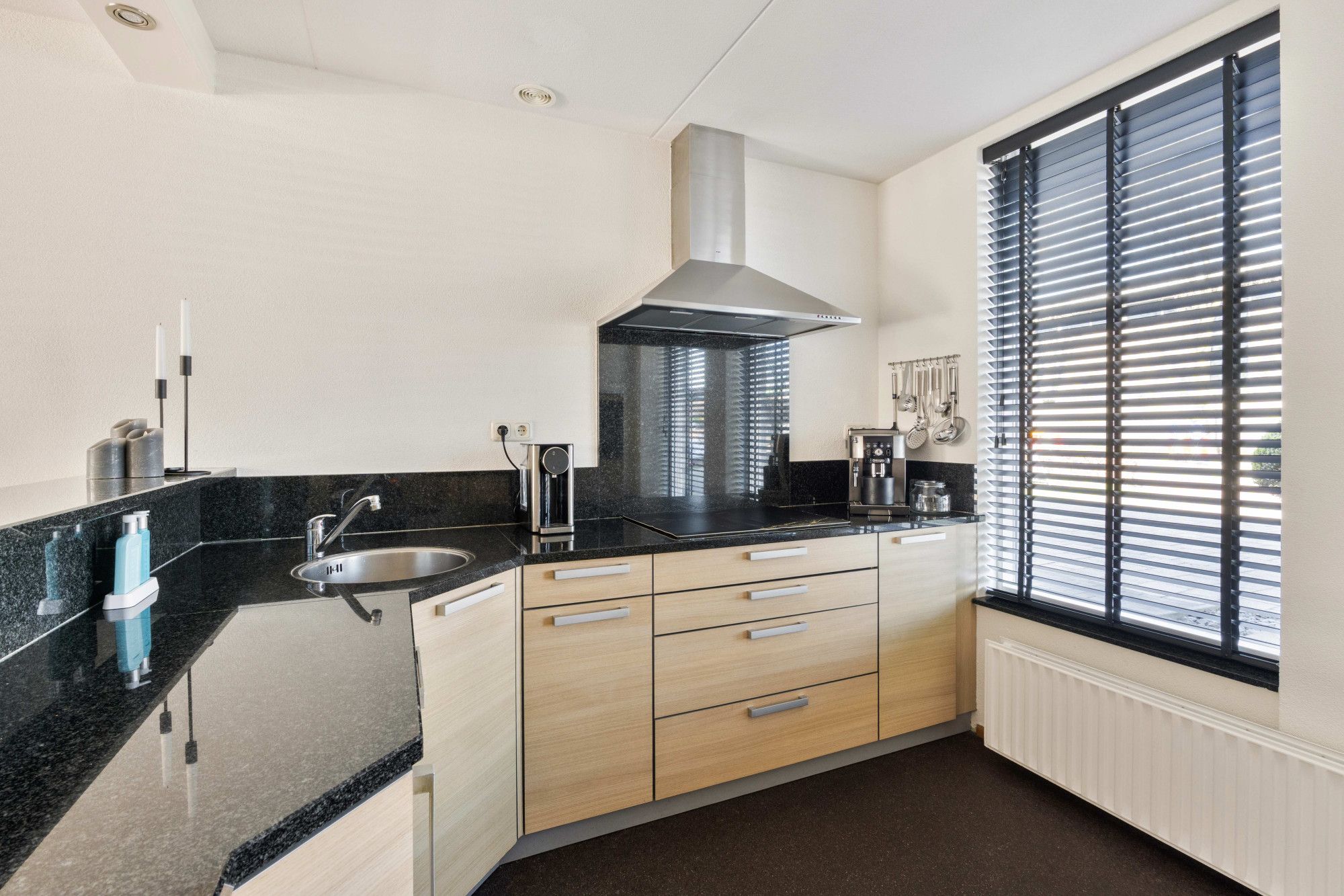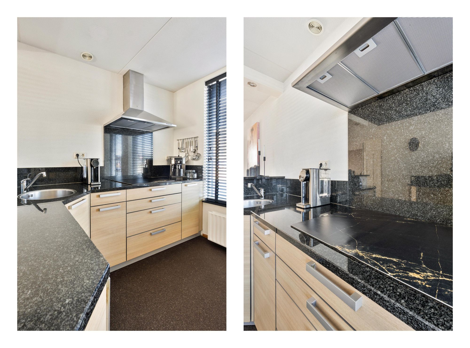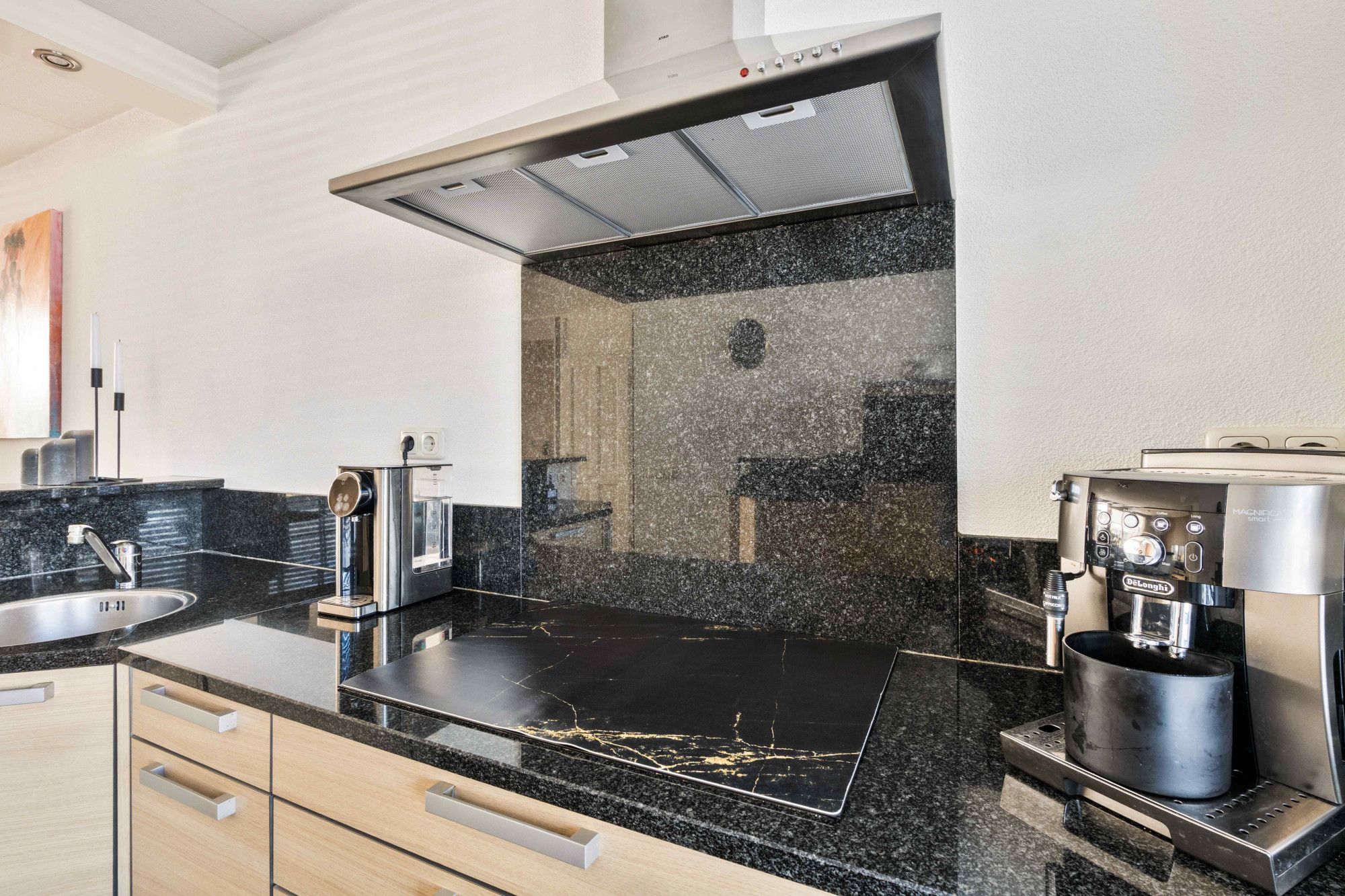 De keuken is gelegen aan de voorzijde en modern uitgevoerd en voorzien van diverse inbouwapparatuur, waaronder een inductiekookplaat, afzuigkap, combimagnetron, ingebouwde koelkast en een vaatwasser. De keuken is netjes afgewerkt met een natuurstenen aanrechtblad