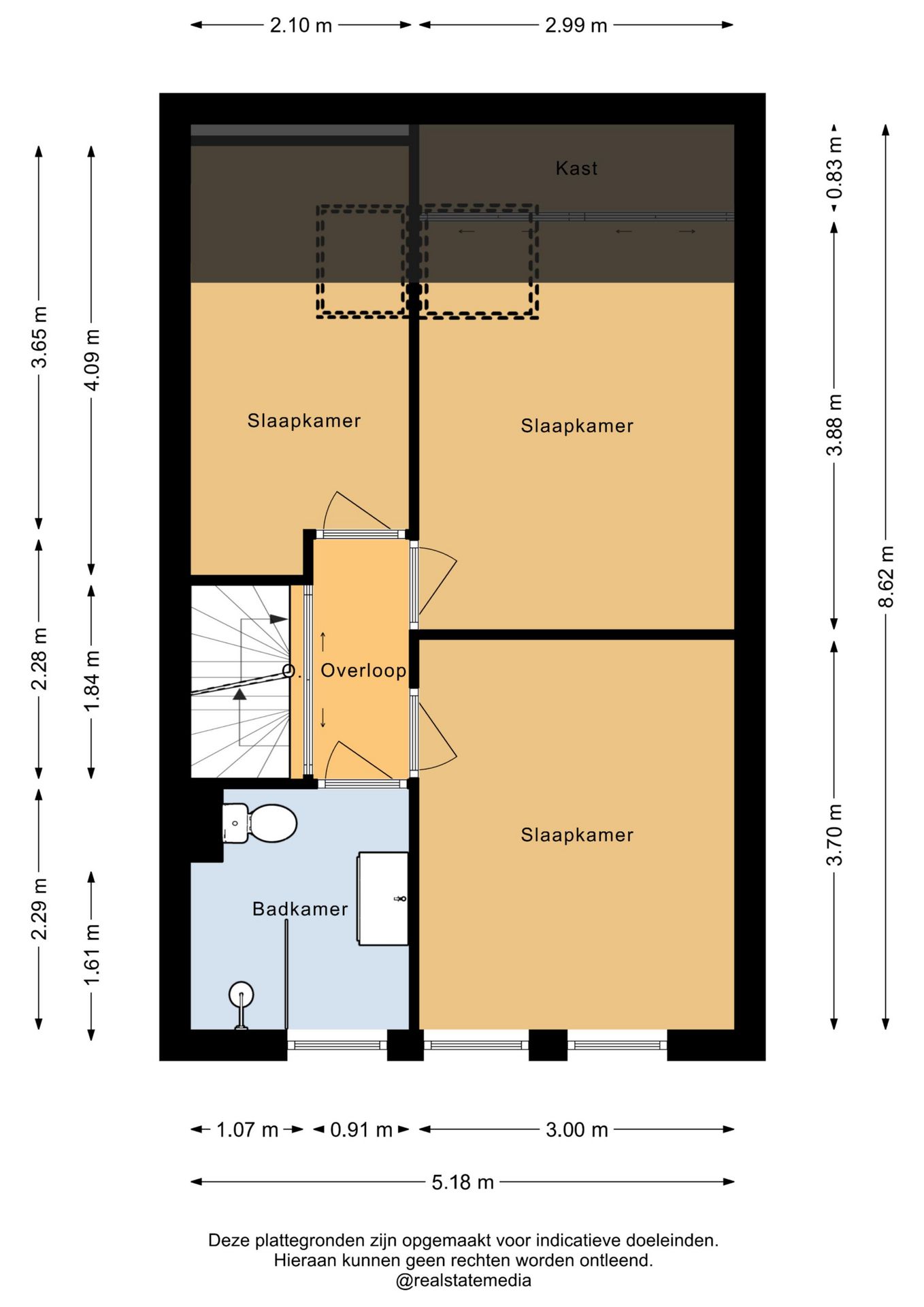 Via de trap komt u uit op de overloop. Vanuit hier is er toegang tot drie ruime slaapkamers en de badkamer.
