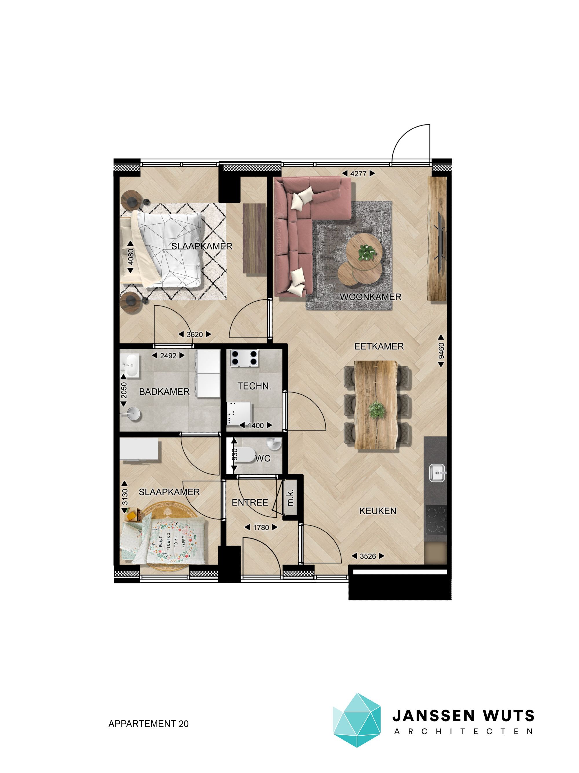 Dit appartement beschikt over een ruime leefruimte, die bestaat uit een woonkamer, eetkamer en keuken. Er zijn twee slaapkamers: een master bedroom en een tweede slaapkamer. De badkamer is uitgerust met een inloopdouche en een wastafel, en er is een separaat toilet aanwezig.