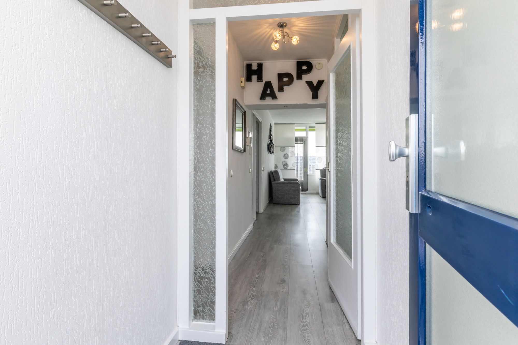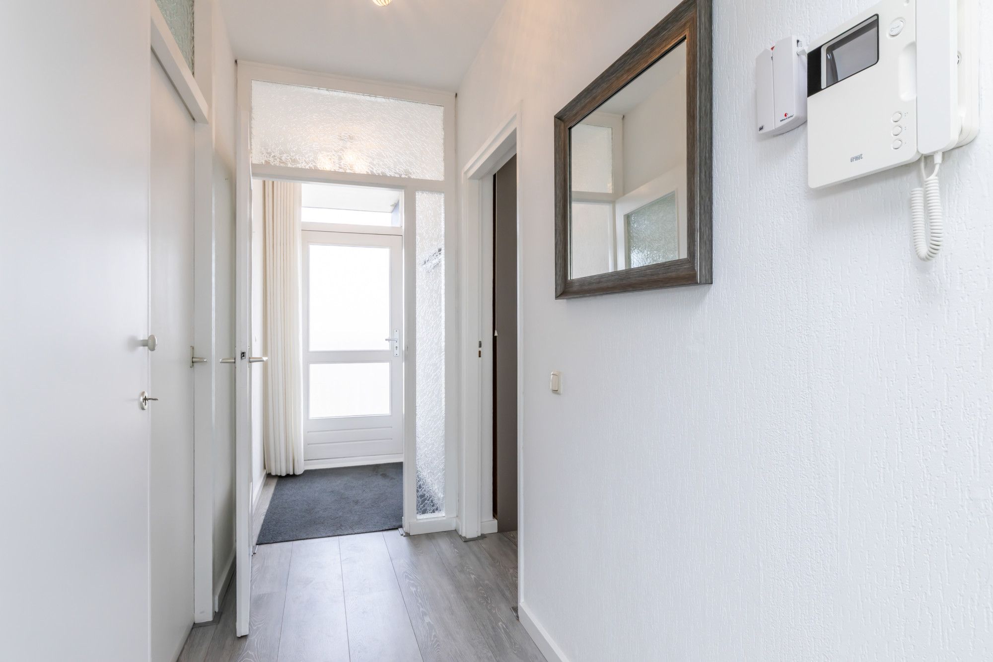 Entree/portaal met kapstok, meterkast voorzien van 6 groepsinstallatie / 2x aardlekschakelaar / digitale meters met dag- en nachtstoomaansluiting. Doorgang naar de woonkamer, keuken en toegang tot de slaapkamer aan de voorzijde.