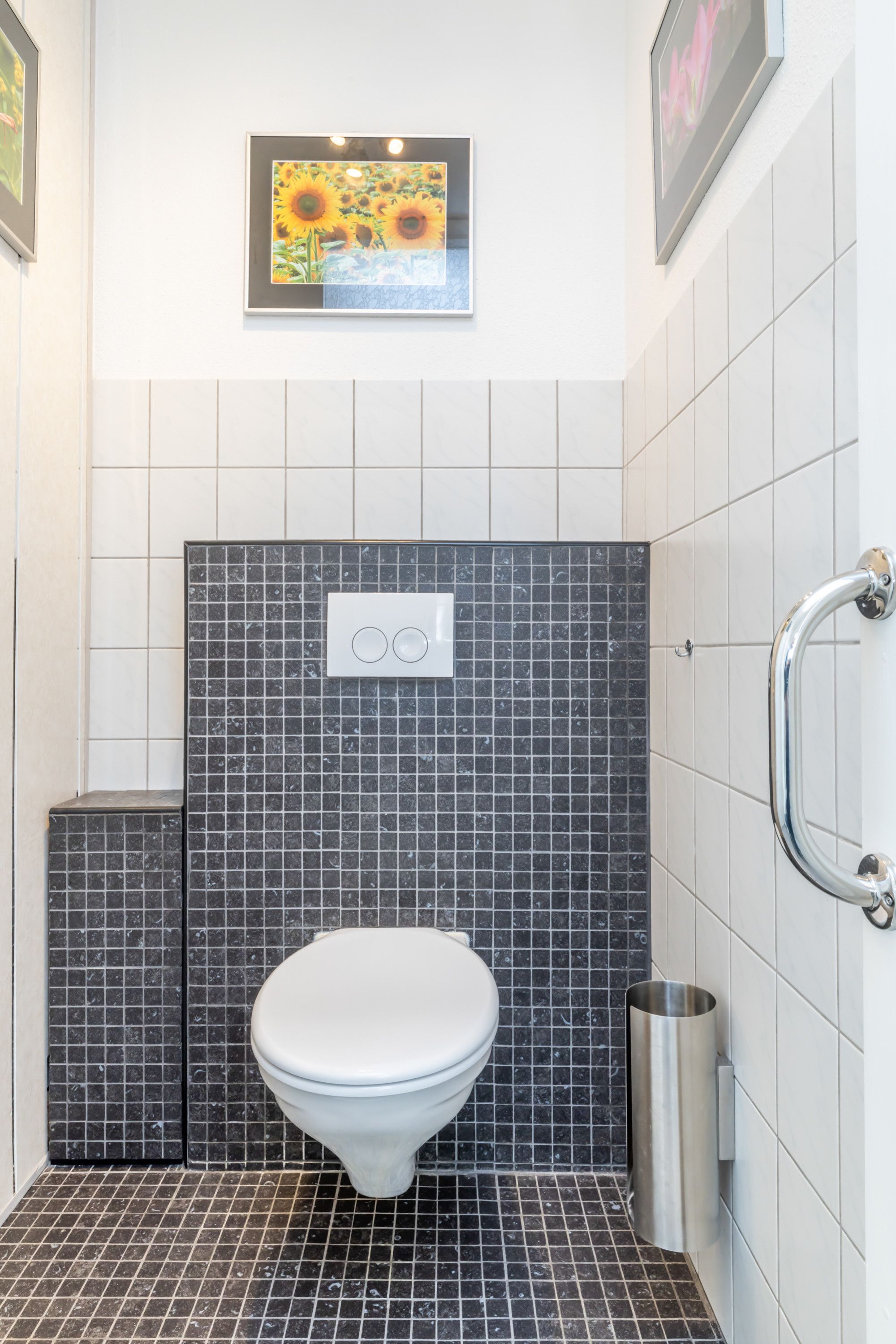 Geheel betegeld modern gastentoilet met zwevend wandcloset.