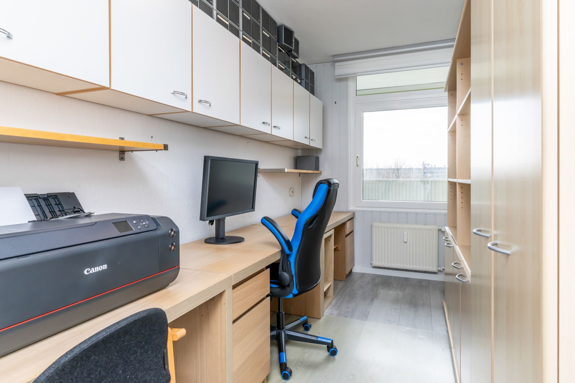 De slaapkamer aan de linker achterzijde is in gebruik als hobby-/studeerkamer. De naastgelegen slaapkamer kan prima dienst doen als logeerkamer of kleedkamer.