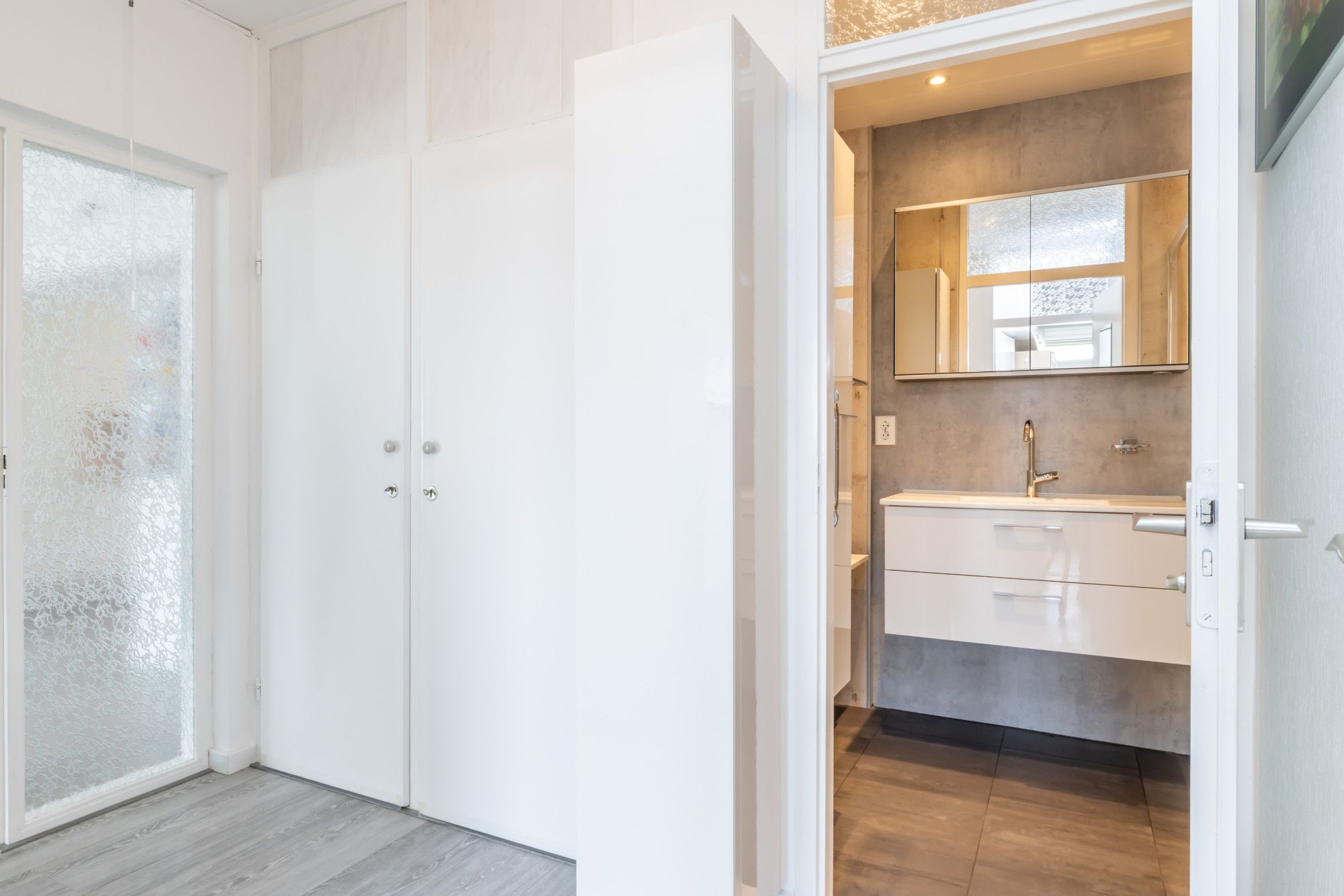 Via een tussenportaal met bergruimte in een wandkast is er toegang tot het gastentoilet, de badkamer en de slaapvertrekken aan de achterzijde. In de muurkast bevinden zich de witgoedaansluitingen voor wasmachine en droger.
