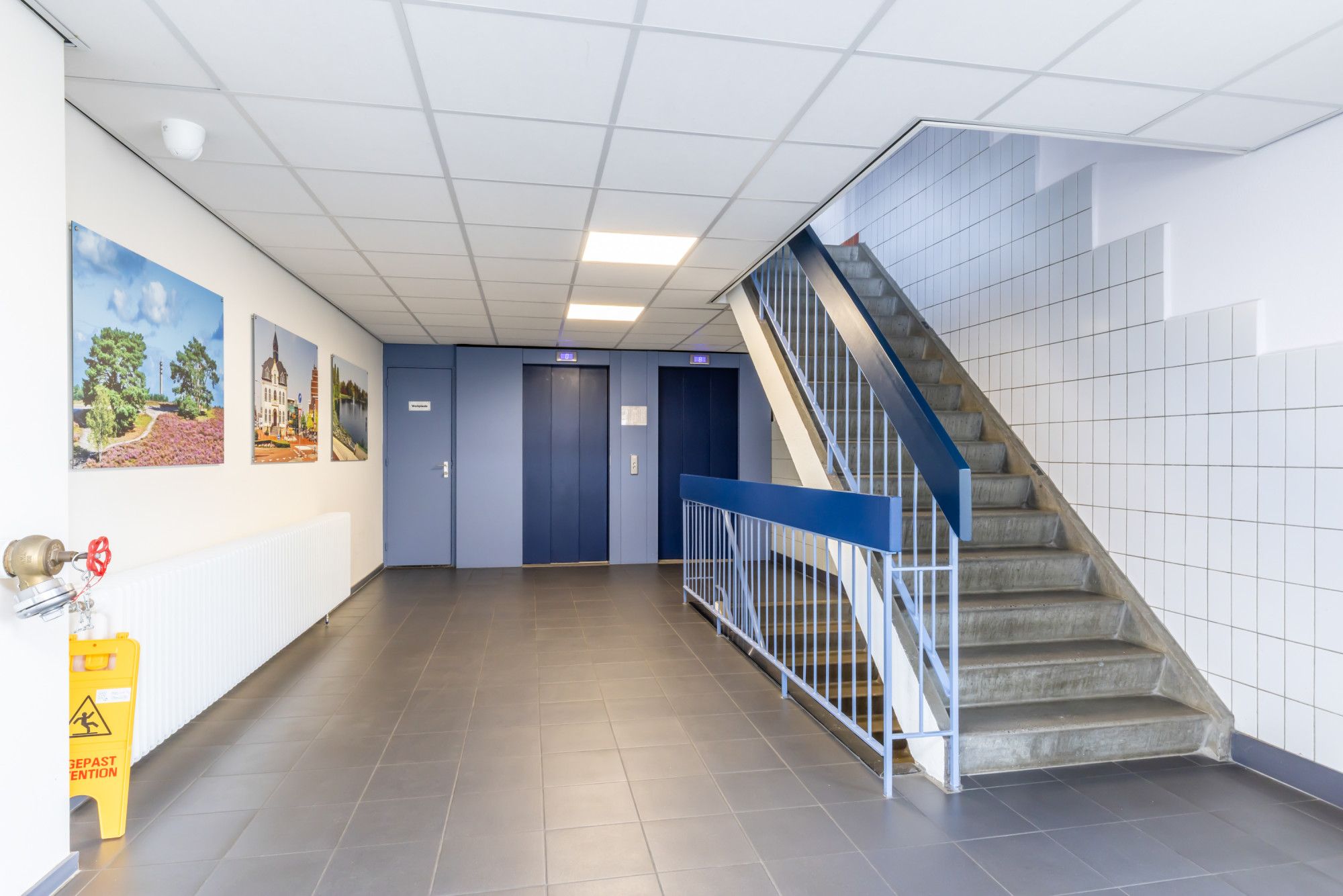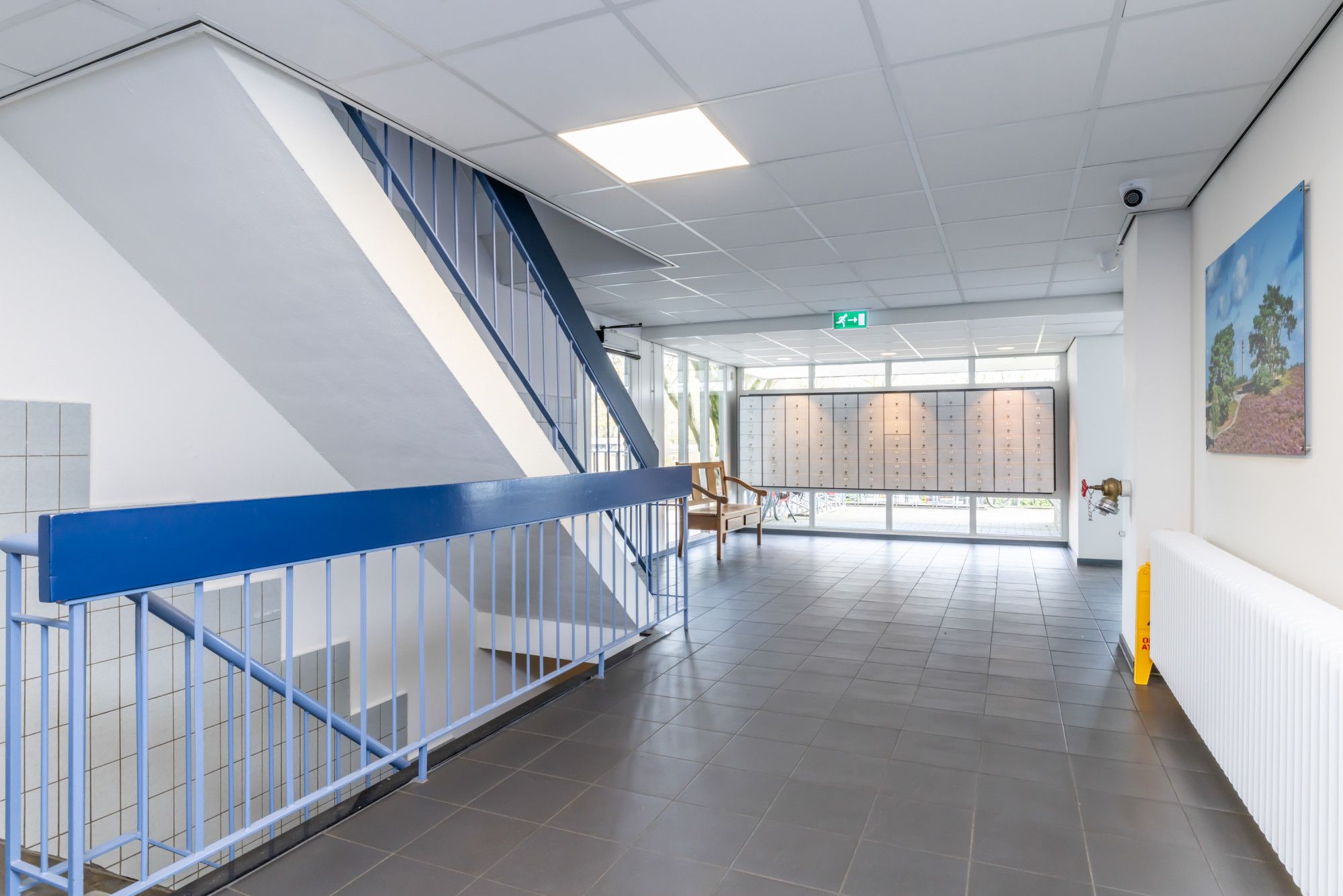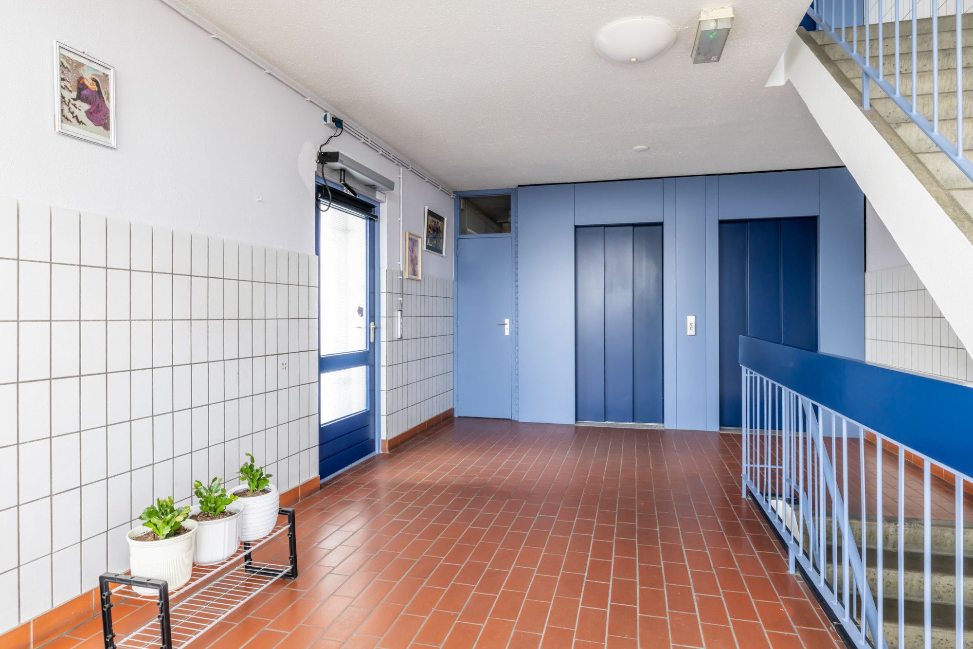 Centrale entree, hal met videofoontableau en brievenbussen, trappenhuis en dubbele liftinstallatie. Op de begane grond is de privéberging aanwezig.