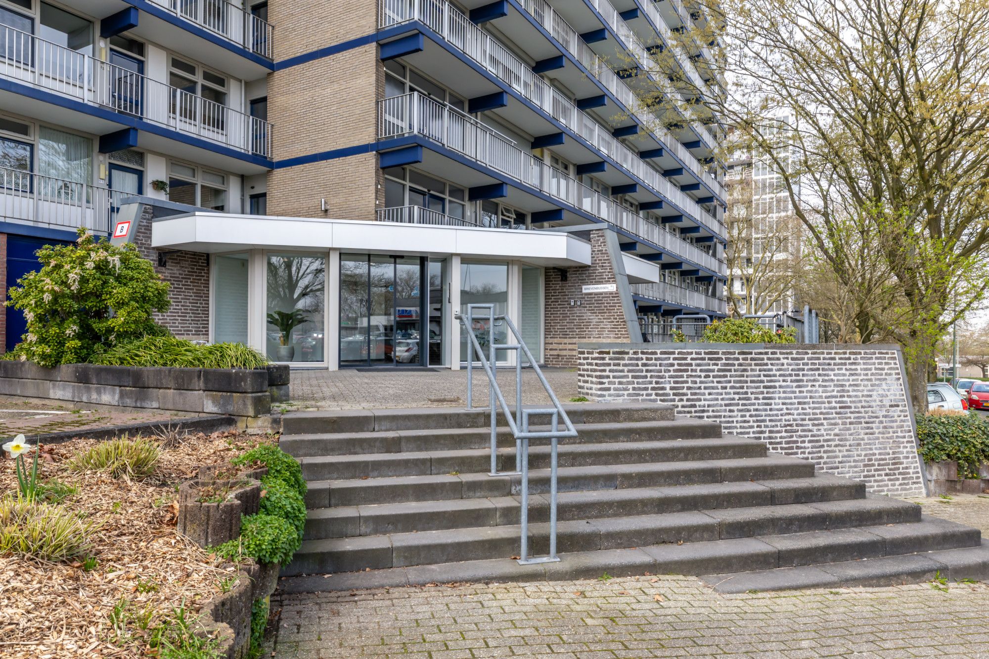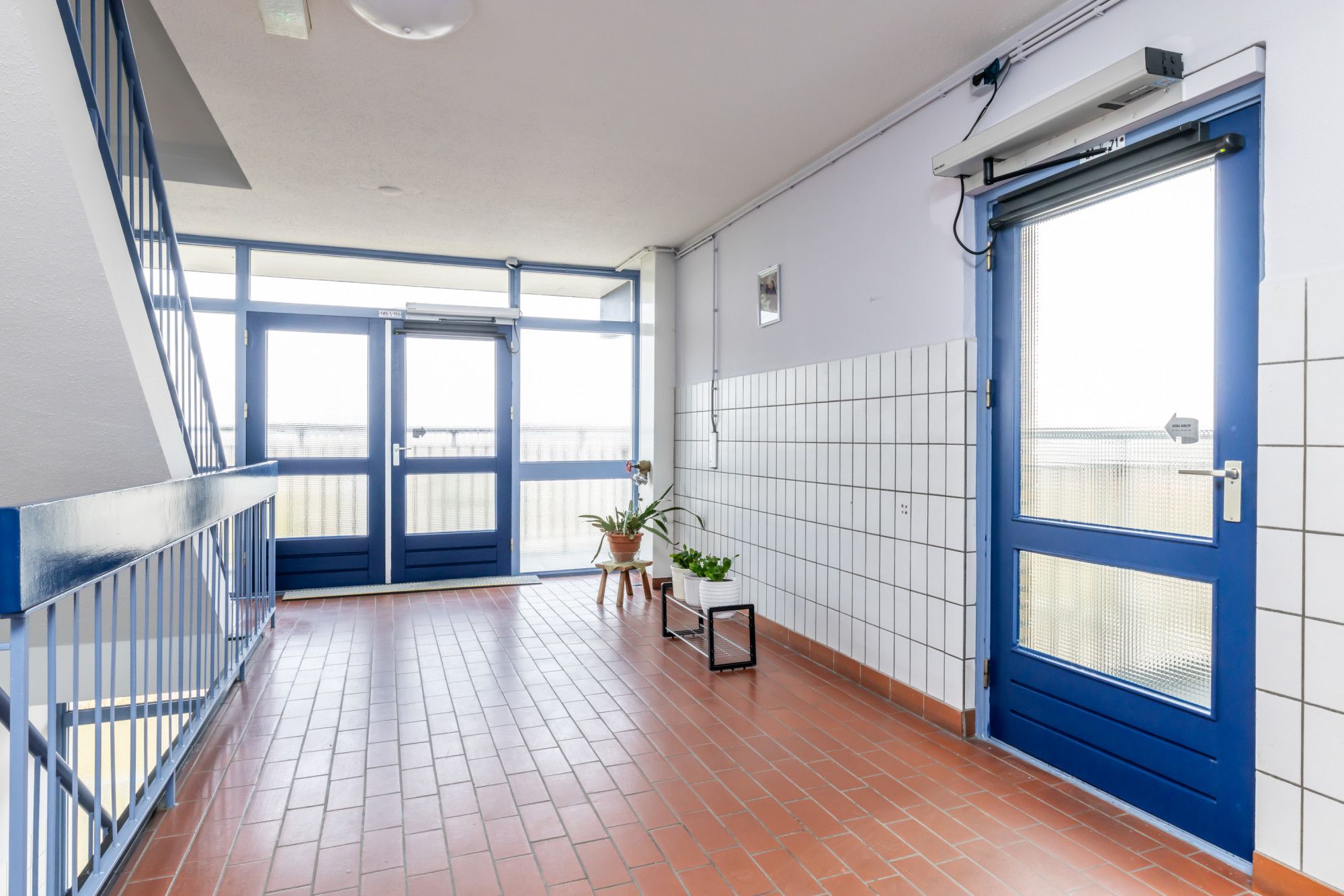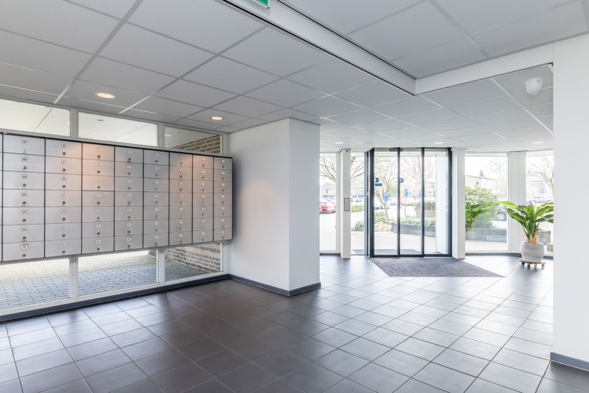 Centrale entree, hal met videofoontableau en brievenbussen, trappenhuis en dubbele liftinstallatie. Op de begane grond is de privéberging aanwezig.