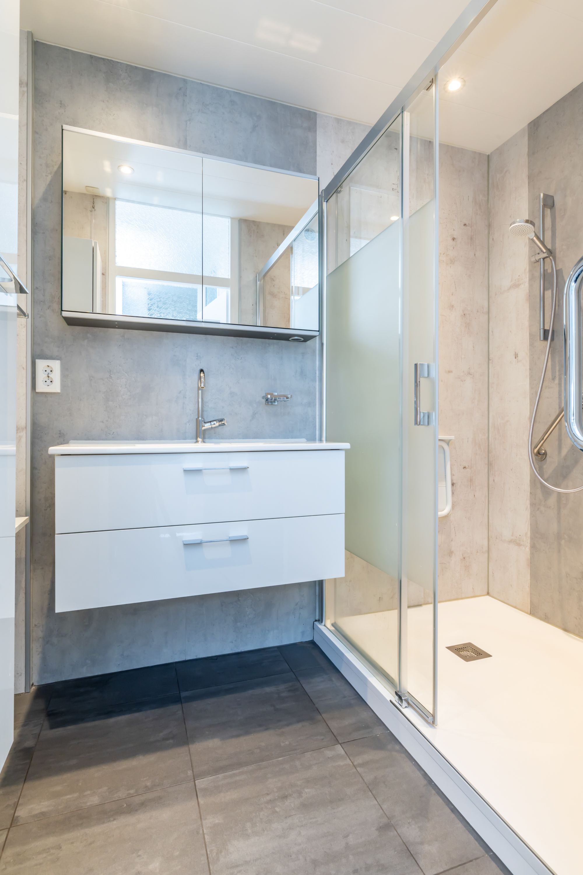De strakke gerenoveerde badkamer is voorzien van een ruime inloopdouche / badkamermeubel met een vaste wastafel en mechanische ventilatie.