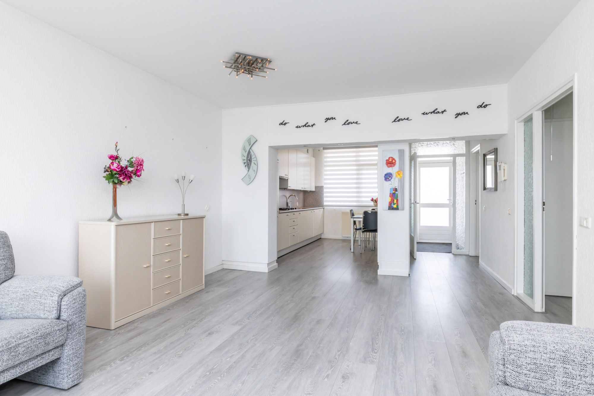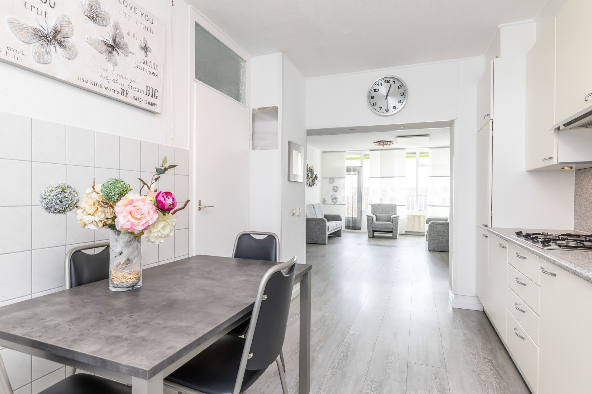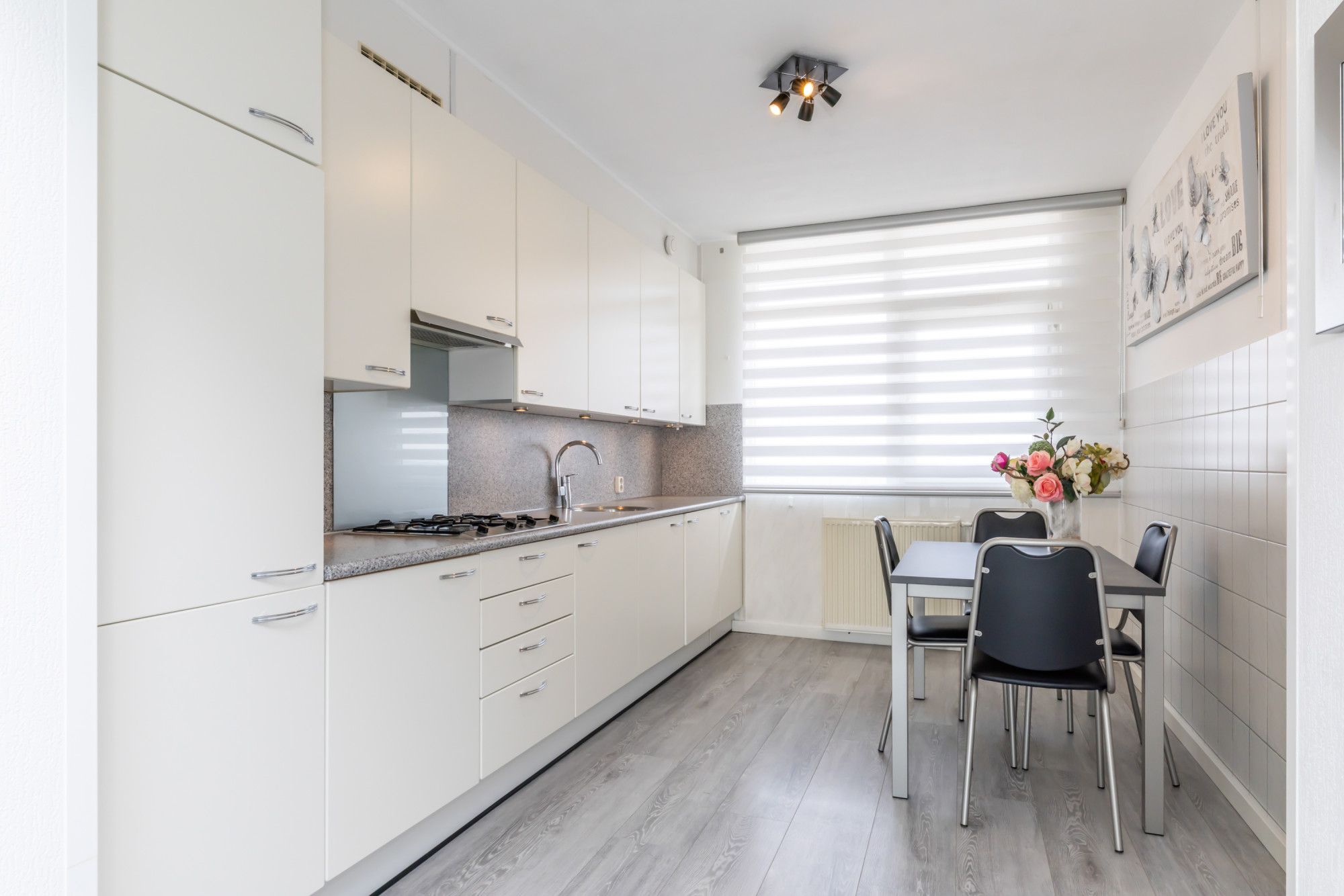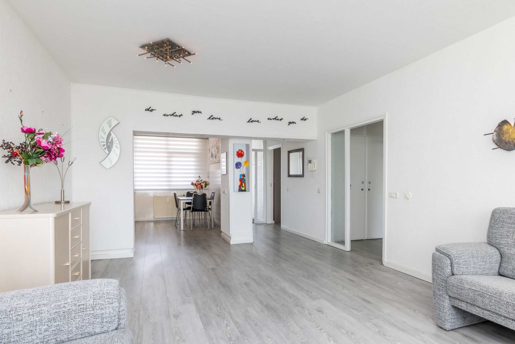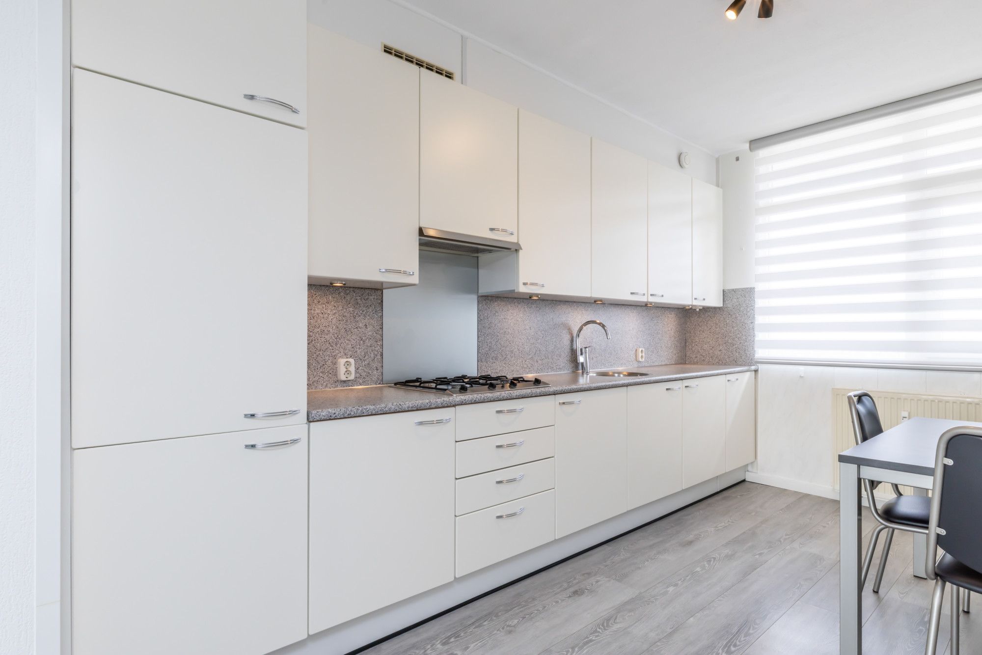 Centraal in het appartement is volop ruimte voor het plaatsen van een eethoek, waardoor een fijne verbinding ontstaat tussen wonen en tafelen.