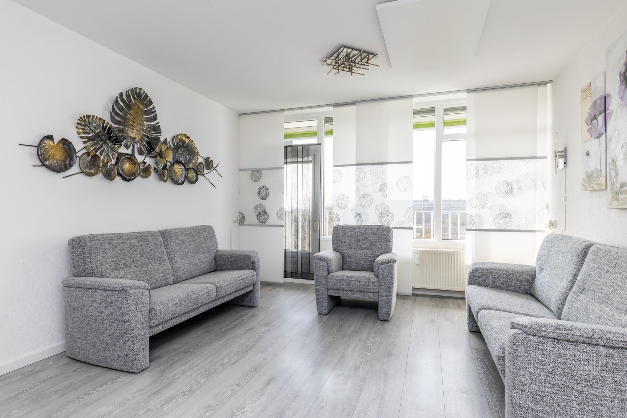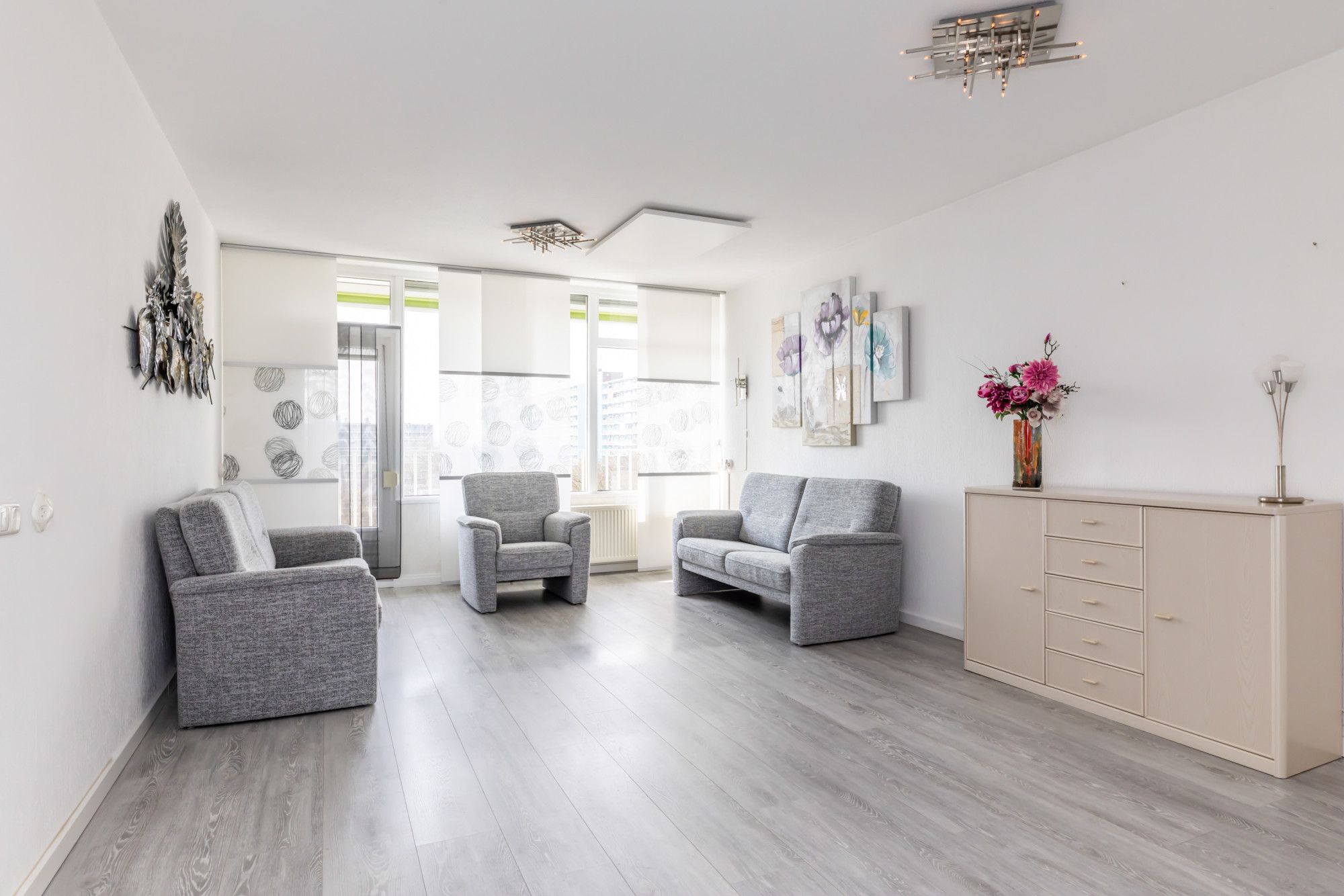 Royale woonkamer, voorzien van een laminaat vloer, met veel lichtinval via de grote raampartijen met loopdeur naar balkon, hier zijn screendoek zonweringen aanwezig en een vrij uitzicht op het groen. Aan de achterzijde gelegen zithoek met audio-/visuele aansluitingen.