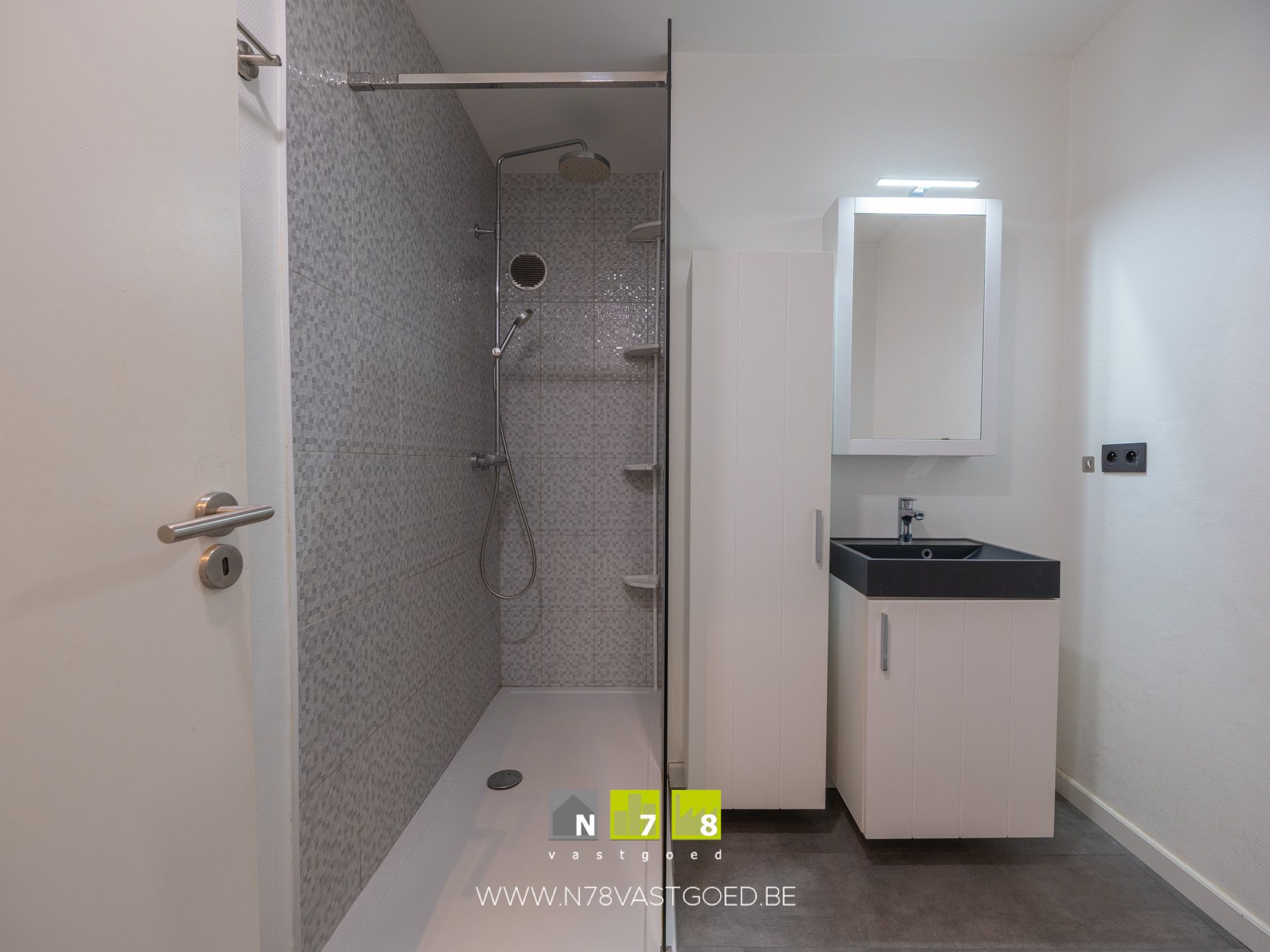 - Badkamer (4,17m²): geïnstalleerd met enkele lavabo, onder- en kolomkast, spiegelkast, douche, aansluiting wasmachine, laminaatvloer.