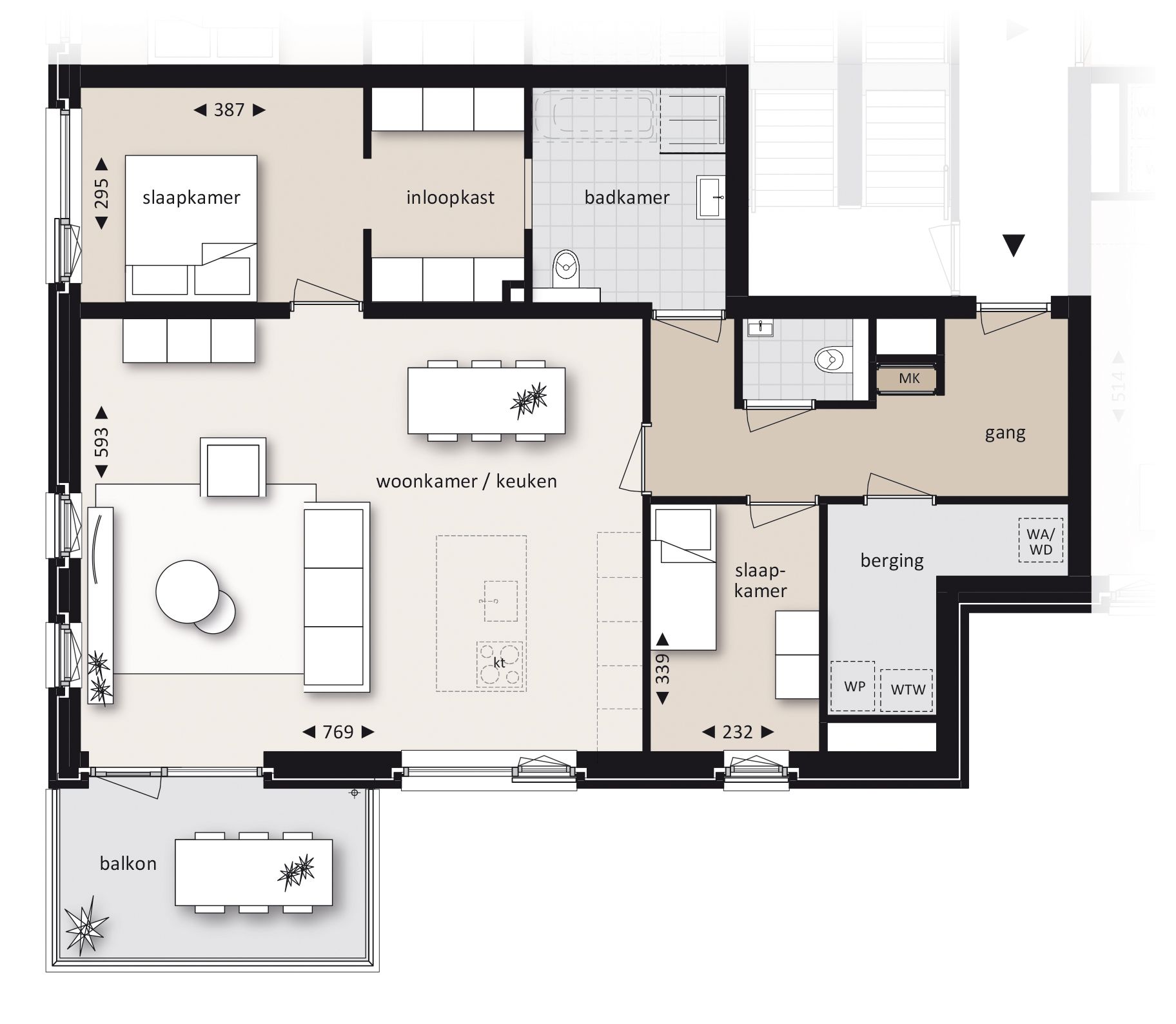 Naast een ontvangsthal met gastentoilet en berging (voor o.a. de warmtepomp), beschikt appartement 7 over twee slaapkamers, een ruime badkamer met betegelde inloopdouche, een wastafel, een tweede toilet en de mogelijkheid tot bad. De hoofdslaapkamer beschikt over een eigen inloopgarderobe. Elk appartement heeft de beschikking over een eigen berging en een vaste overdekte parkeerplaats op het achter terrein. Deze parkeerplaatsen worden uitgevoerd als carport met een zogeheten ‘sedumdak’, een dak met groene vegetatie die tevens op de bergingen komt.