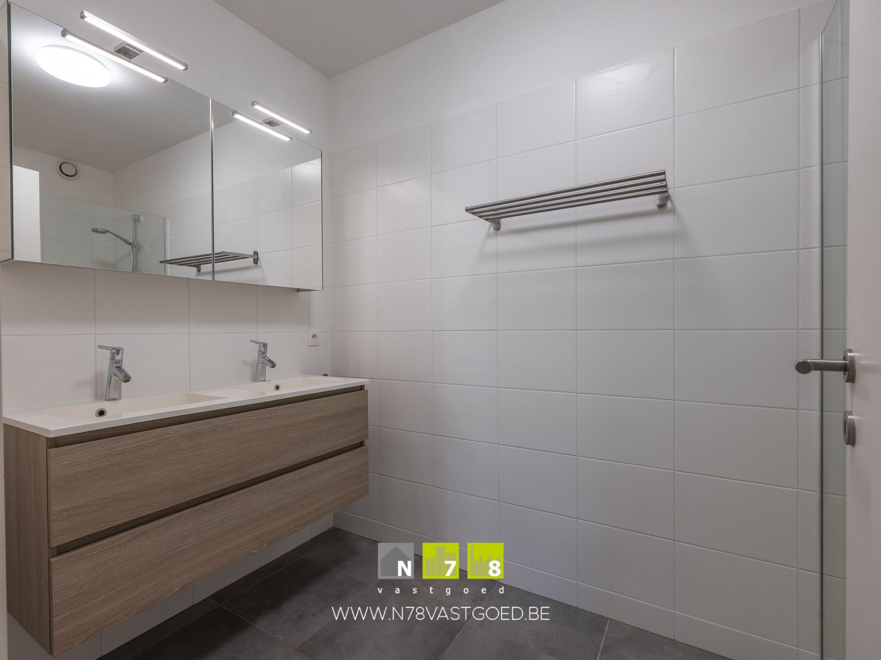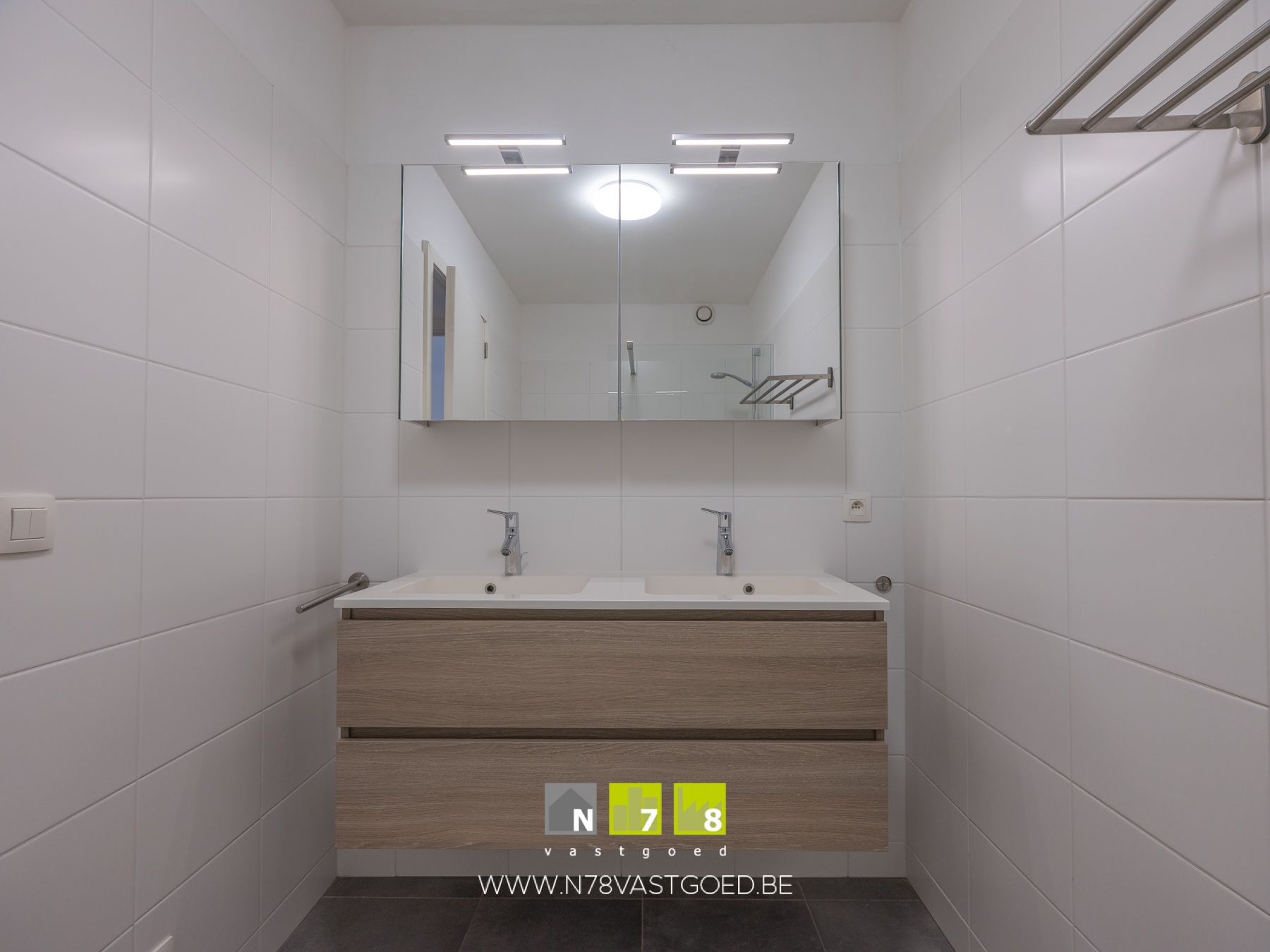 - Badkamer (1,70m x 3,00m = 5,10m²): ingericht badmeubel met dubbele lavabo, spiegelkasten inclusief LED verlichting, onderlades; inloopdouche, wandbetegeling, tegelvloer.