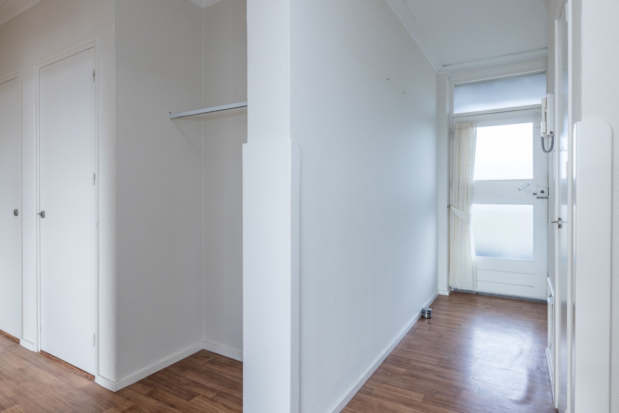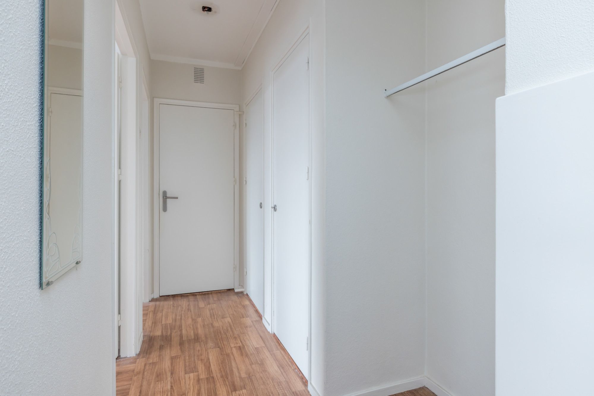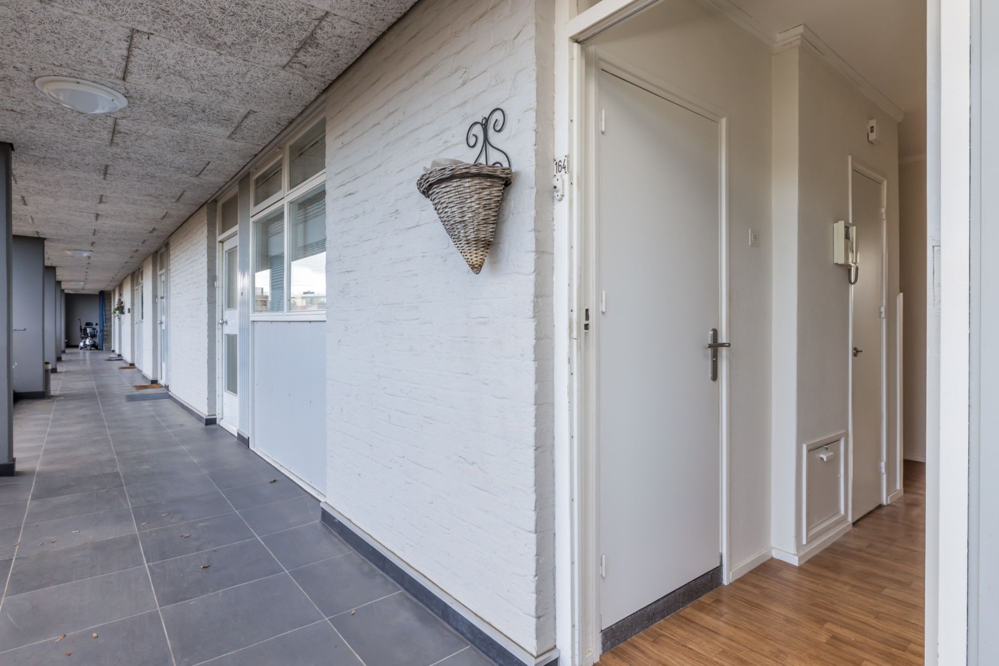 Middels de galerij bereikt men de entree van het appartement. In de hal bevinden zich het betegelde toilet met fonteintje, garderobenis en 2 muurkasten.