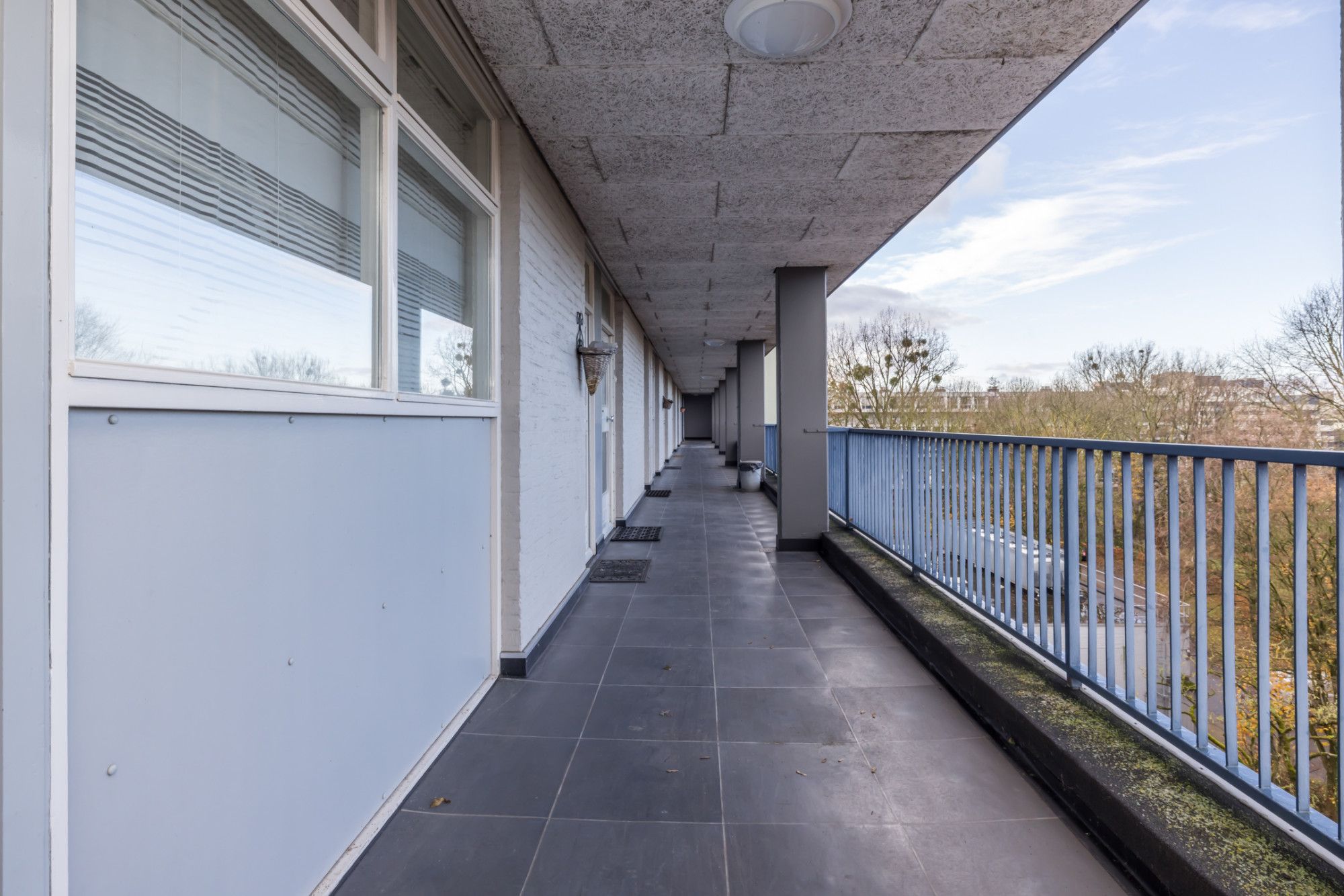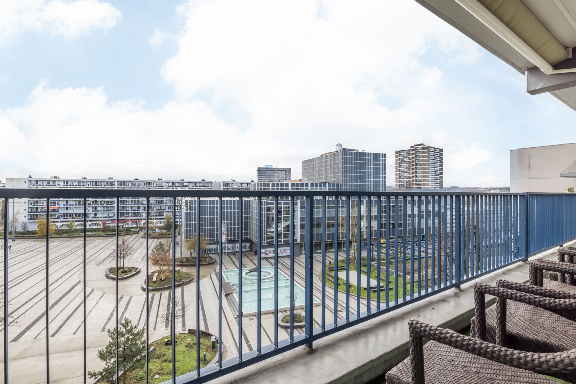 Het zonnige balkon bevindt zich over de gehele breedte van het appartement (10,27m x 1,18m) is v.v. een zonnescherm en biedt een fraai uitzicht over het van Grunsvenplein.