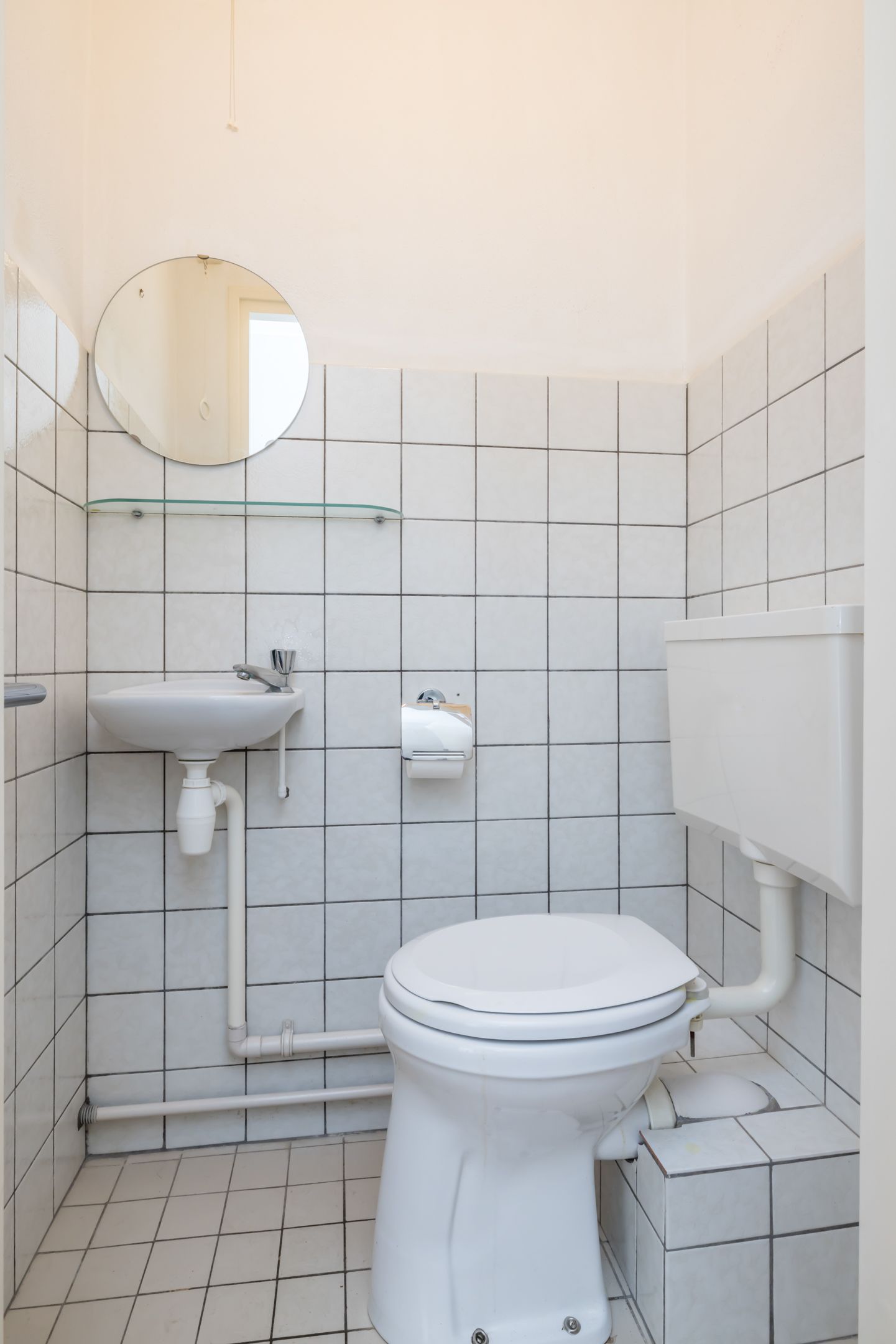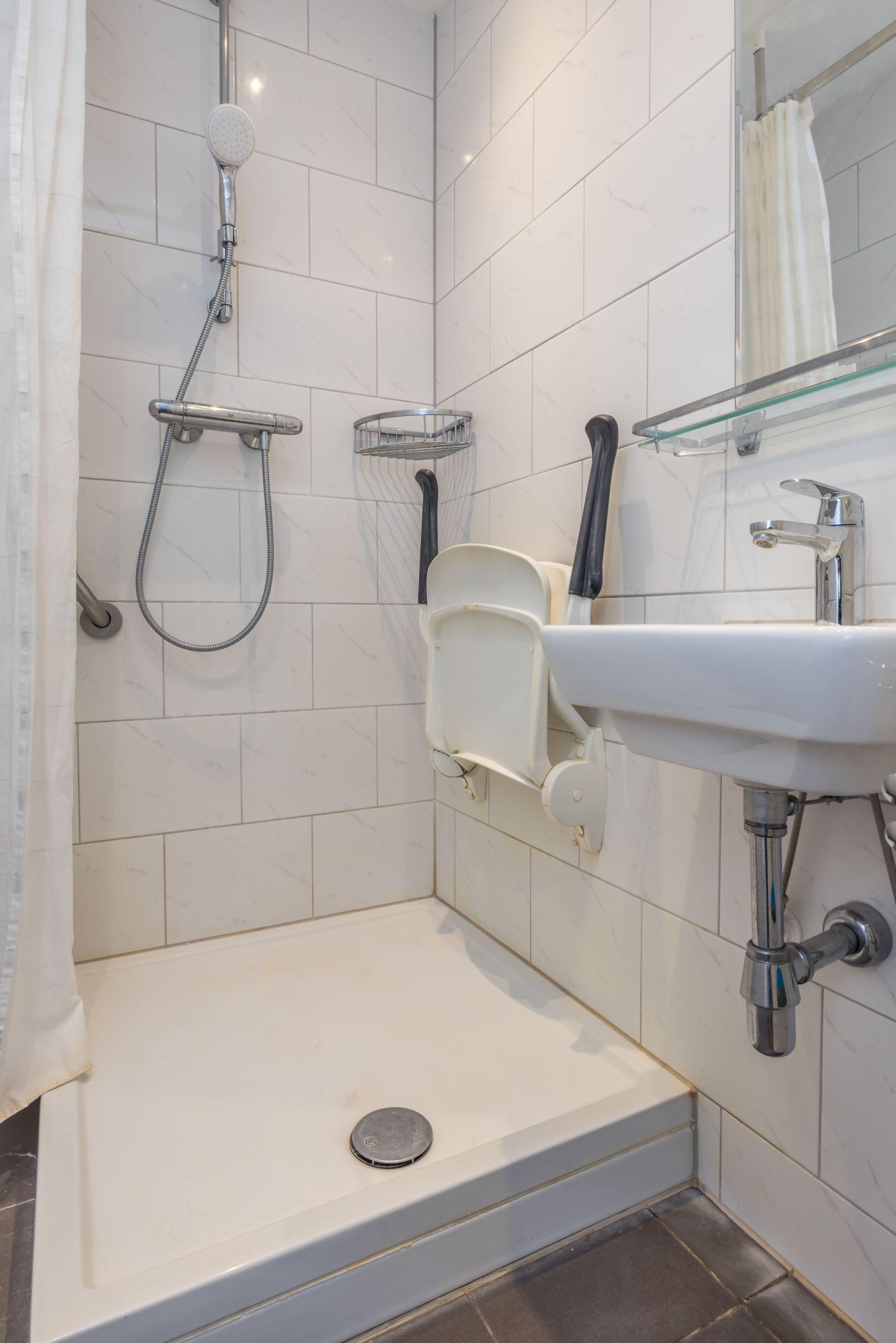 De betegelde badkamer (1,30m x 1,51m) is v.v. een douche en vaste wastafel