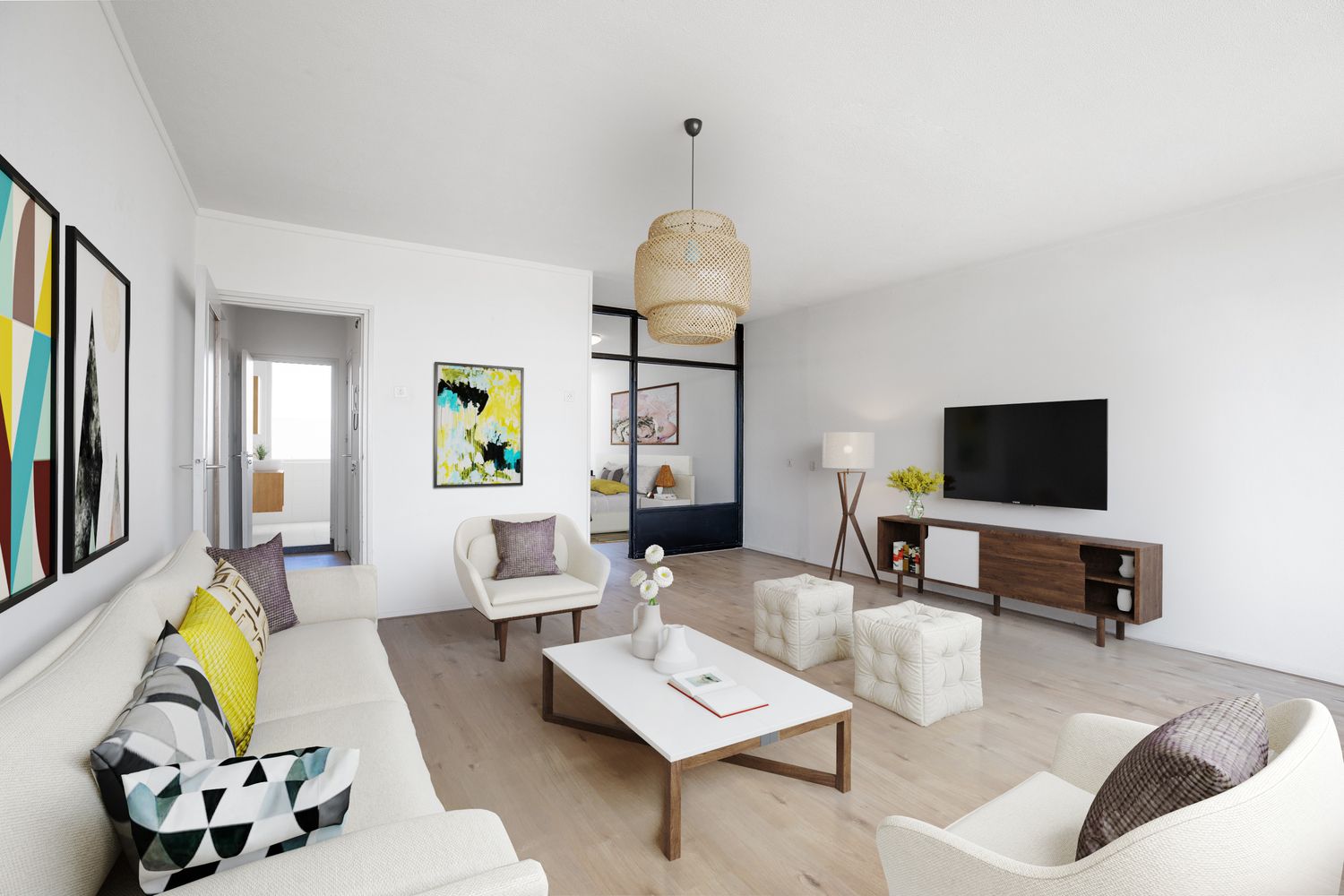 Ruime lichte woonkamer met vrij zicht en toegang tot het balkon. Vanuit woonkamer open verbinding naar keuken met keukeninstallatie met diverse onder- en bovenkasten en inbouwapparatuur.