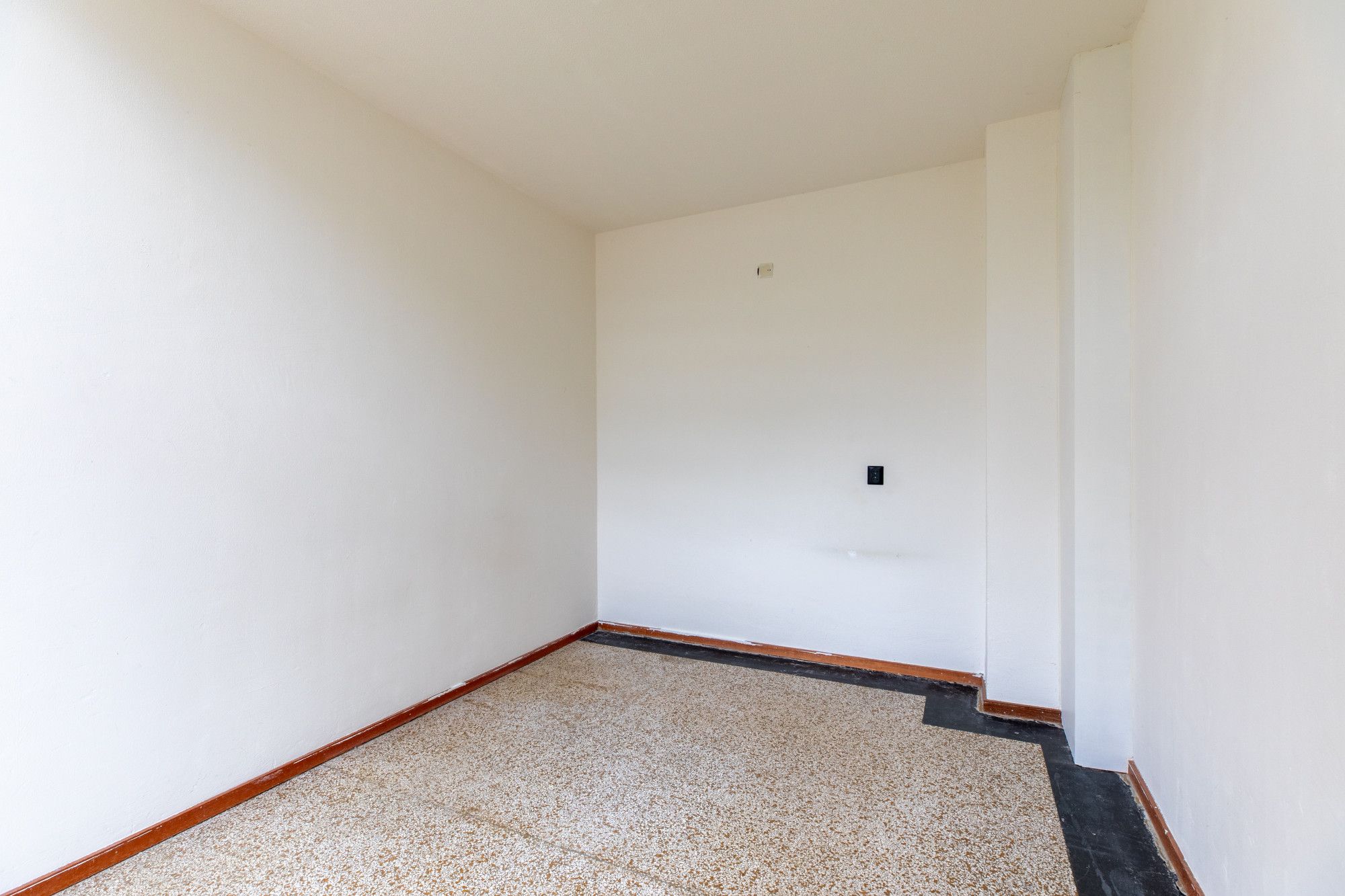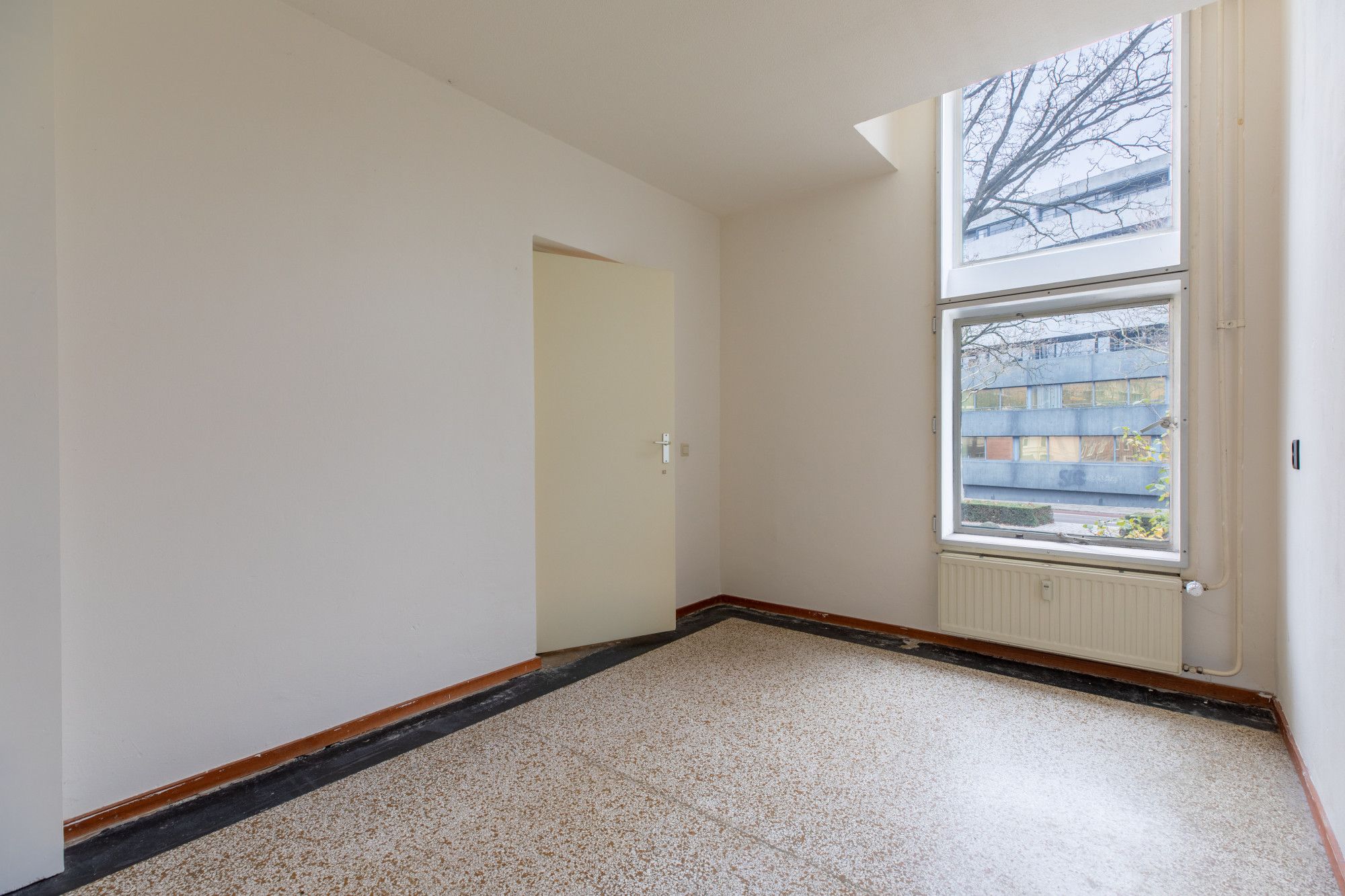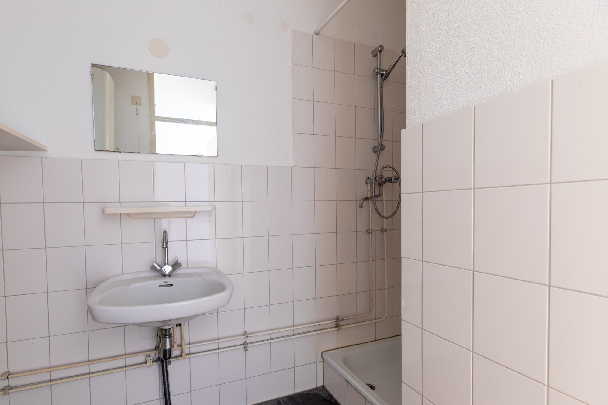 Entree appartement. Woonkamer met ronde erker aan de voorzijde. Open keuken voorzien van een keukenblok. 1 ruime slaapkamer. Toiletruimte met hangend toilet. Badkamer met douche en wastafel.