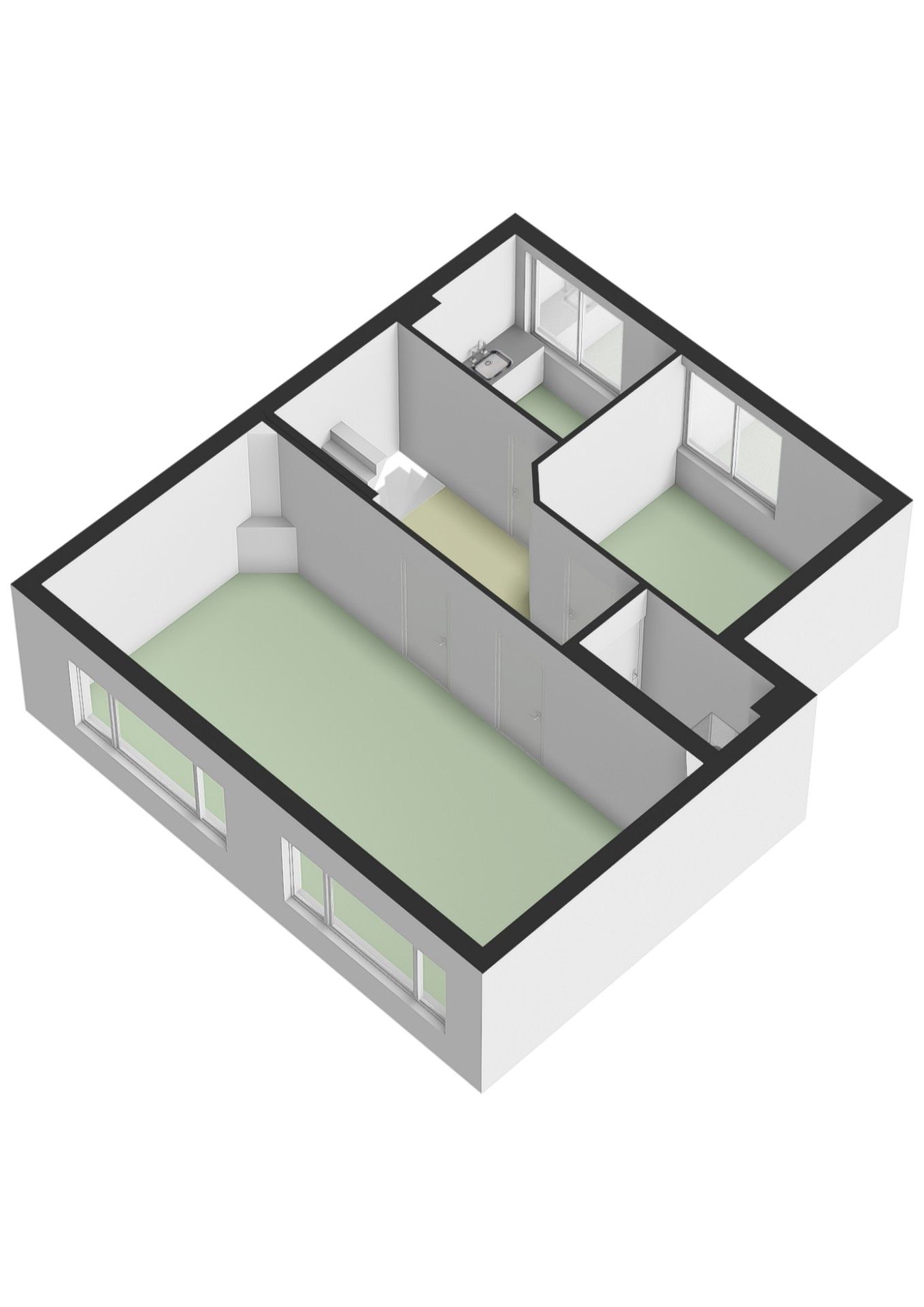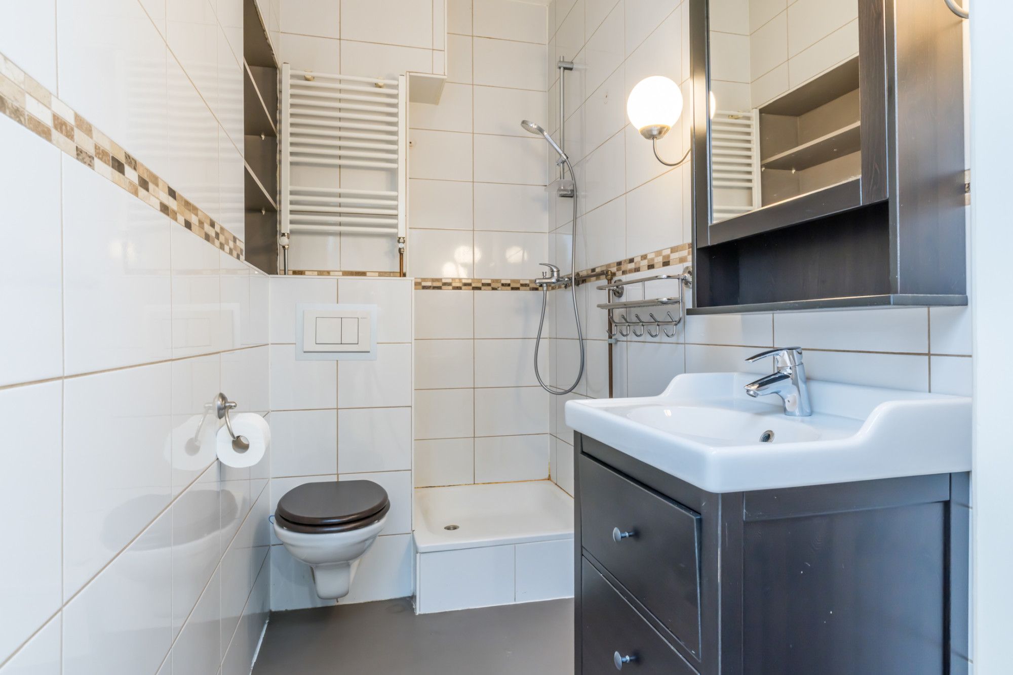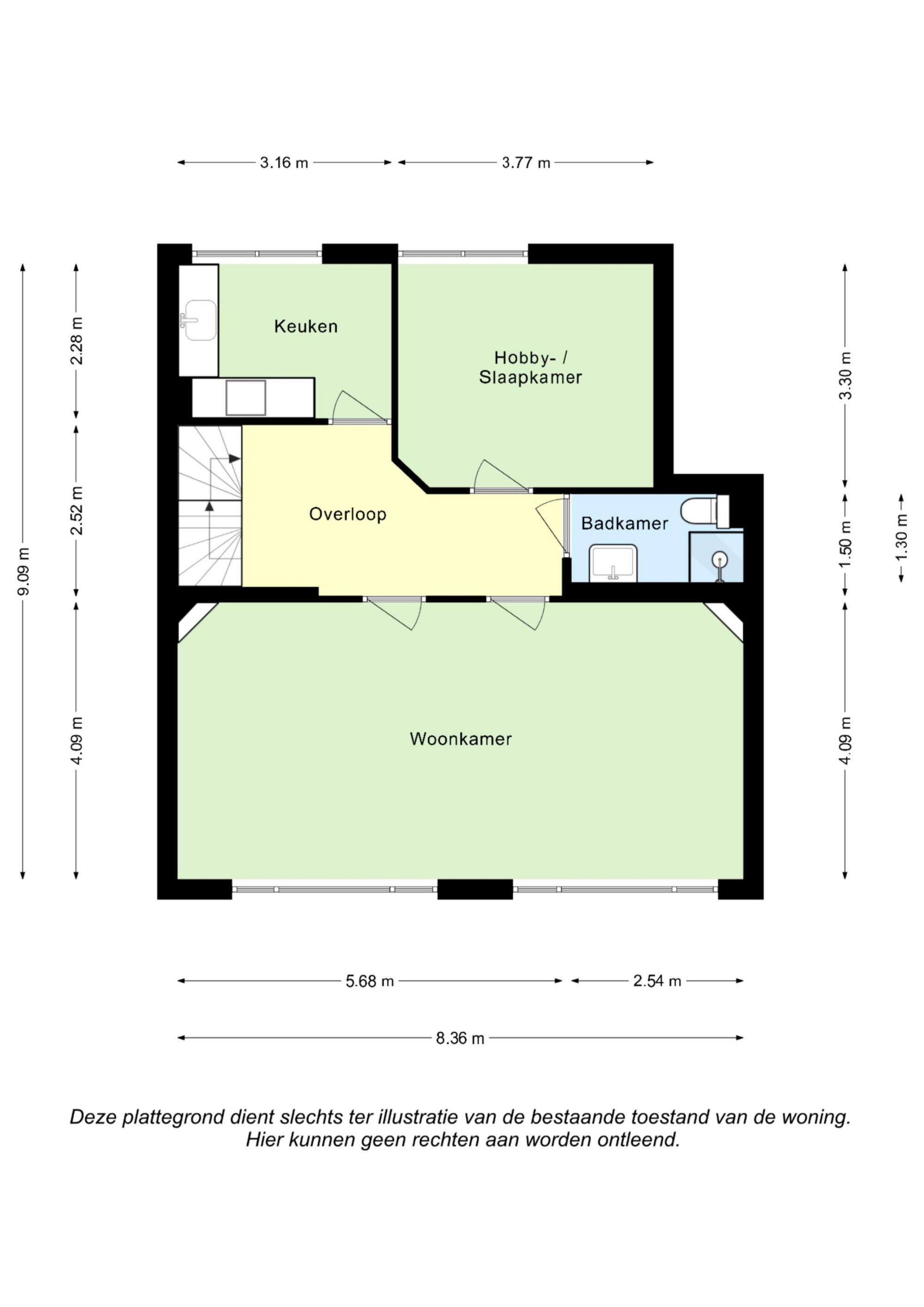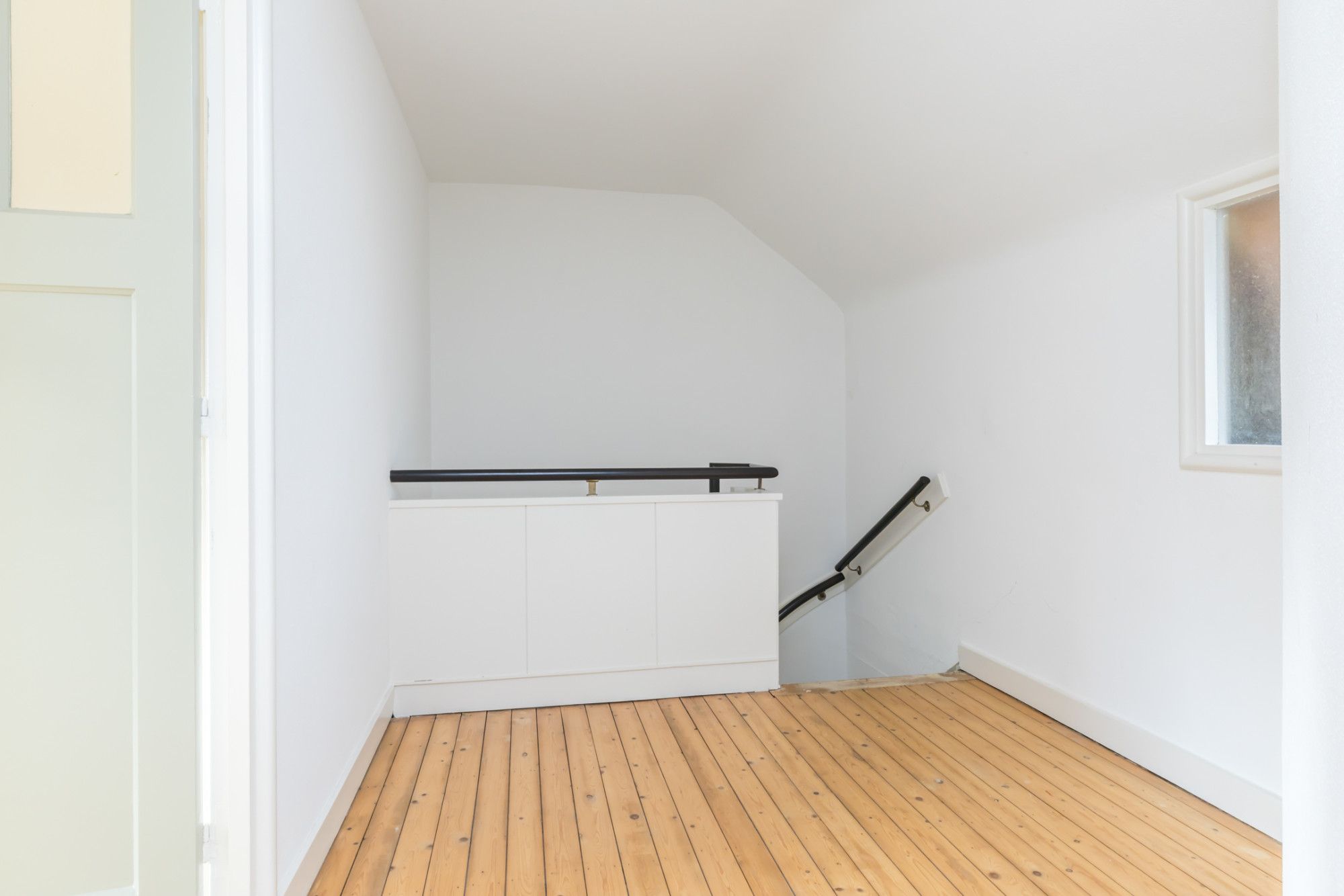 Ruime overloop met toegang tot de royale woonkamer, keuken, slaapkamer/ hobbykamer en badkamer. De woonkamer (8,36 m x 4,09 m) v.v. houtenvloer kenmerkt zich door de vele daglichttoetreding. De gesloten keuken (3,16 m x 2,28 m) is voorzien van een eenvoudig keukenblok met 4-pits gastoestel. Op de eerste verdieping gelegen ruime slaapkamer/ hobbykamer (3,77 m x 3,30 m). Aangrenzend bevindt zich de badkamer (2,54 m x 1,50 m ) met douche, wastafel en toilet.