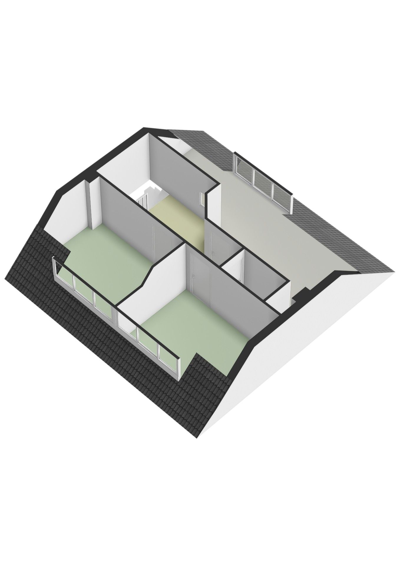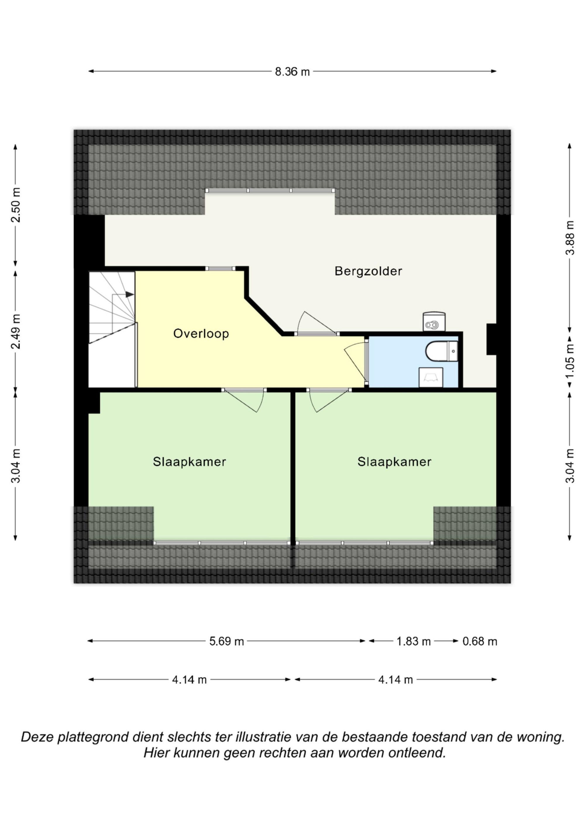 Overloop met toegang tot 2 slaapkamers, bergzolder en separate toiletruimte v.v. toilet en wastafel. Slaapkamer I (4,14 m x 3,04 m) en slaapkamer II (4,14 m x 3,04 m). De ruime bergzolder is ca. 15 m2