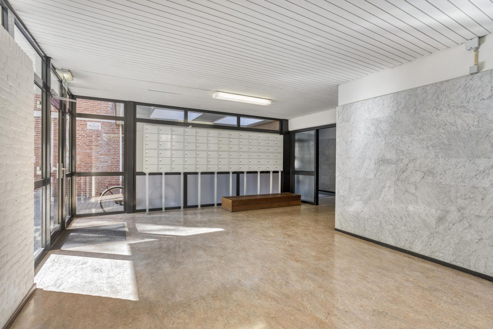 Hoofdingang met bellentableau, brievenbussen en toegang tot zowel het trappenhuis als de lift. Verder beschikt de woning hier over een eigen berging (7 m²) - perfect voor opslag! - en is er een gezamenlijke, afgesloten, inpandige fietsenstalling zodat uw fiets altijd droog en veilig is.