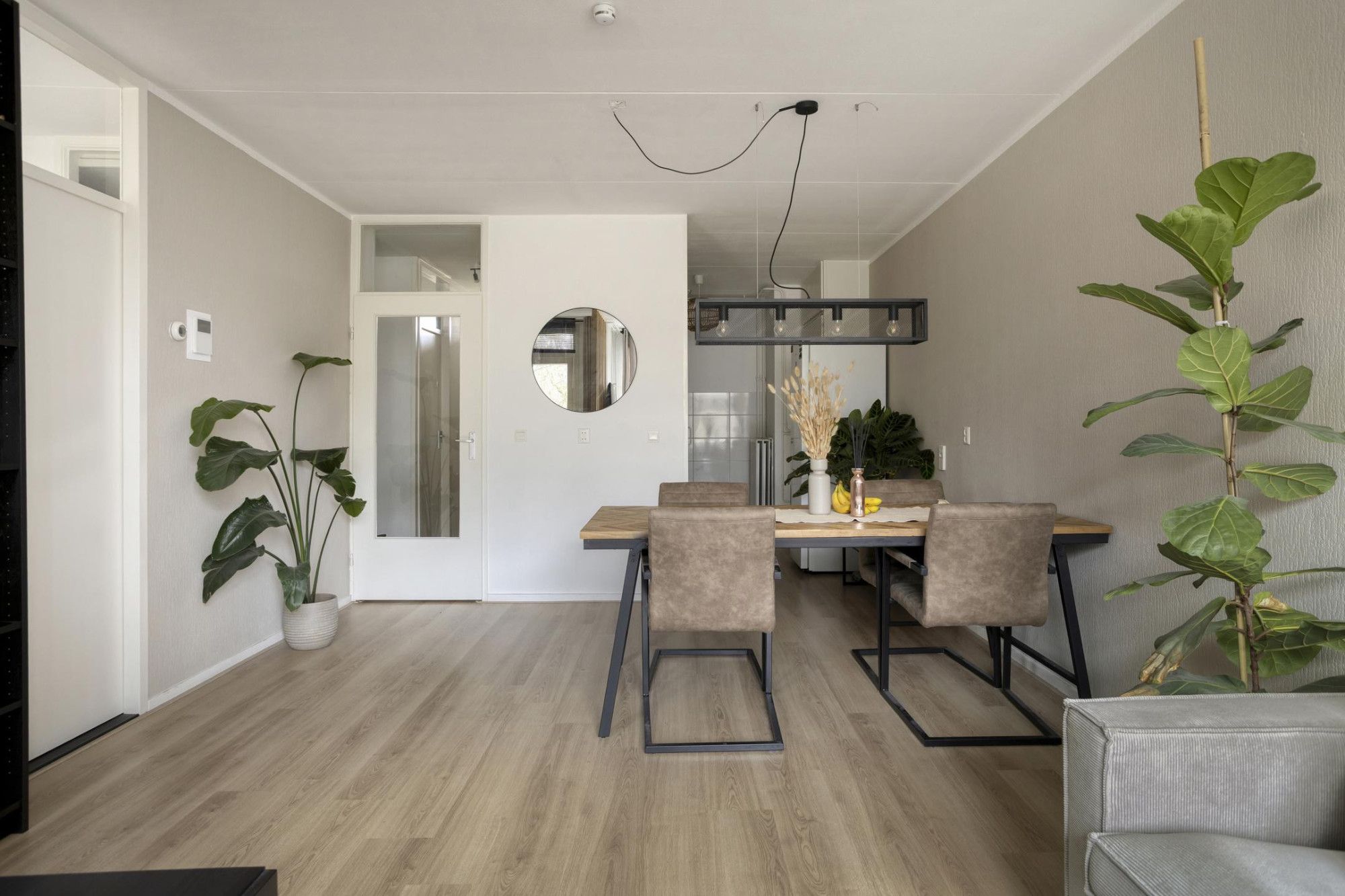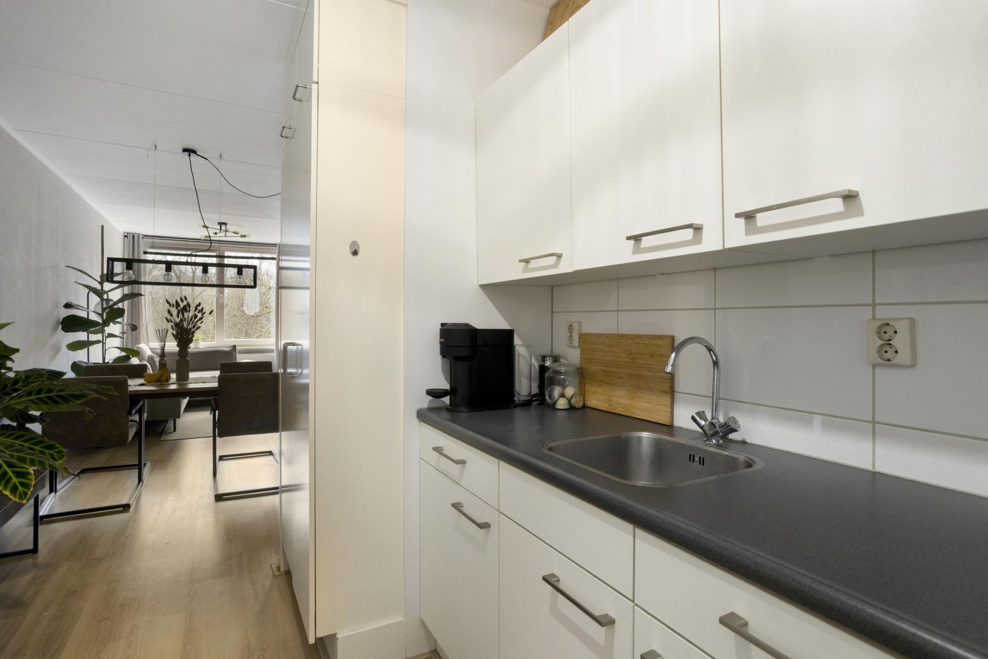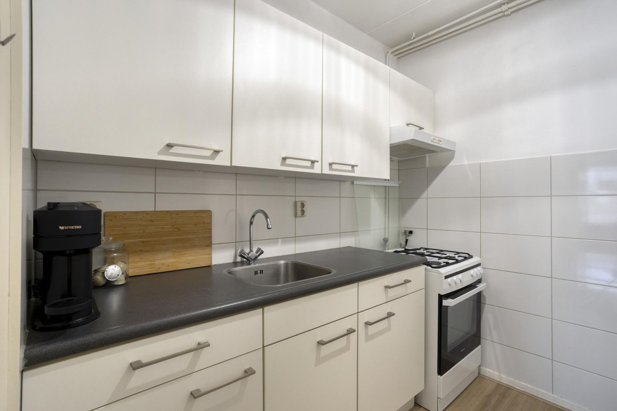 - De (semi-)open keuken is recentelijk vernieuwd en beschikt over een gasfornuis met oven, afzuigkap en veel kastruimte. In een van die muurkasten bevindt zich de CV-installatie.
