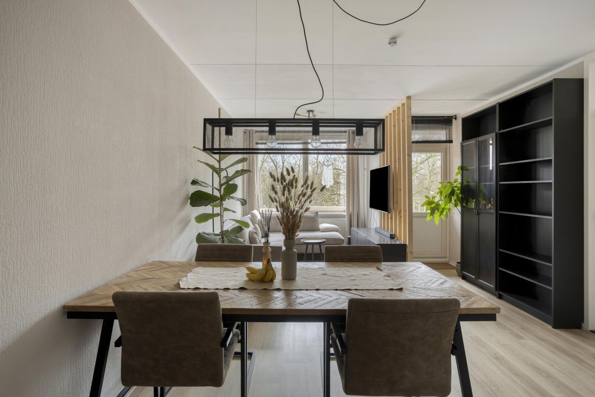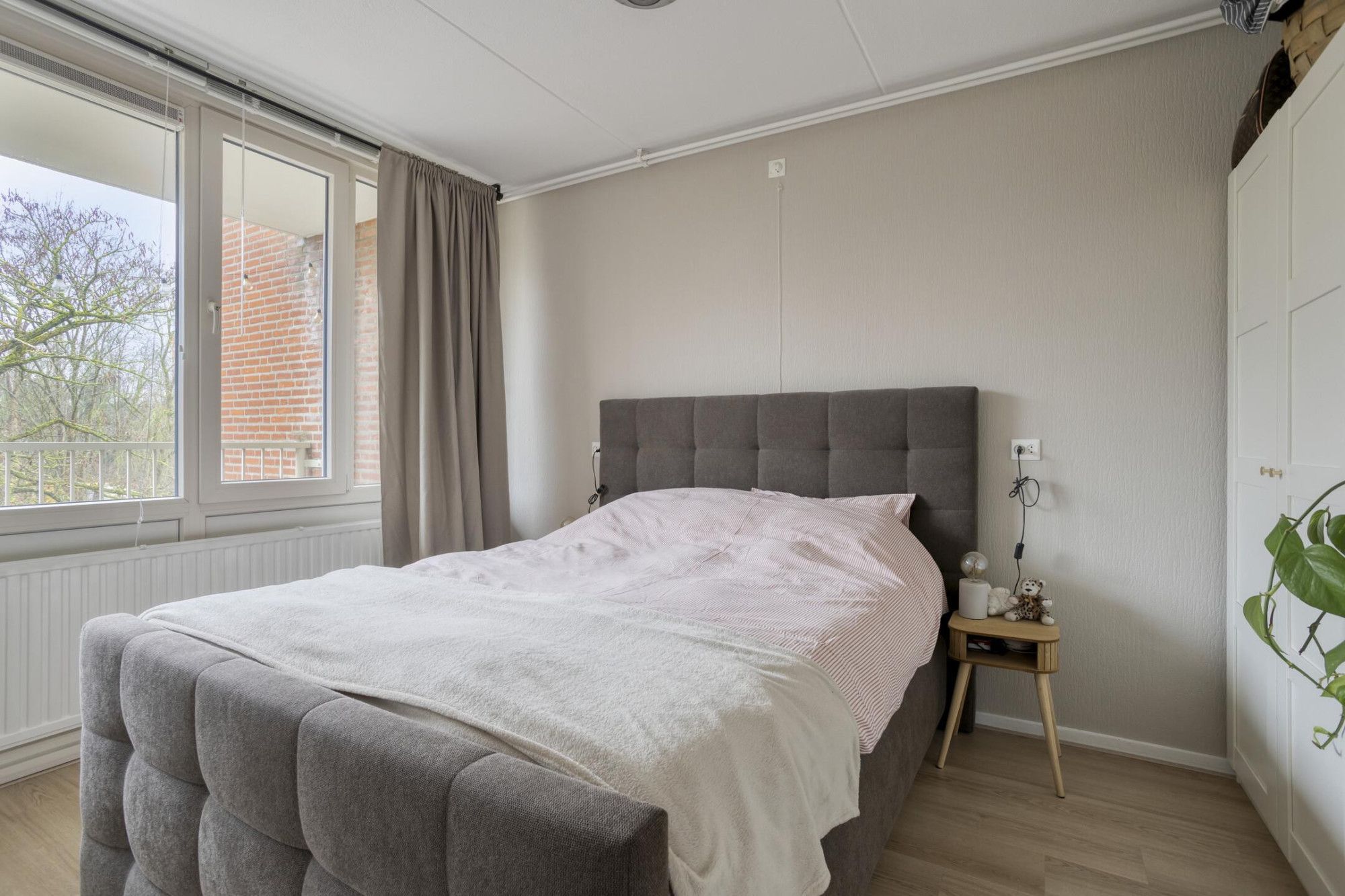 - De lichte woonkamer, met uitzicht op het groen, biedt toegang tot het (deels) aangesloten balkon.
