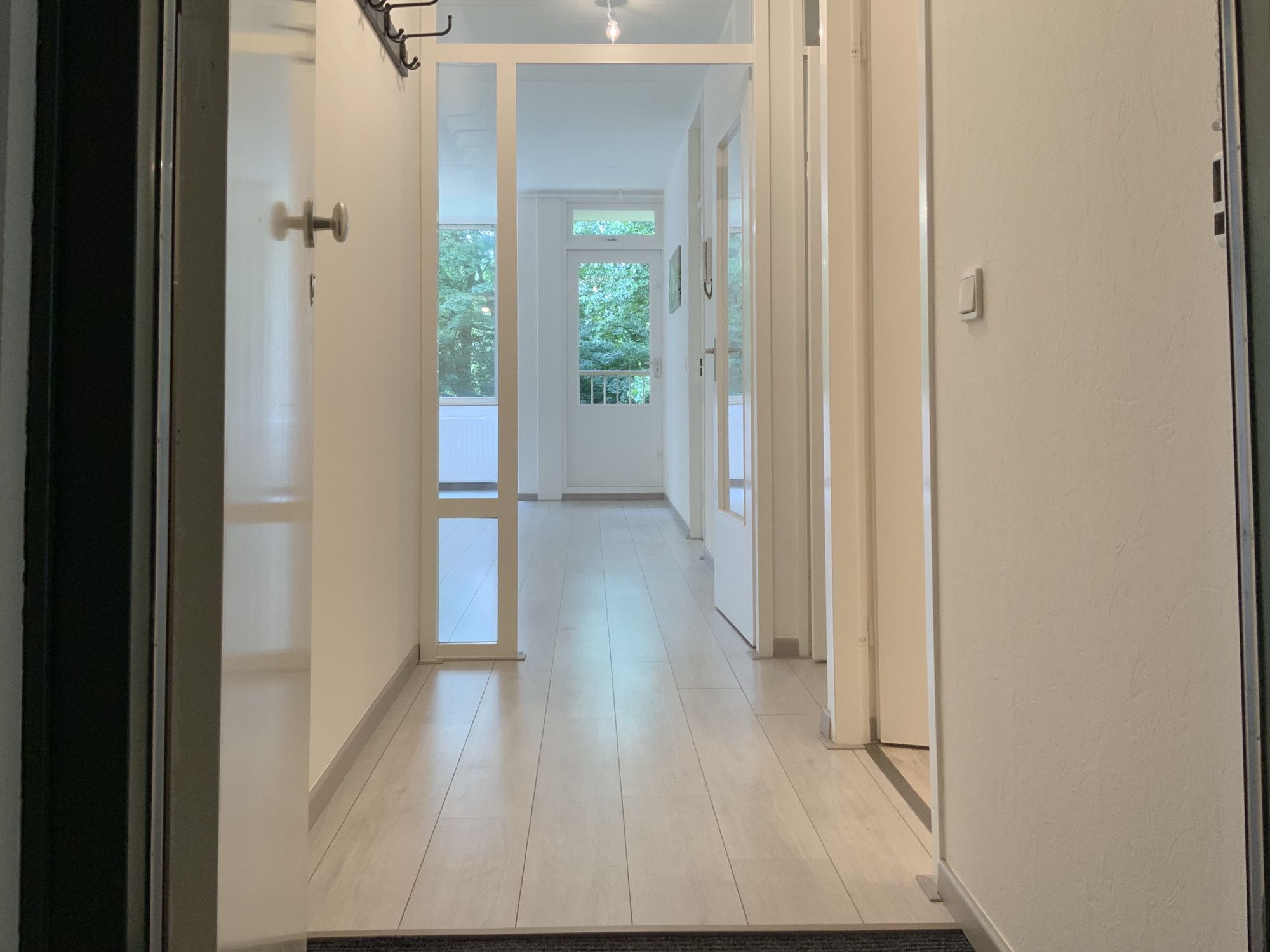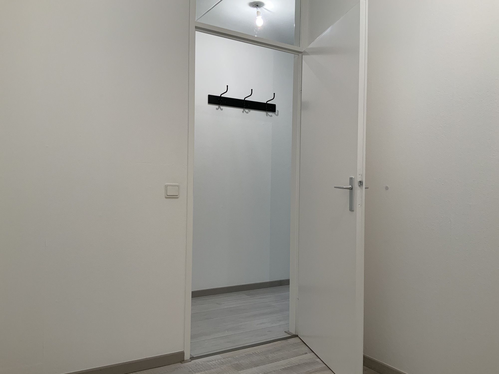 Hal met laminaatvloer en toegang tot het toilet en een slaap-hobbykamer.