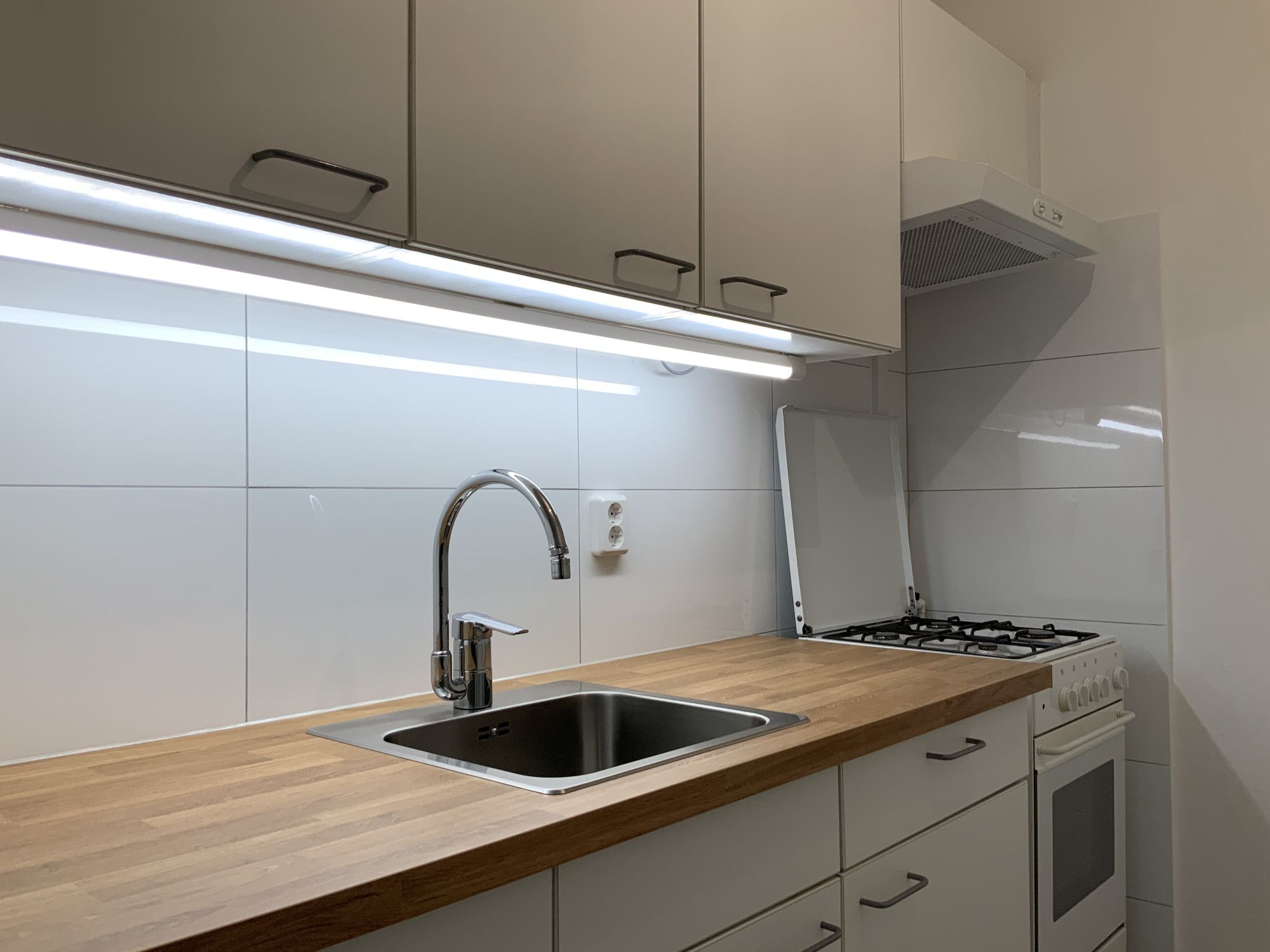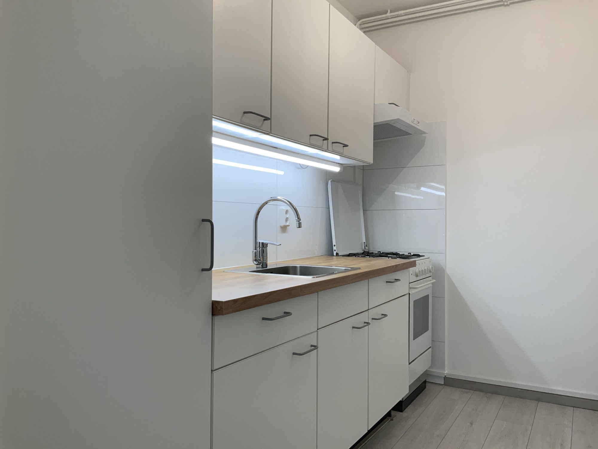 De open keuken (ca. 3,03 x 1,96 m) beschikt over een gaskookplaat, oven en vaatwasser.