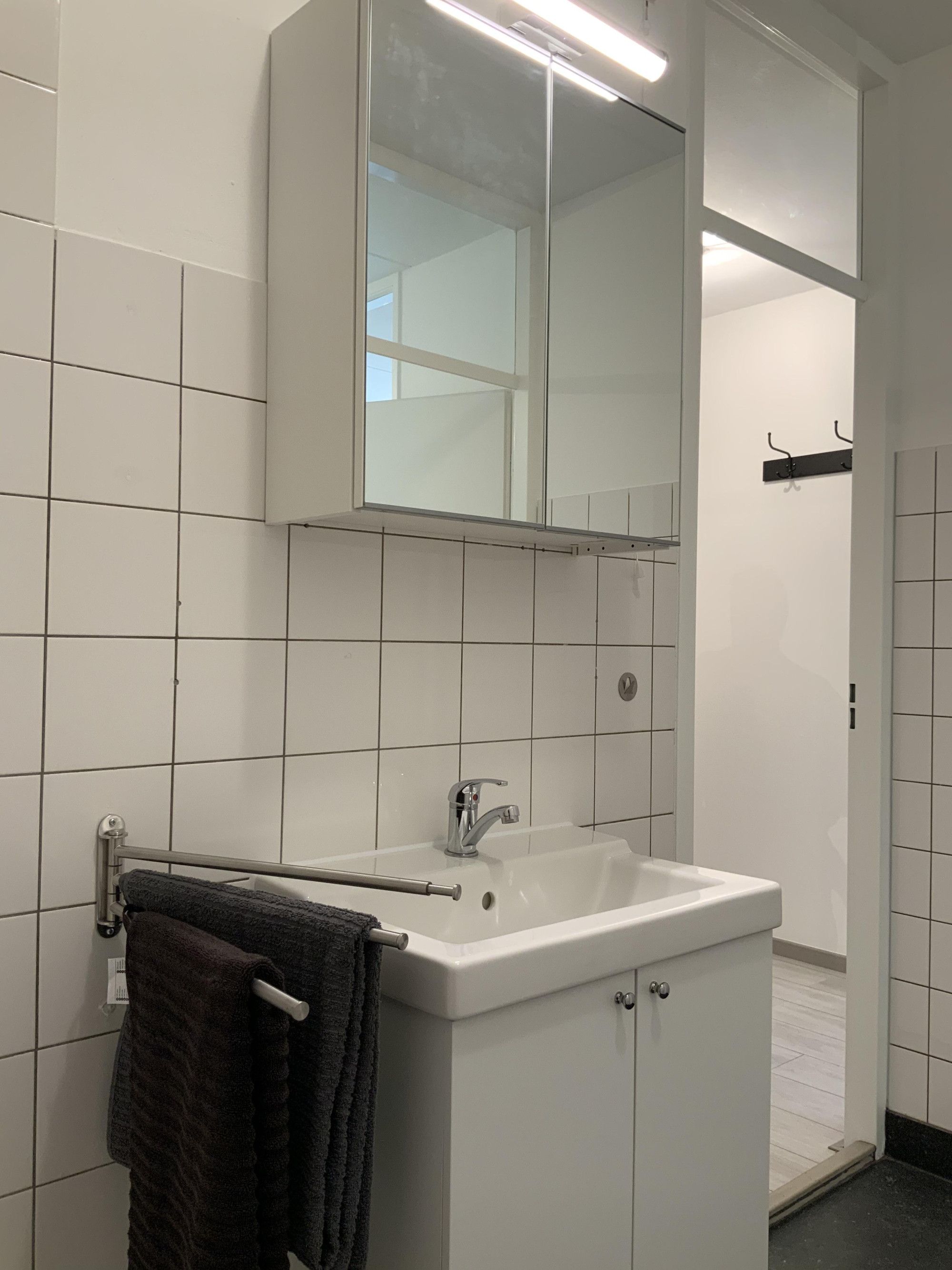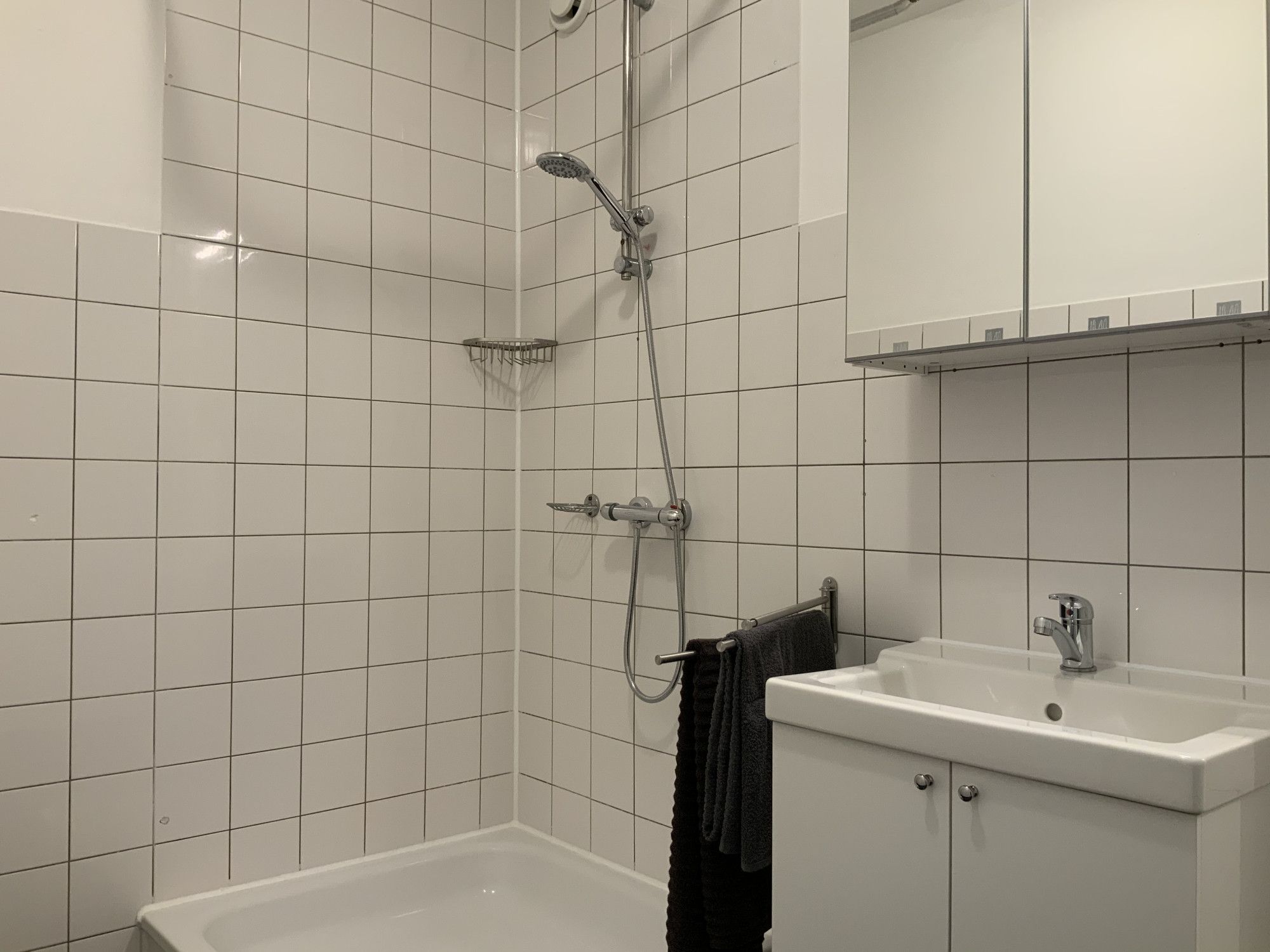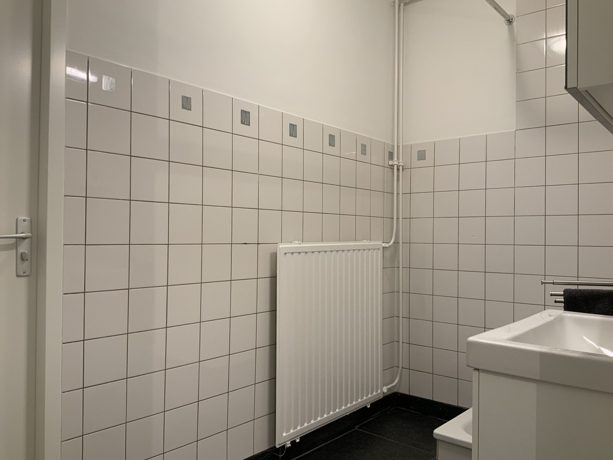 De volledig betegelde badkamer (ca. 2,90 x 1,60 m) is voorzien van een douche en vaste wastafel met bovenkast en verlichting.