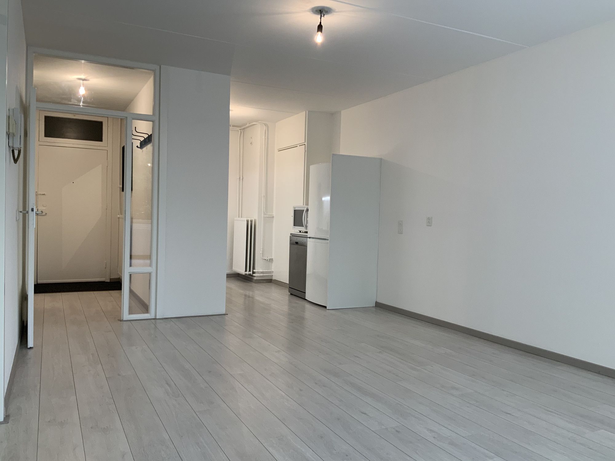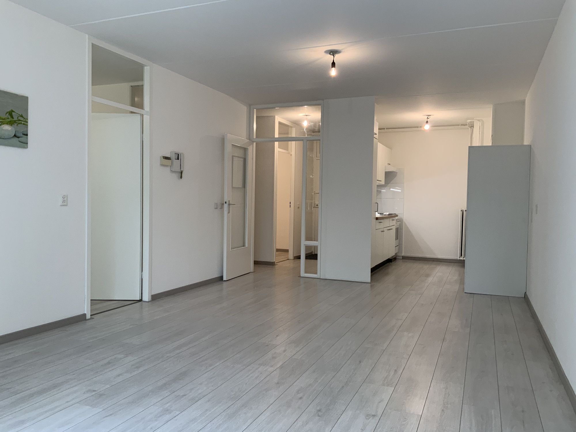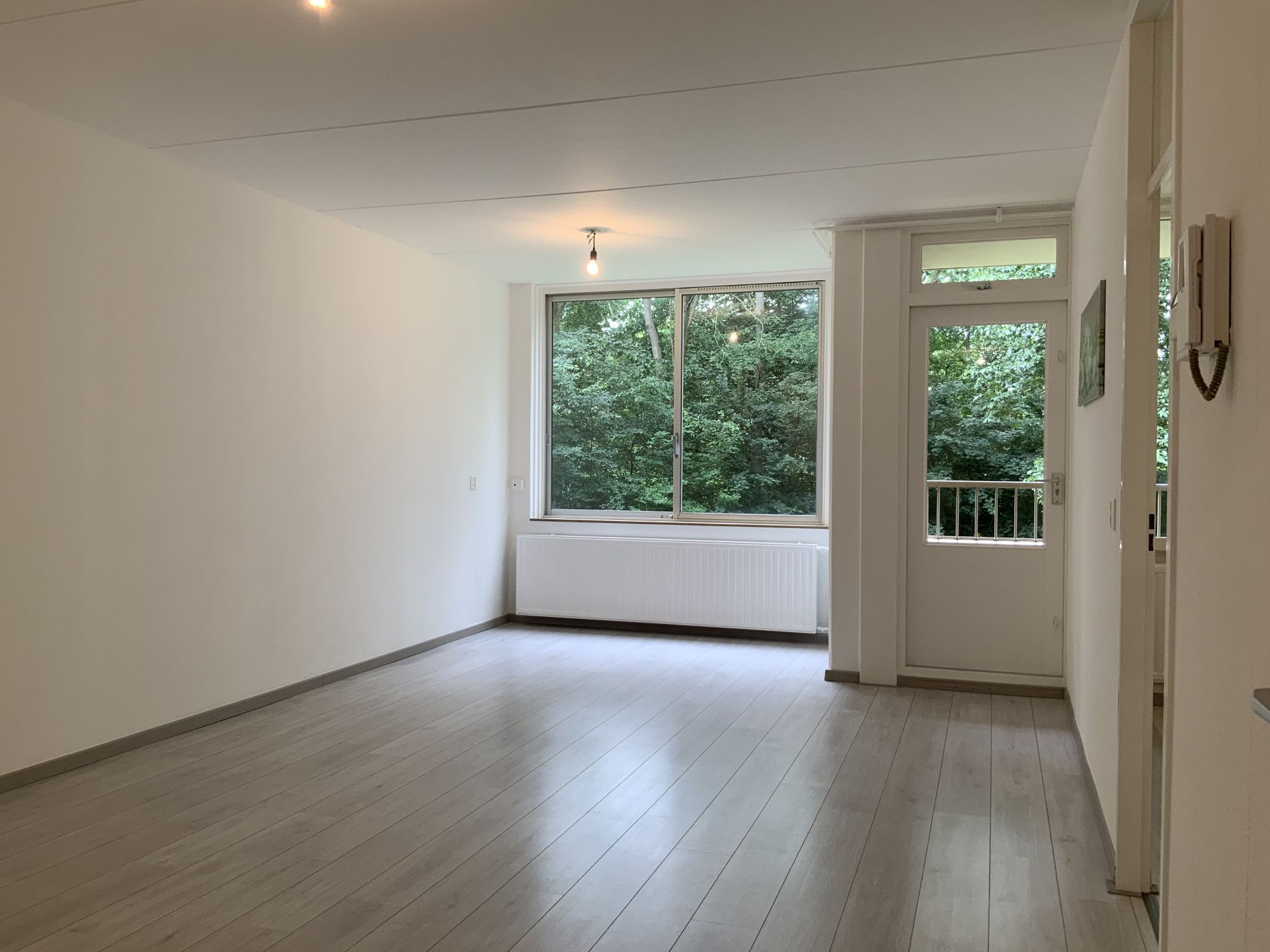 De woonkamer (ca. 7,00 x 3,20 m) is voorzien van een laminaatvloer en biedt toegang tot de open keuken, slaapkamer en het balkon.