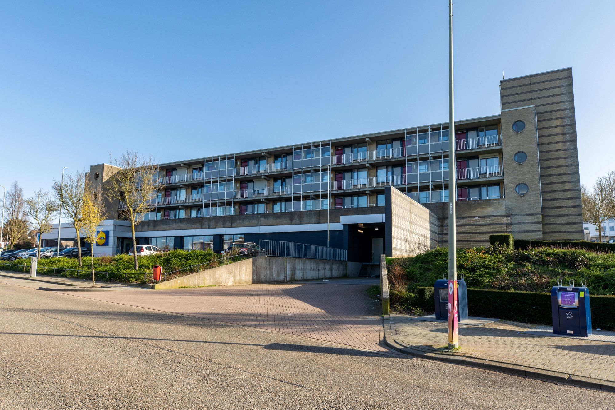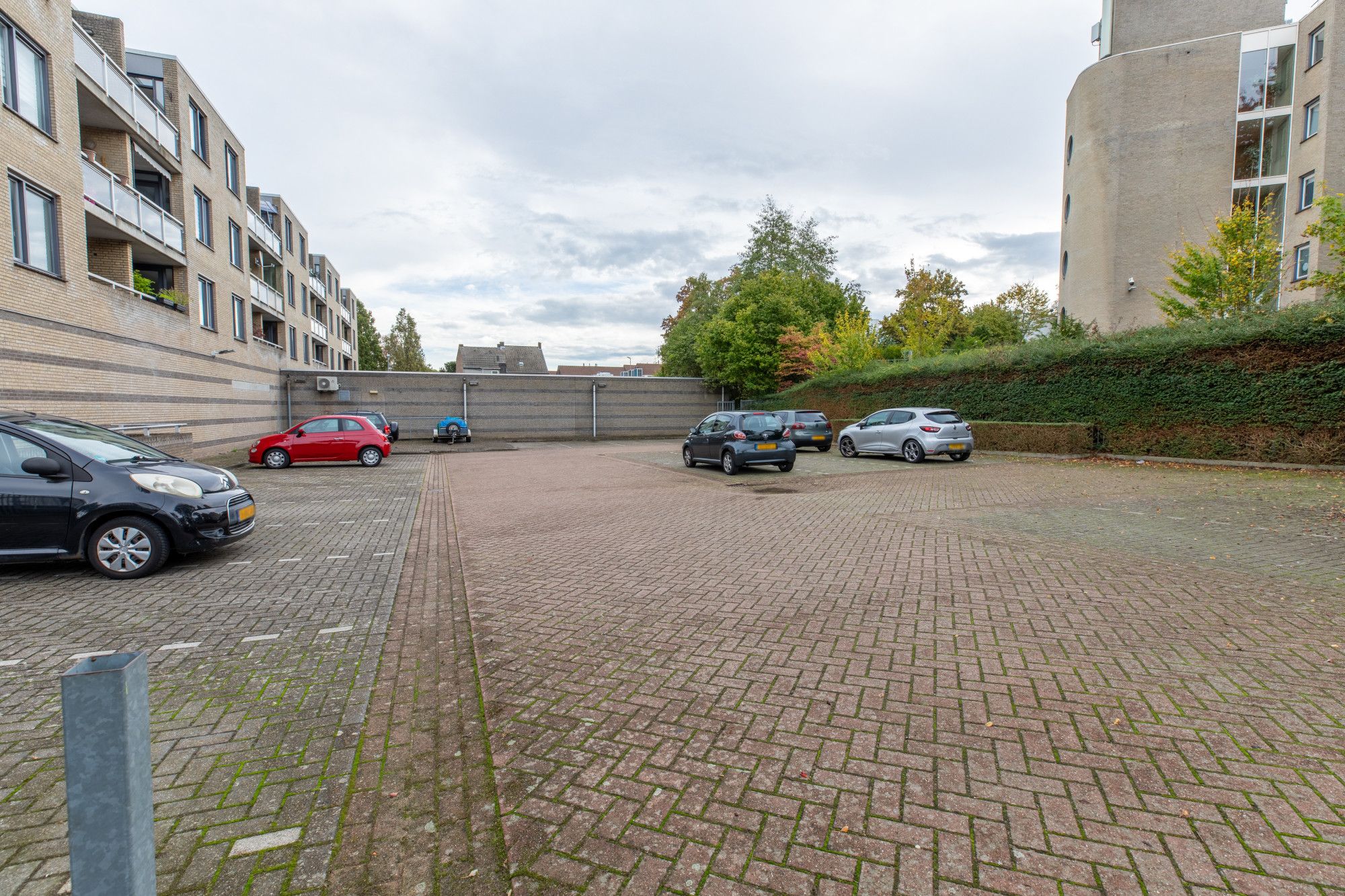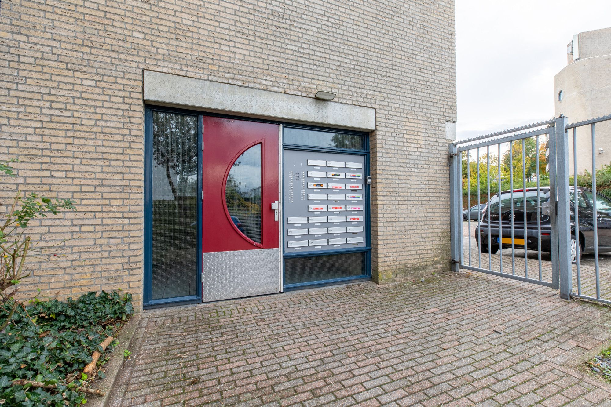 Centrale entreehal met brievenbussen, bellentableau, intercominstallatie, trappenhuis en liftinstallatie; parkeerplaats op afgesloten parkeerterrein.
