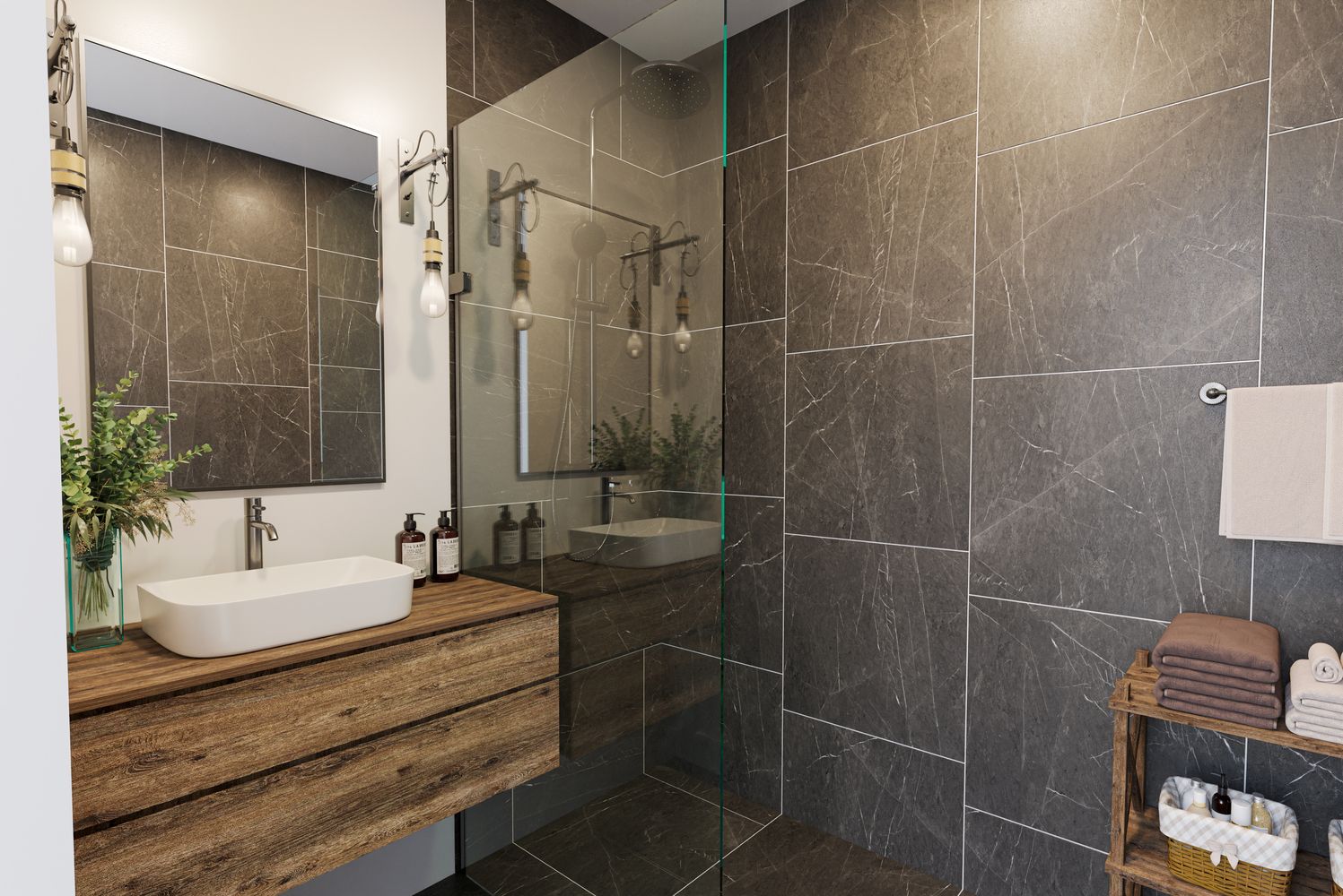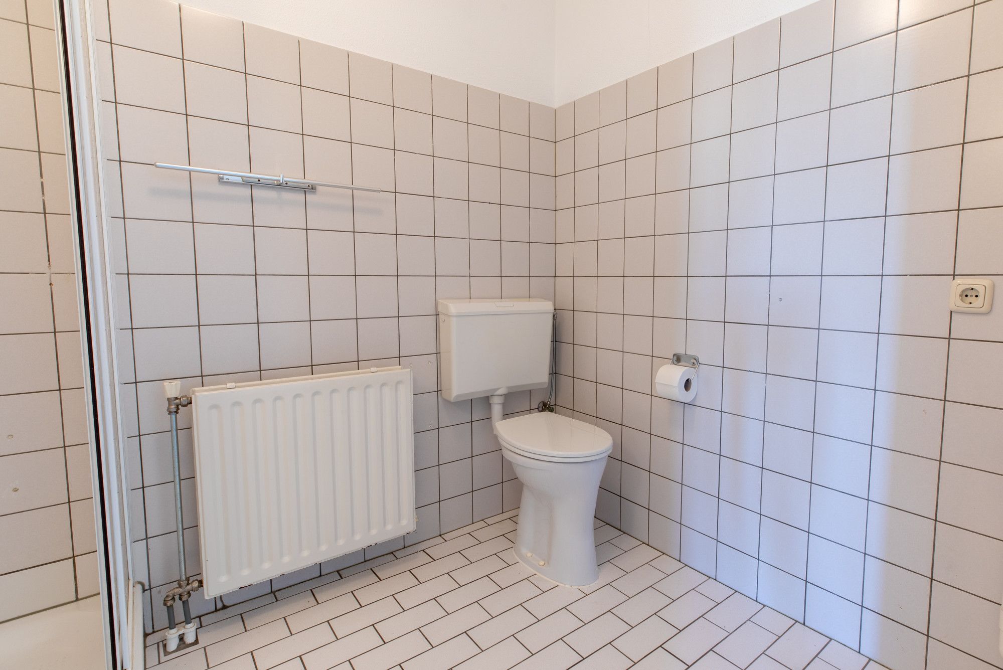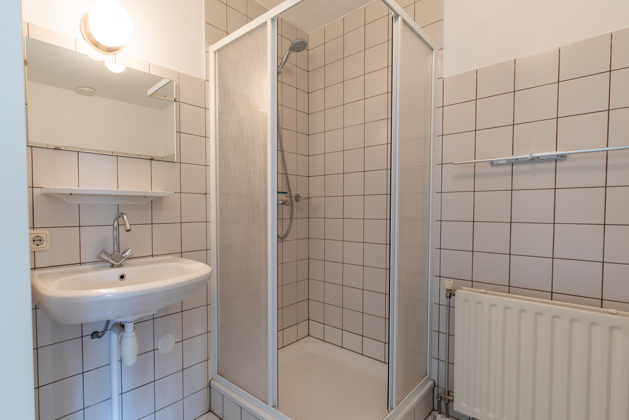 Badkamer met douche, vaste wastafel, toilet en witgoed aansluiting.