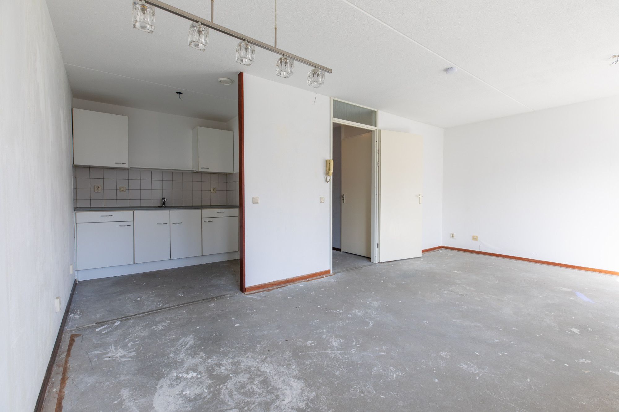 Woonkamer in open verbinding met keuken met eenvoudige keukeninstallatie; vanuit de woonkamer toegang tot het zonnig gelegen balkon.