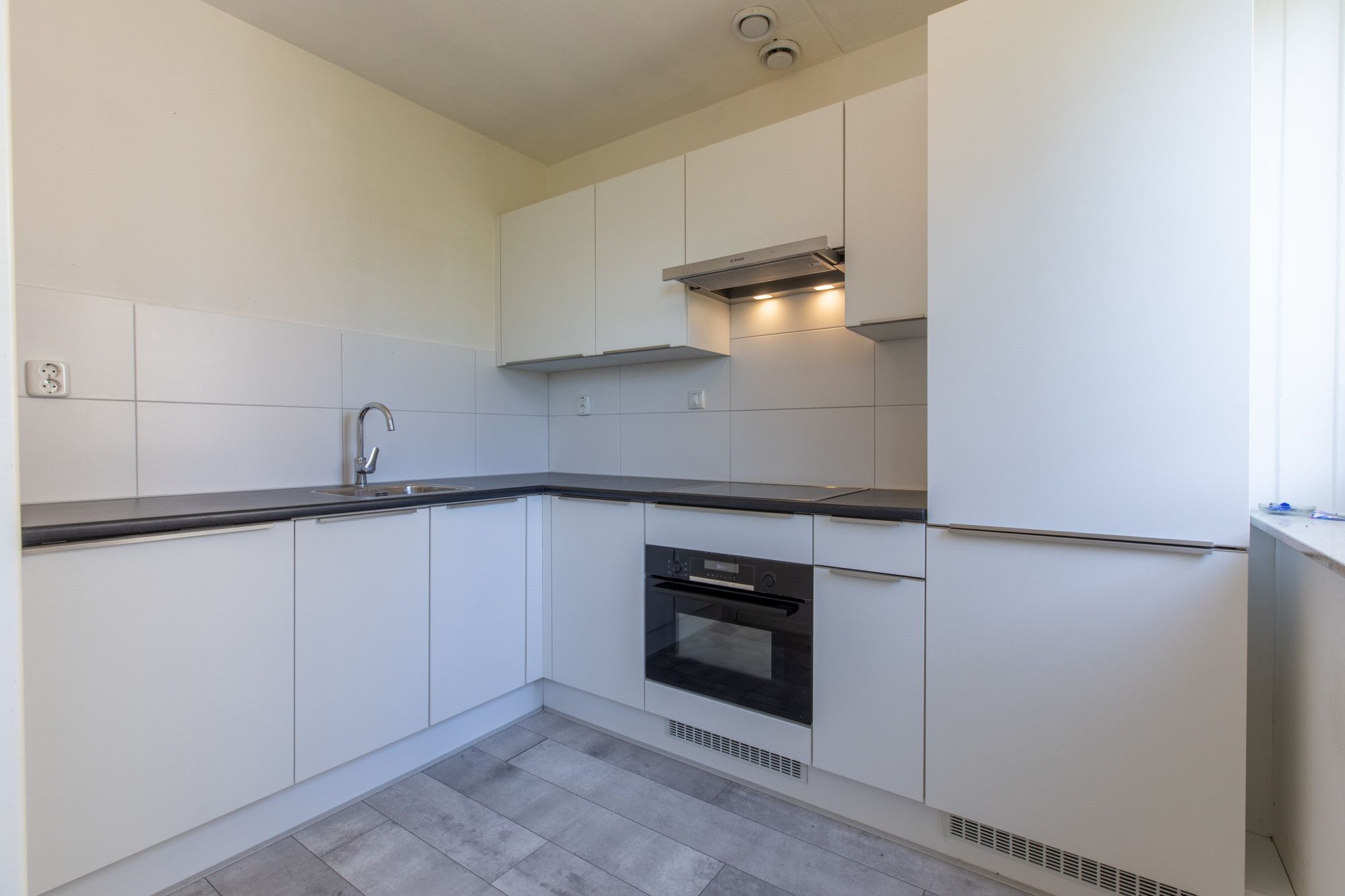 Woonkamer (5.67 x 6.09/4.95 m - totaal circa 32 m²) met toegang tot het balkon; half-open keuken met keuken installatie in hoekopstelling met diverse onder- en bovenkasten en diverse inbouwapparatuur
