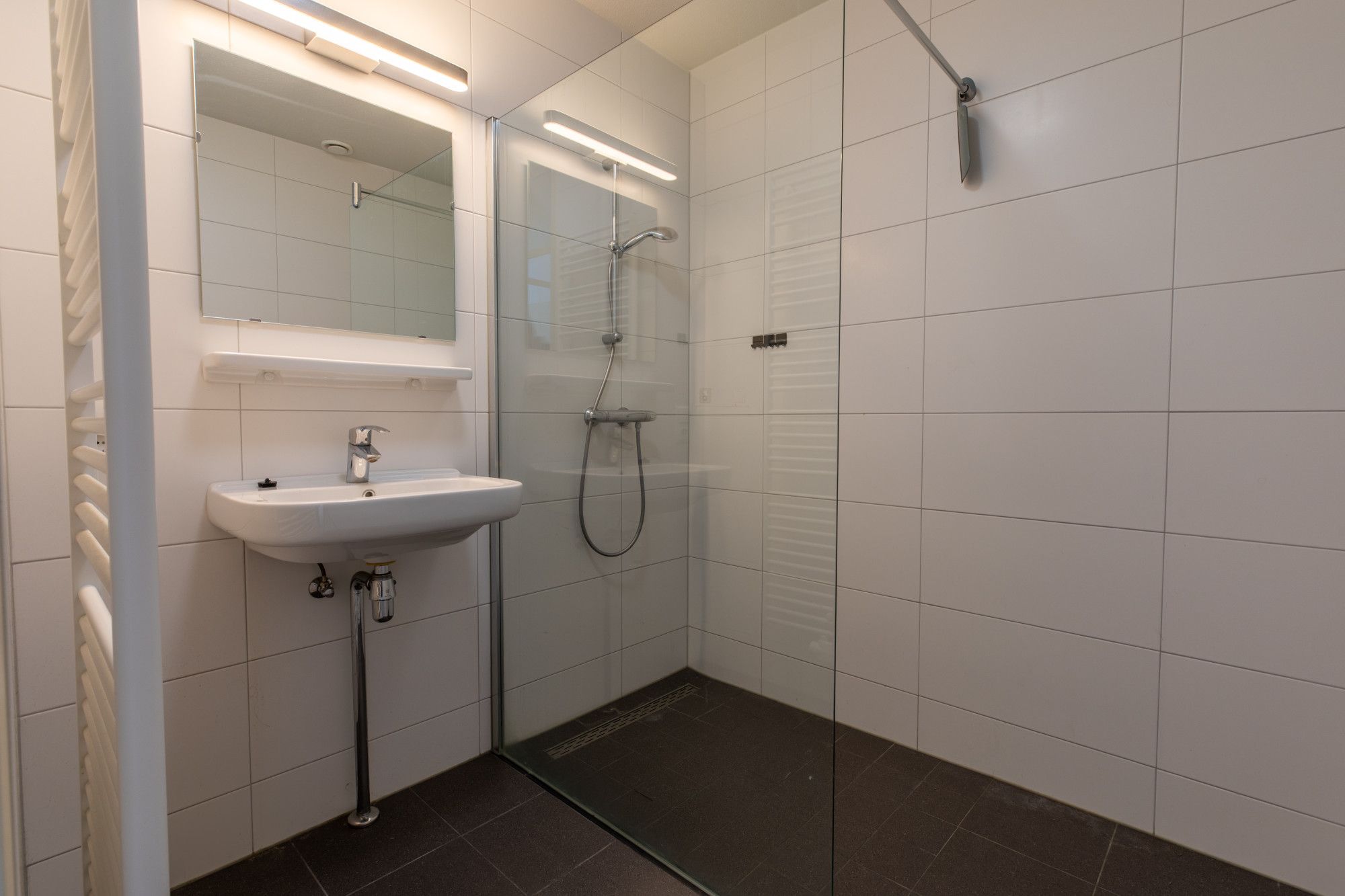 Geheel betegelede badkamer (2.04 x 1.92 m) met inloopdouche en wastafel