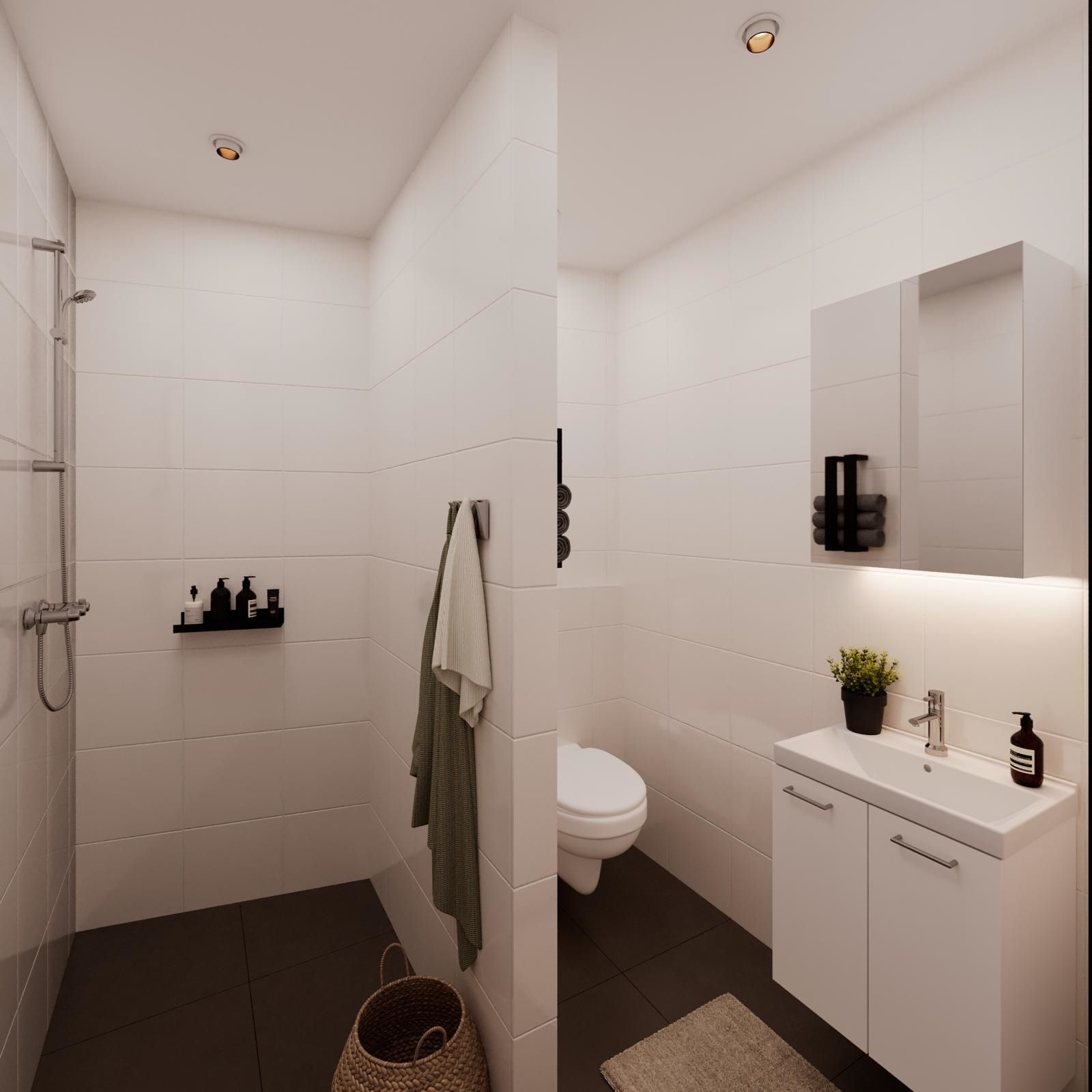 voorzien van een eigen badkamer met douche, toilet en wastafel, compleet