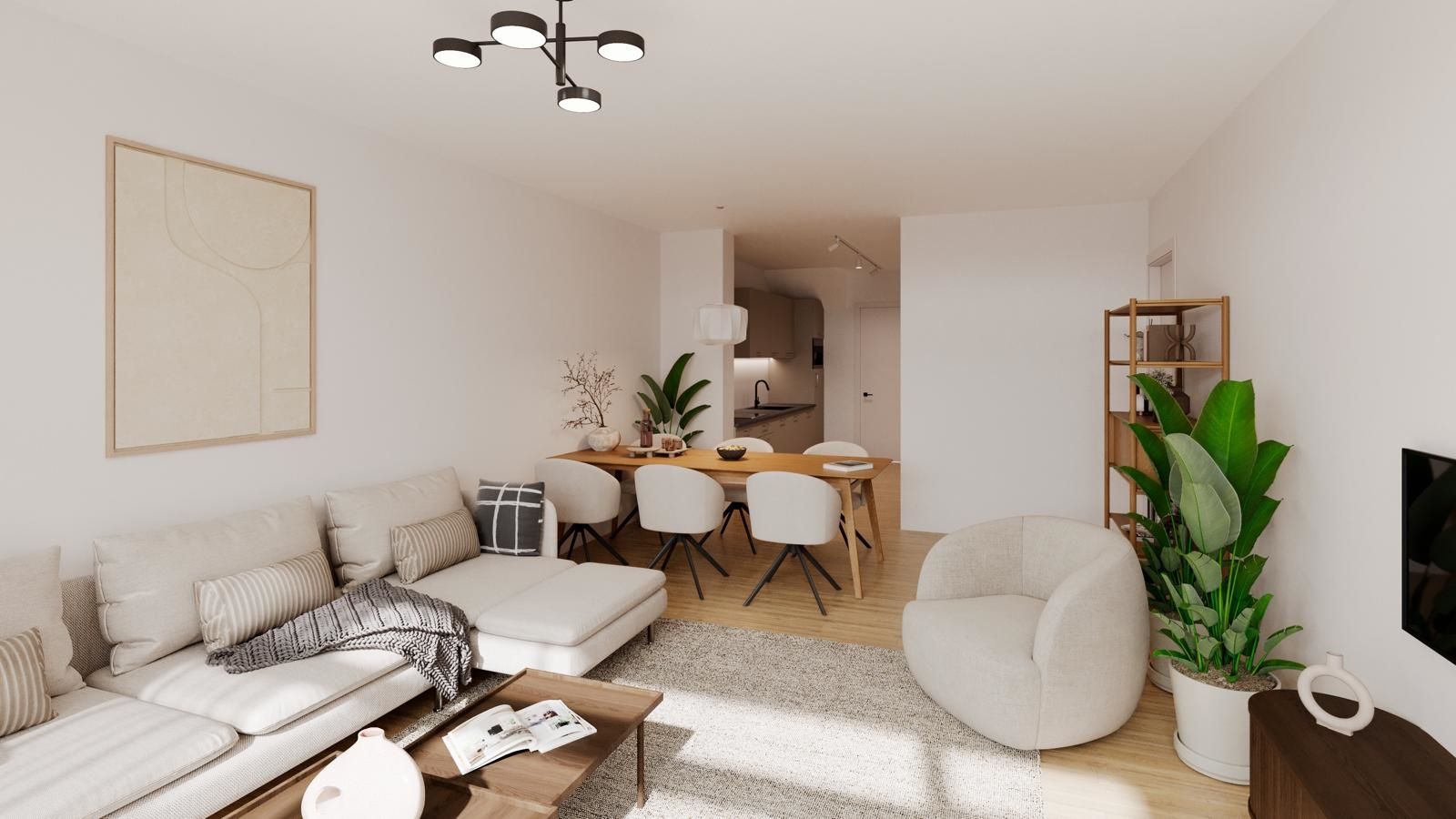 De woonkamer en keuken vormen het gezamenlijke hart van de woning. De lichte