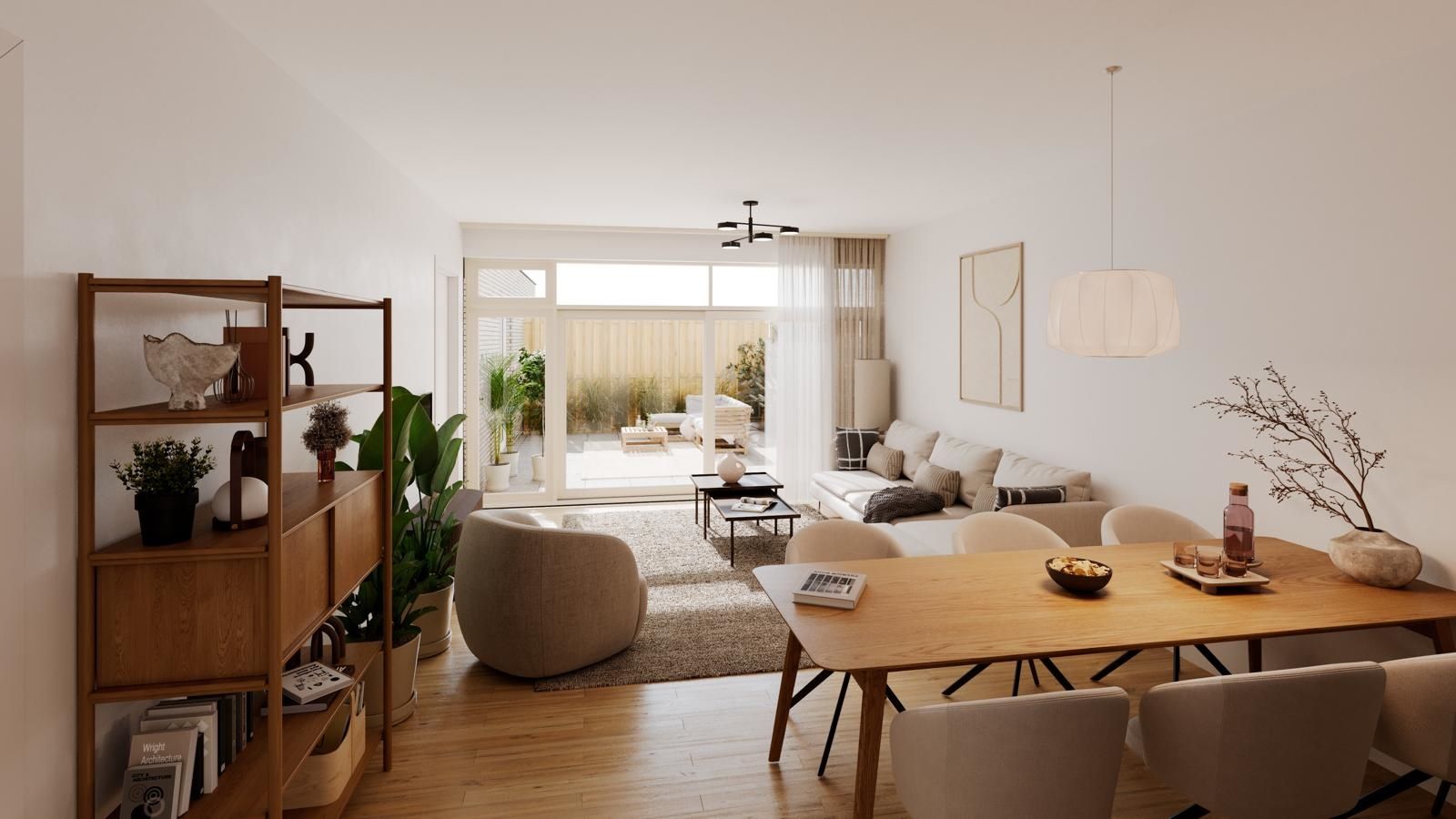 woonkamer is voorzien van een grote schuifpui die direct toegang geeft tot de tuin en