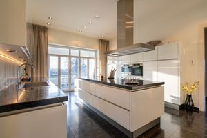 The gripless custom kitchen is fully equipped with Miele appliances and features a kitchen island, induction cooktop, quooker, 2 sinks, built-in coffee maker, oven, microwave, hood and recessed spotlights.